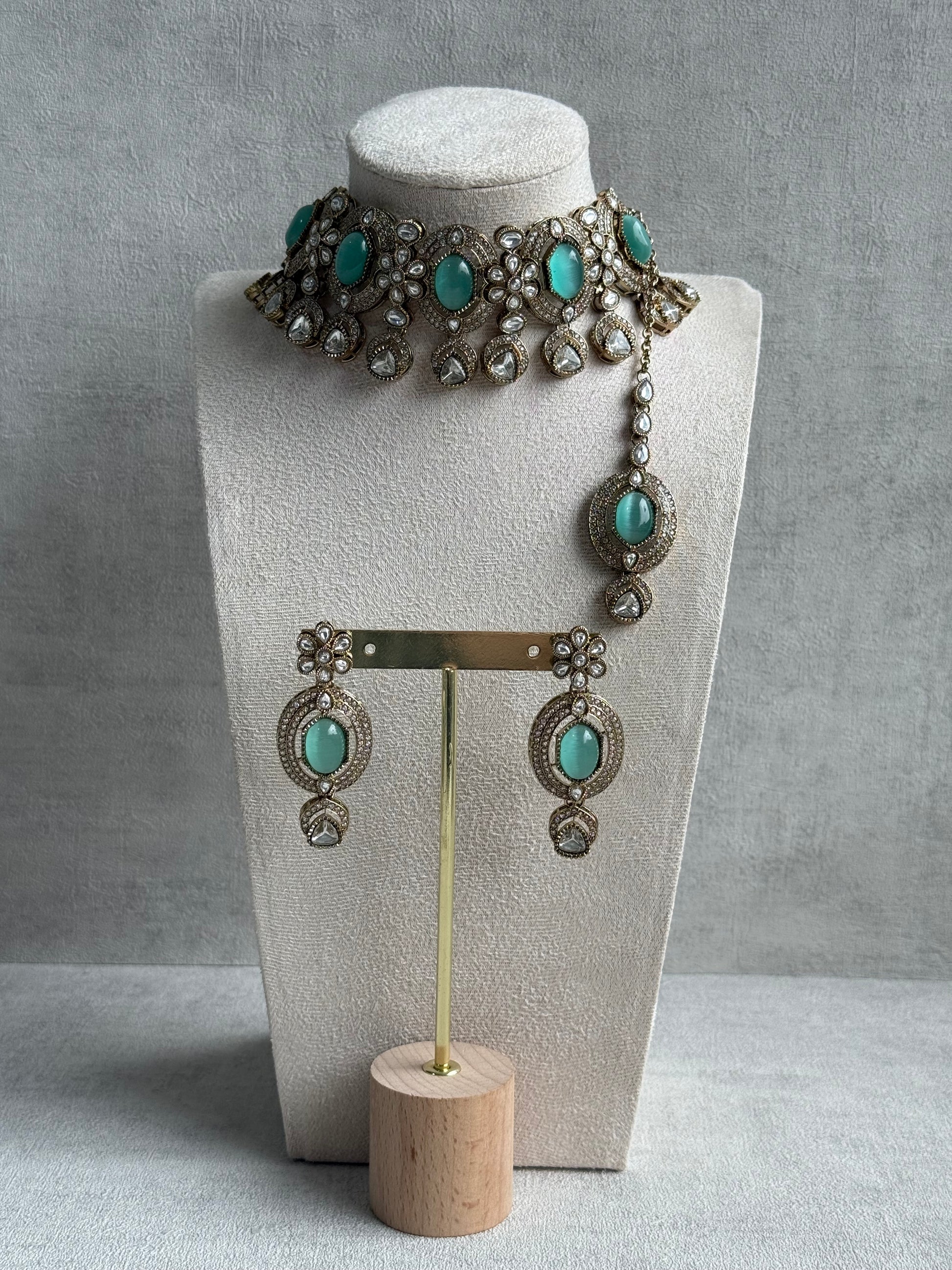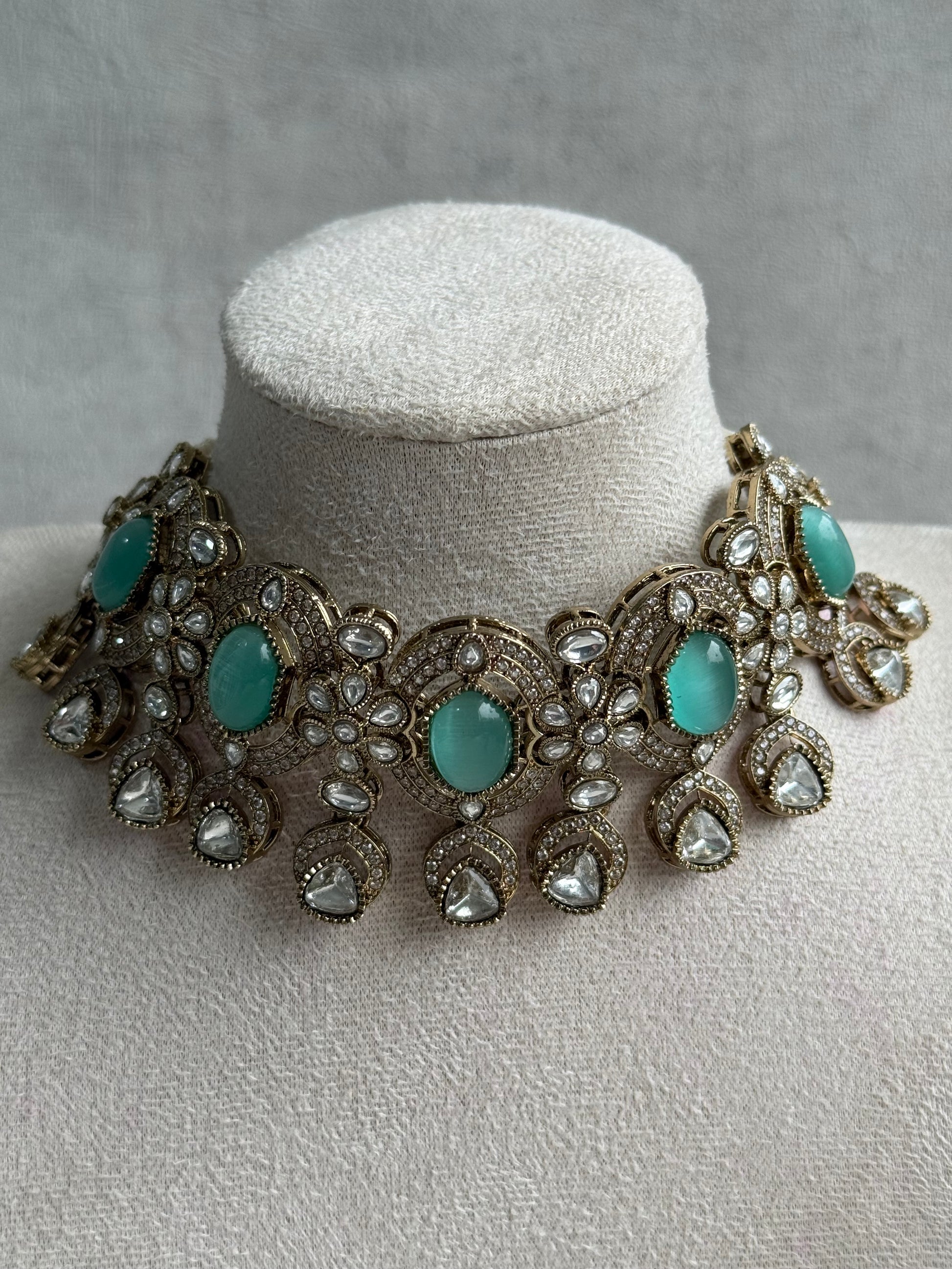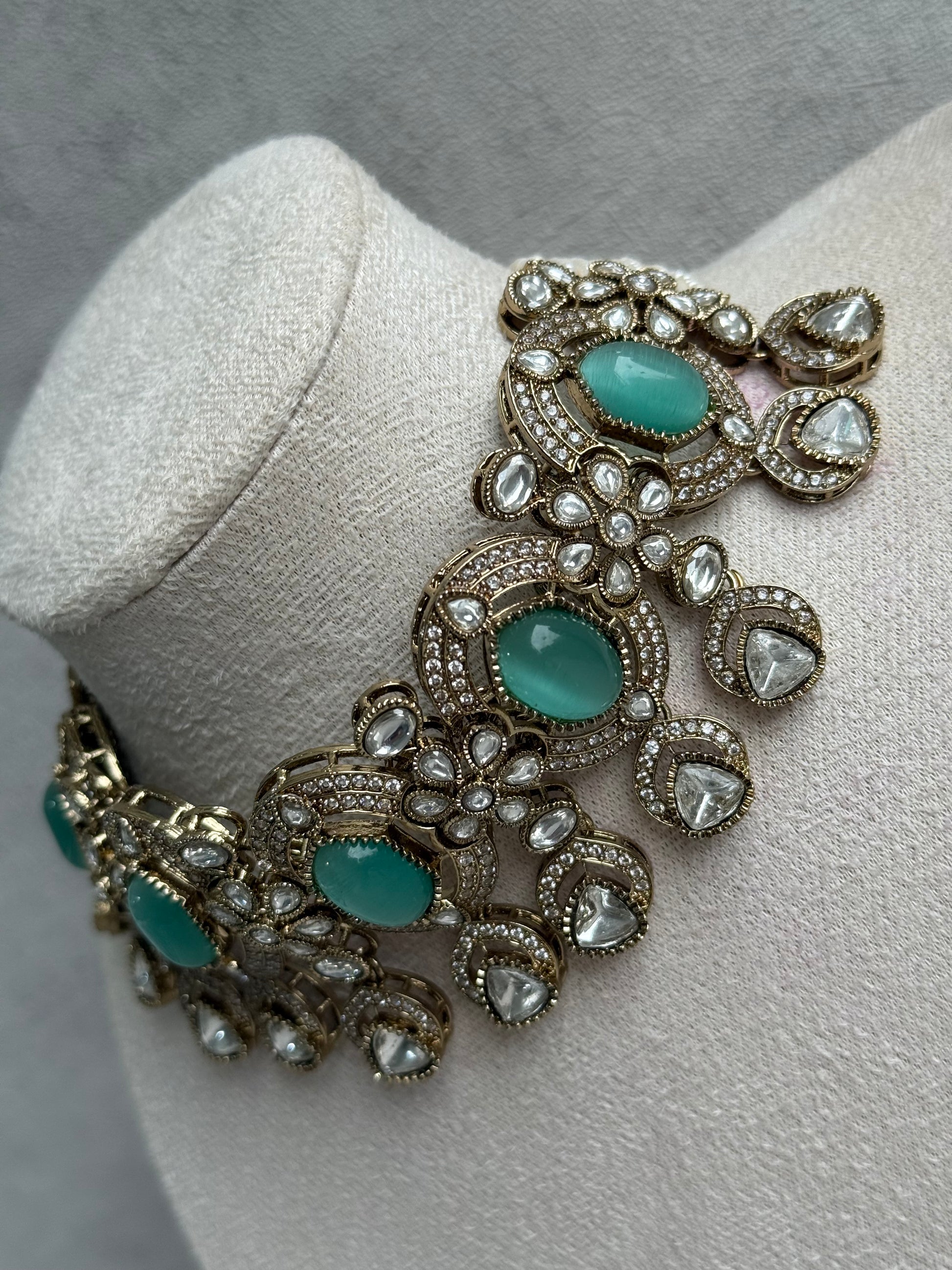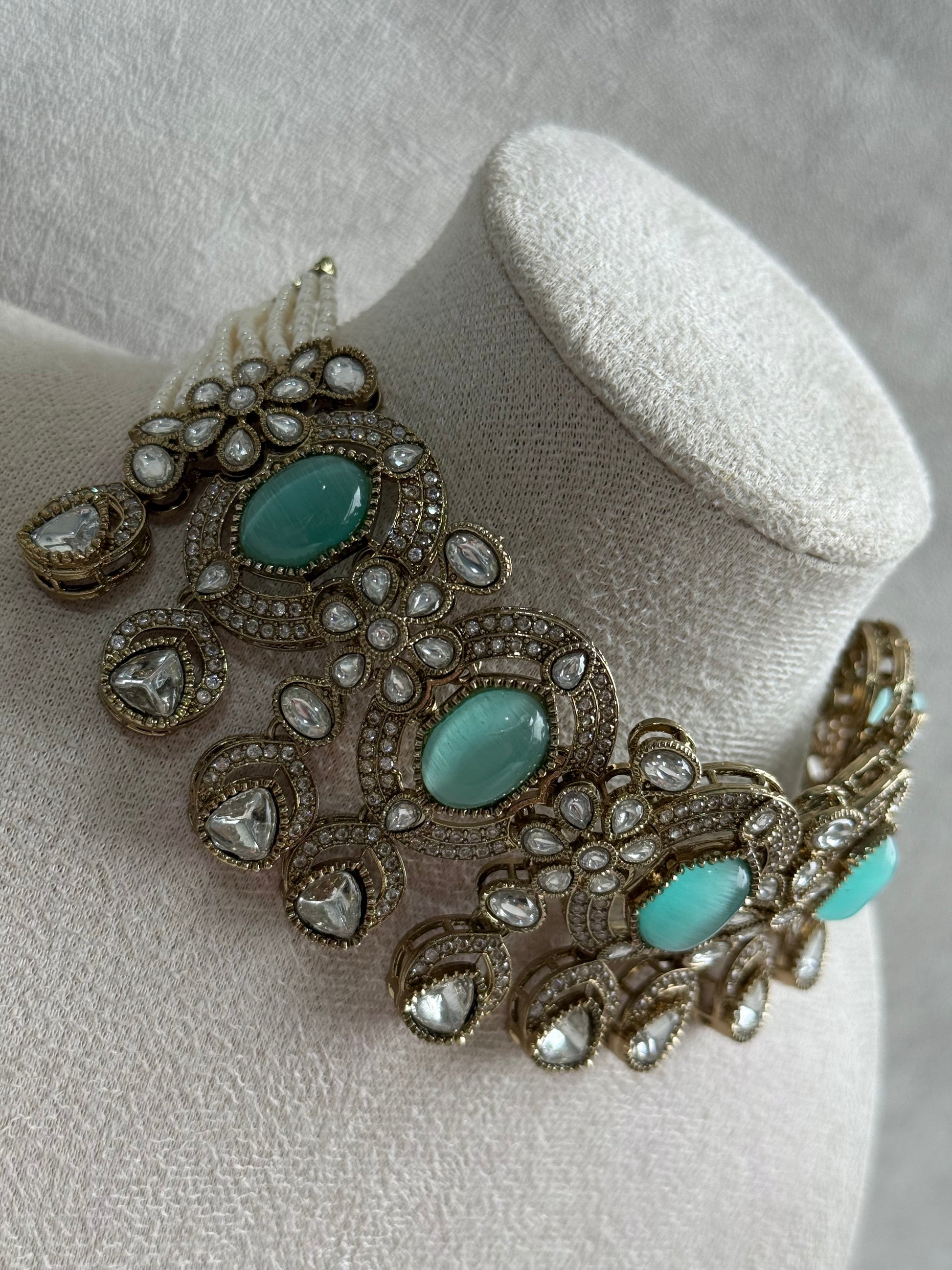 The choker features an intricate arrangement of oval and floral motifs, each bordered with pavé crystals and framed by delicate mirror-cut stones. The aqua centrepieces add a refreshing glow, perfectly balanced by the textured antique gold setting that evokes a sense of regal heritage and refined artistry.