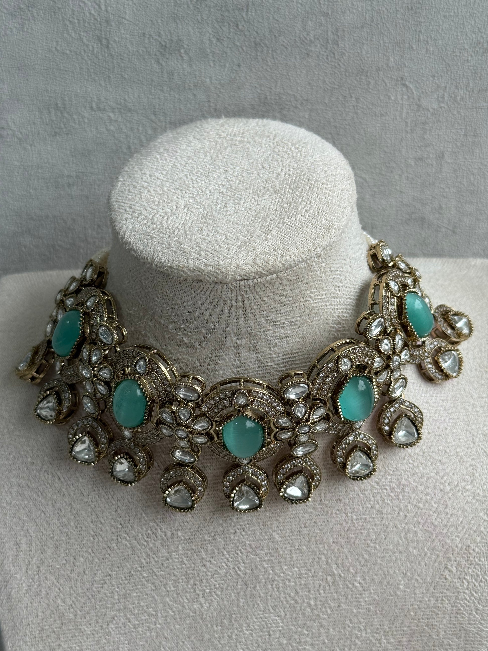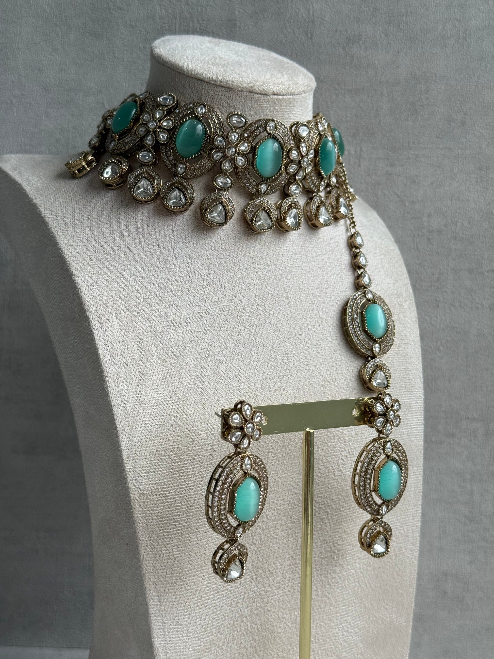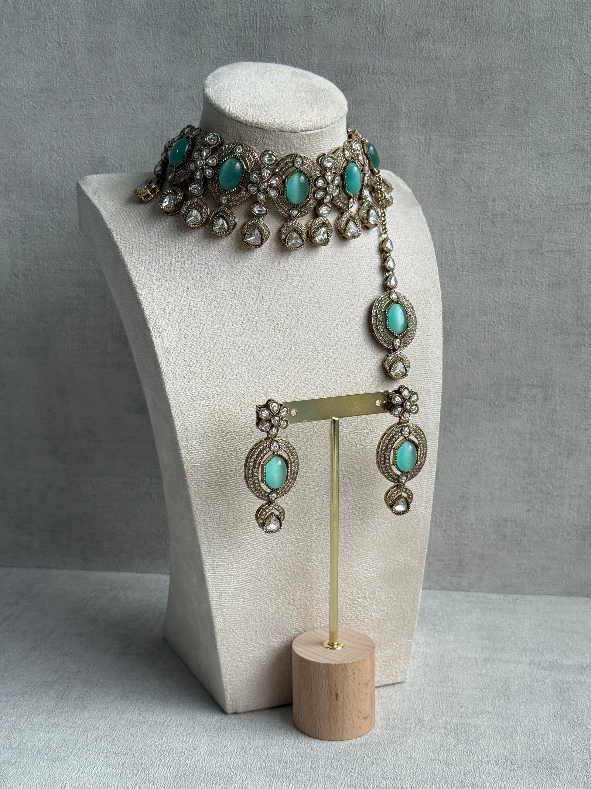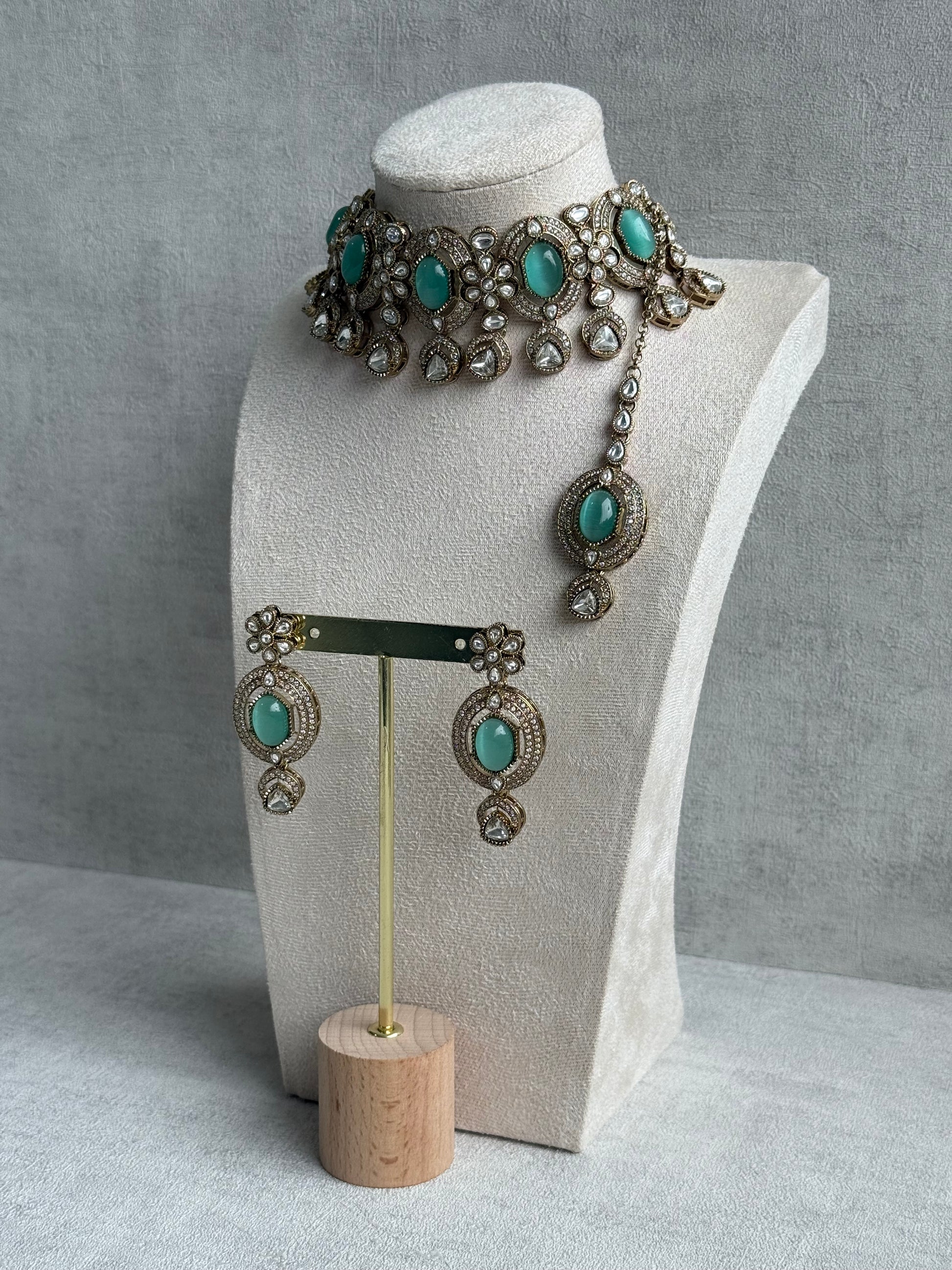 The choker features an intricate arrangement of oval and floral motifs, each bordered with pavé crystals and framed by delicate mirror-cut stones. The aqua centrepieces add a refreshing glow, perfectly balanced by the textured antique gold setting that evokes a sense of regal heritage and refined artistry.