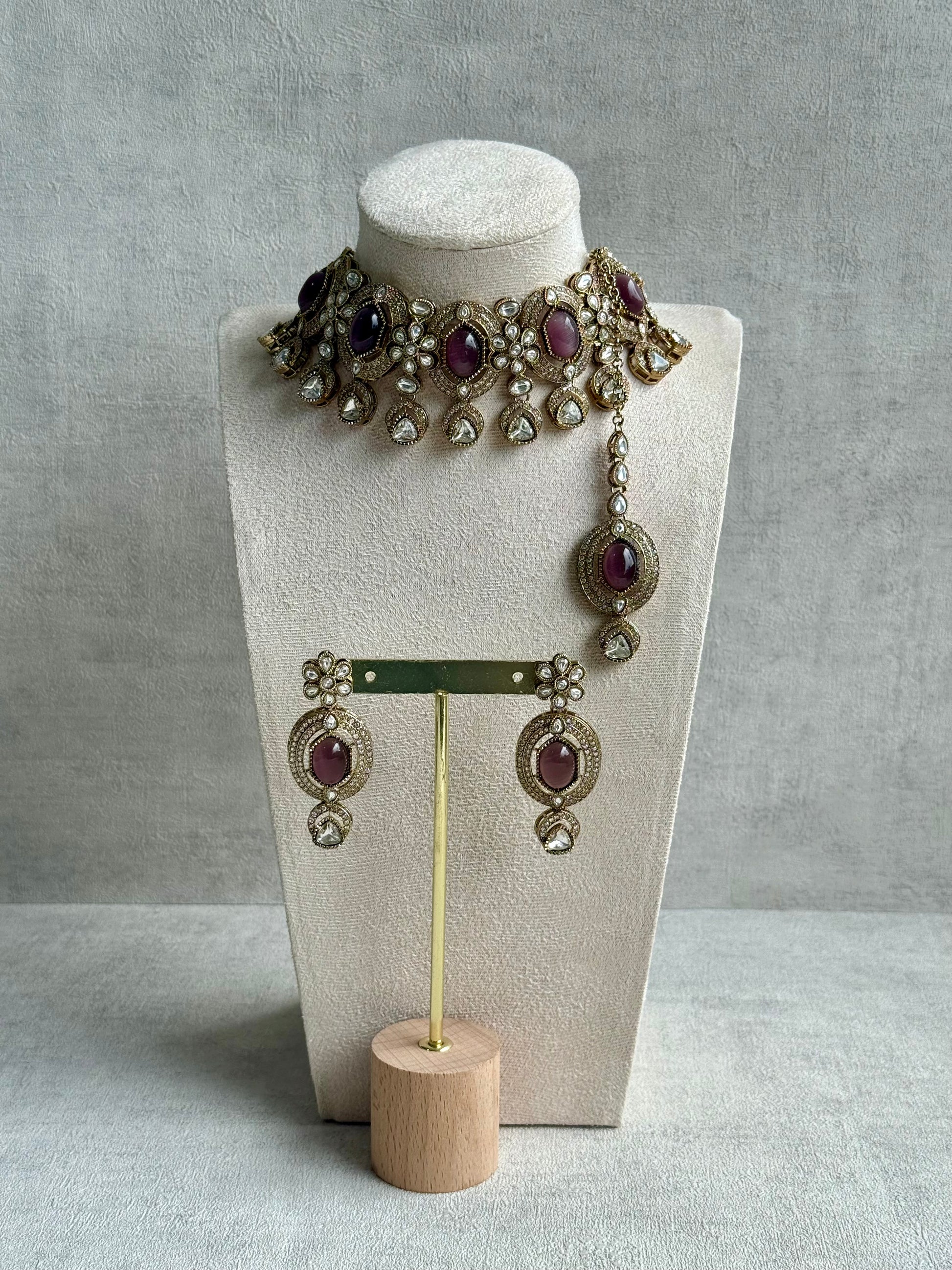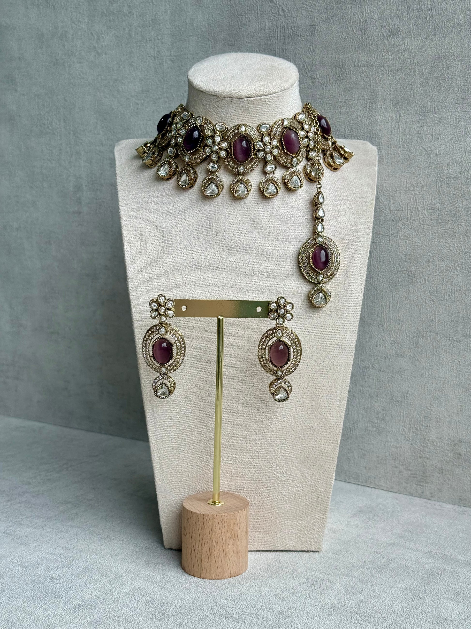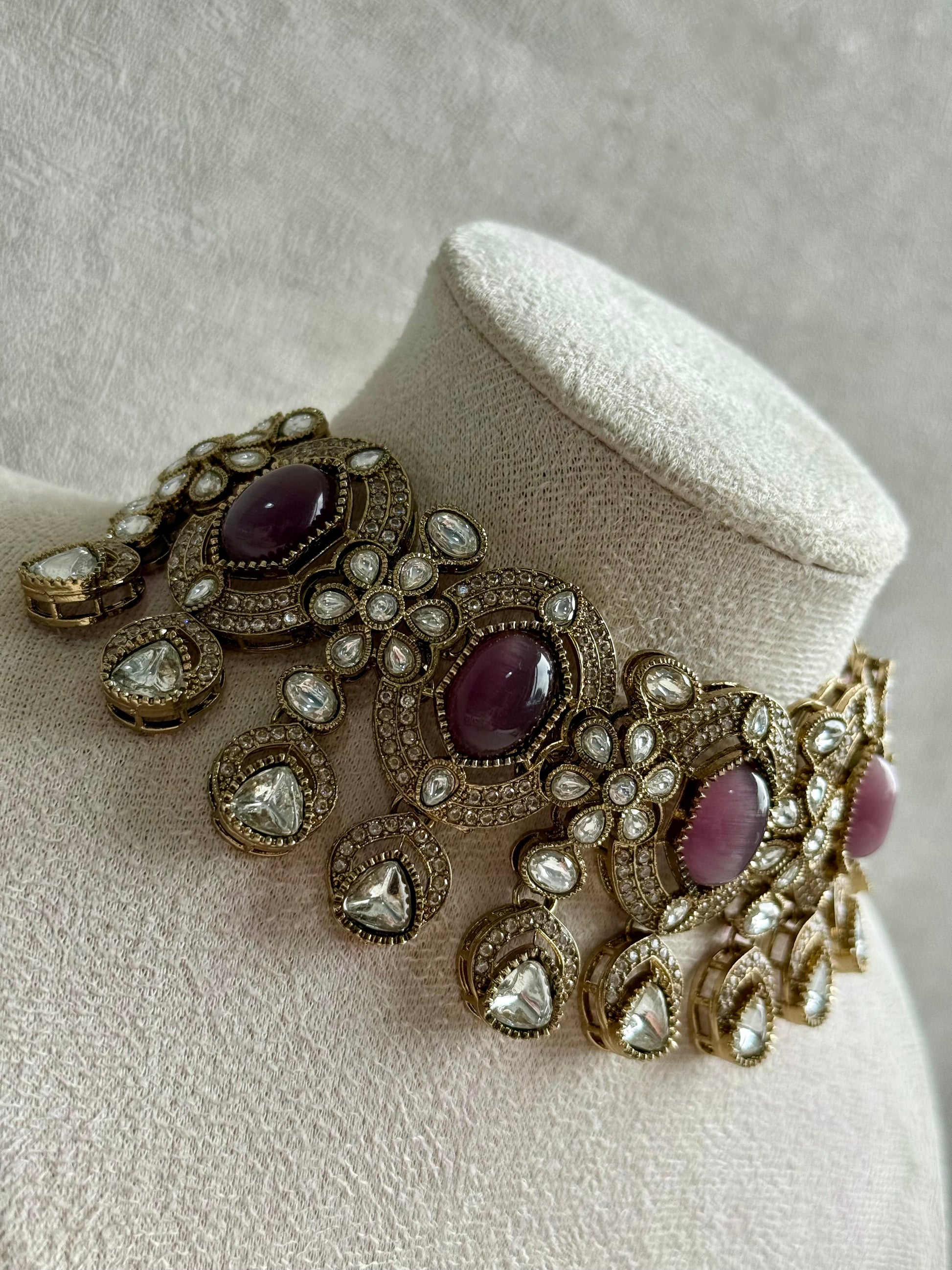 The choker features oval centrepieces framed by pavé crystals and mirror-cut stones, radiating a rich, heirloom-inspired aura. Each floral and teardrop motif reflects light from every angle, highlighting the subtle shimmer of the mauve stones while maintaining the old-world grandeur that defines Ayura Designs’ aesthetic.
