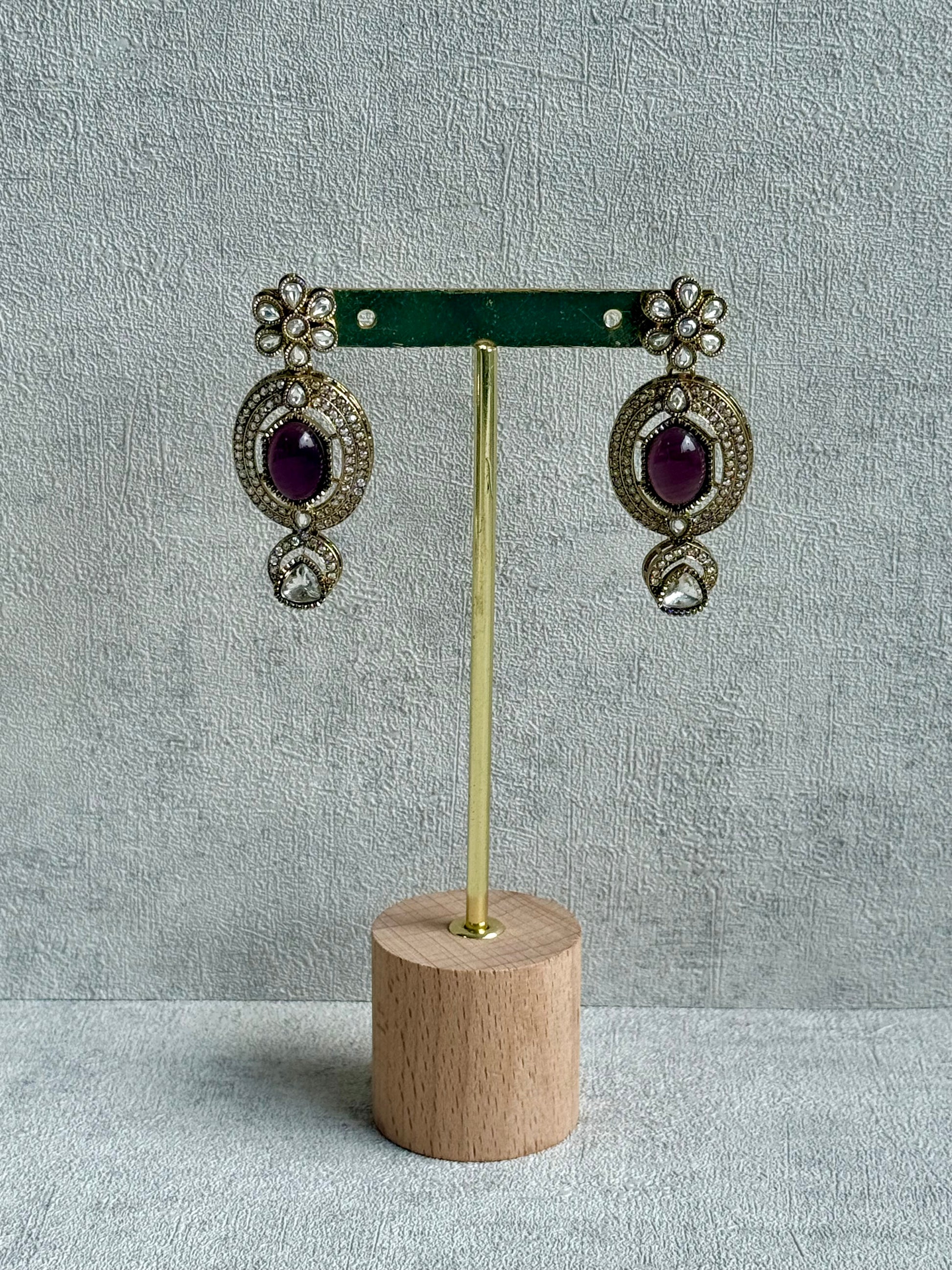 The matching earrings mirror the choker’s refined balance of structure and sparkle — their floral tops and oval drops echoing the delicate interplay of mauve and gold. A coordinating tikka completes the set, uniting each element in a graceful harmony that speaks of timeless sophistication.