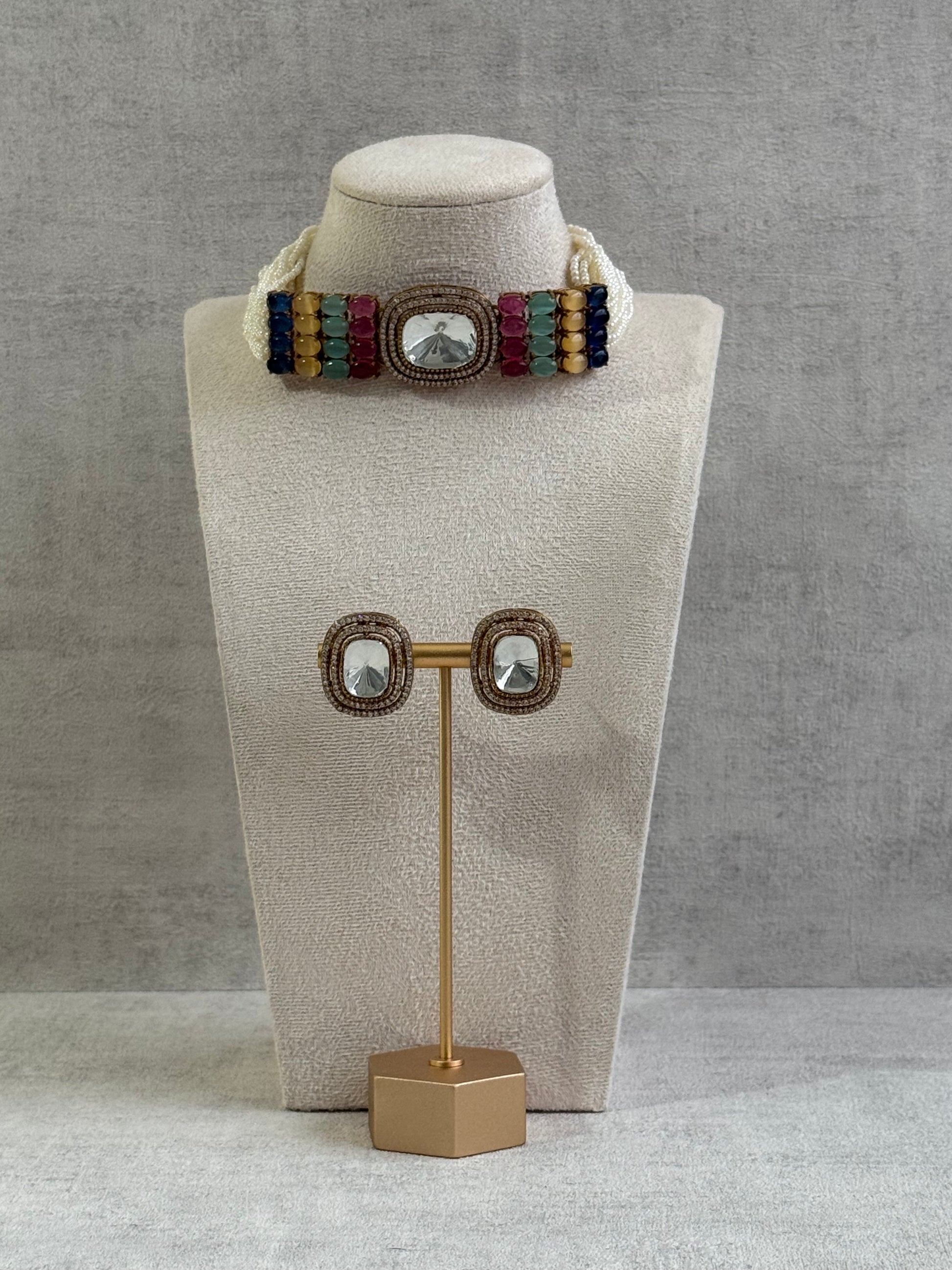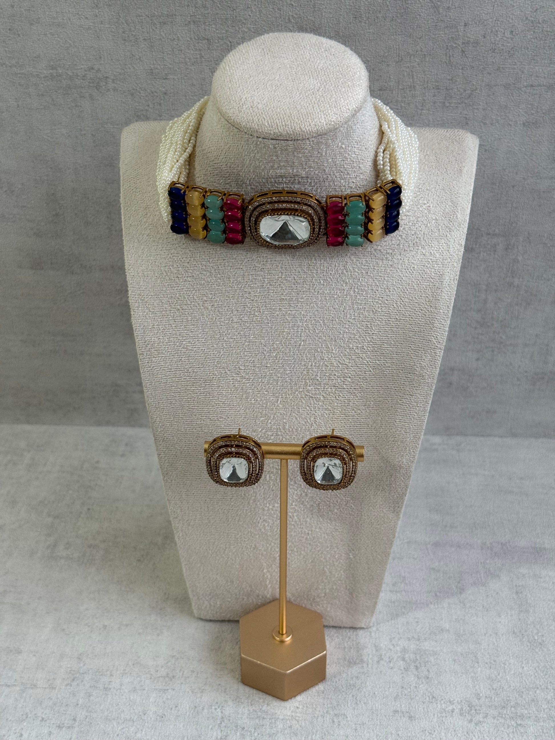 The Ayura Designs Emma Choker Set – Multicolour Gemstone Choker & Studs with Mirror-Cut Centrepiece, Pearl Strands & Crystal Borders is a true celebration of colour, clarity, and contemporary charm. Its playful tones and radiant centrepiece bring a modern twist to classic jewellery artistry.