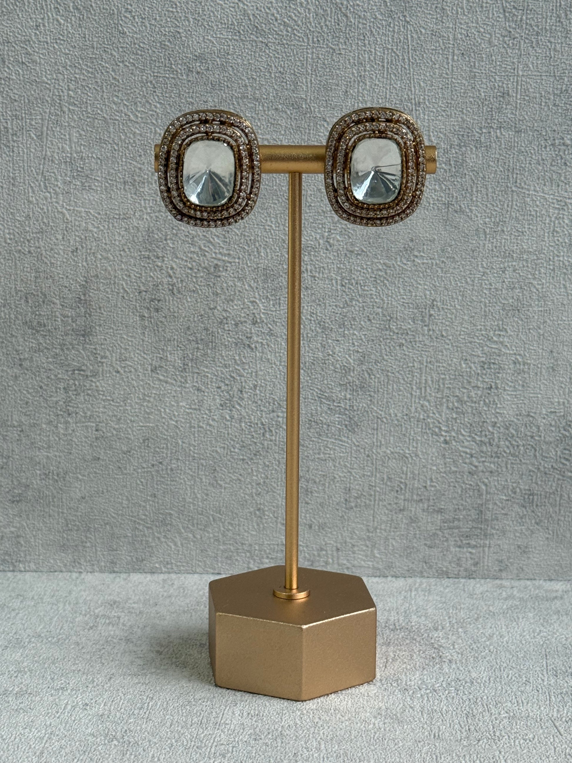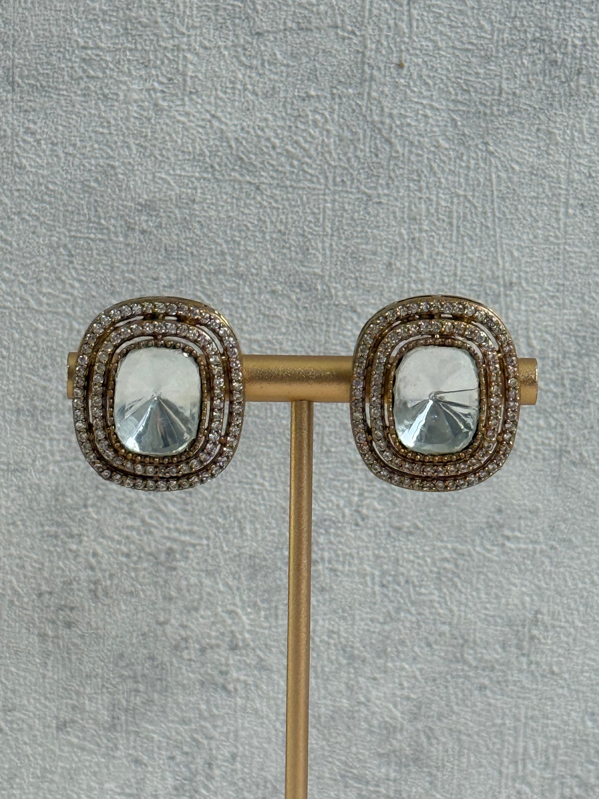 Strands of miniature pearls tie the design together, softening the vibrance with a touch of delicacy. The accompanying stud earrings mirror the same geometric symmetry, with a statement mirror-cut stone bordered by intricate crystal halos — simple, striking, and beautifully versatile.