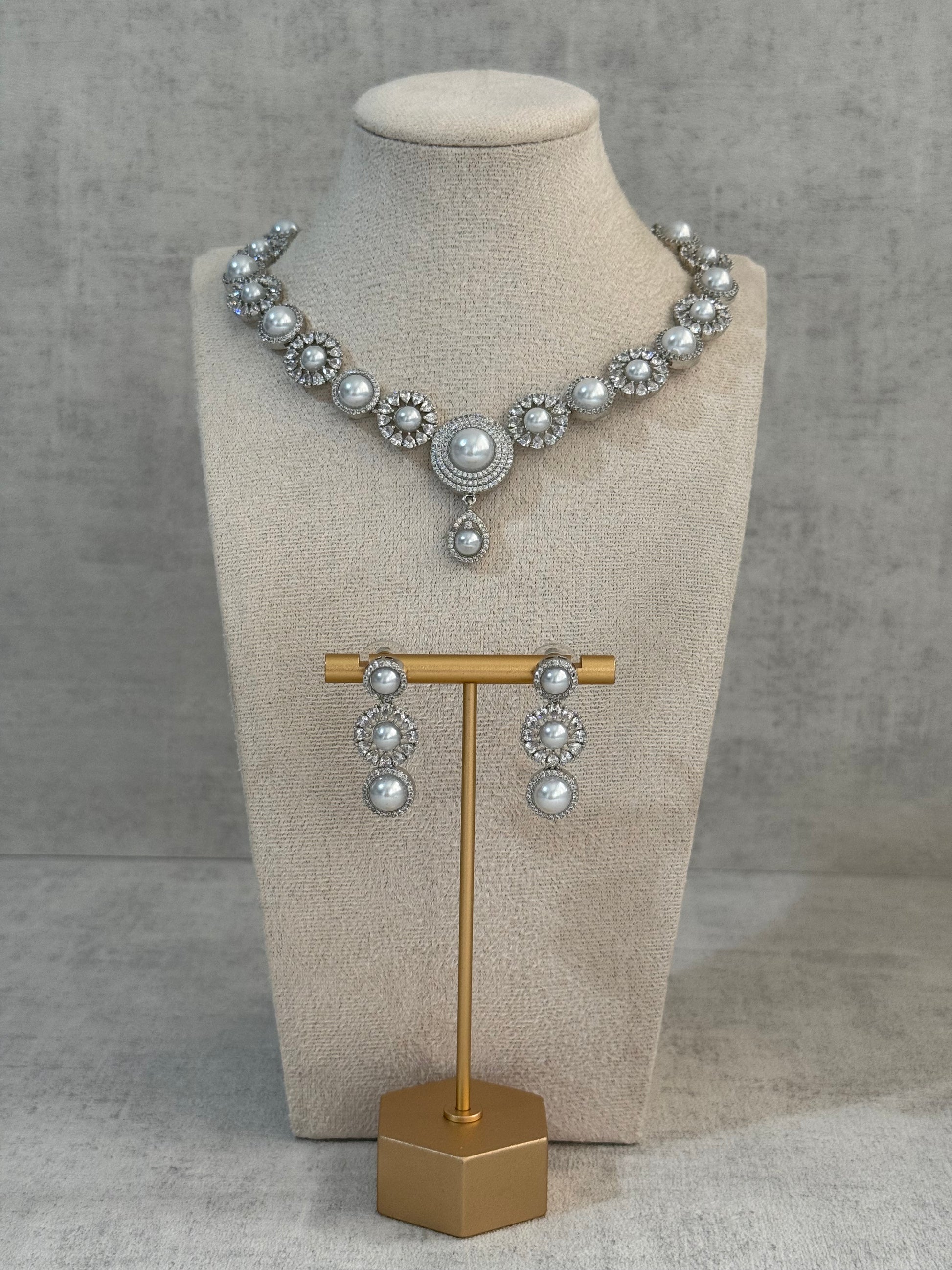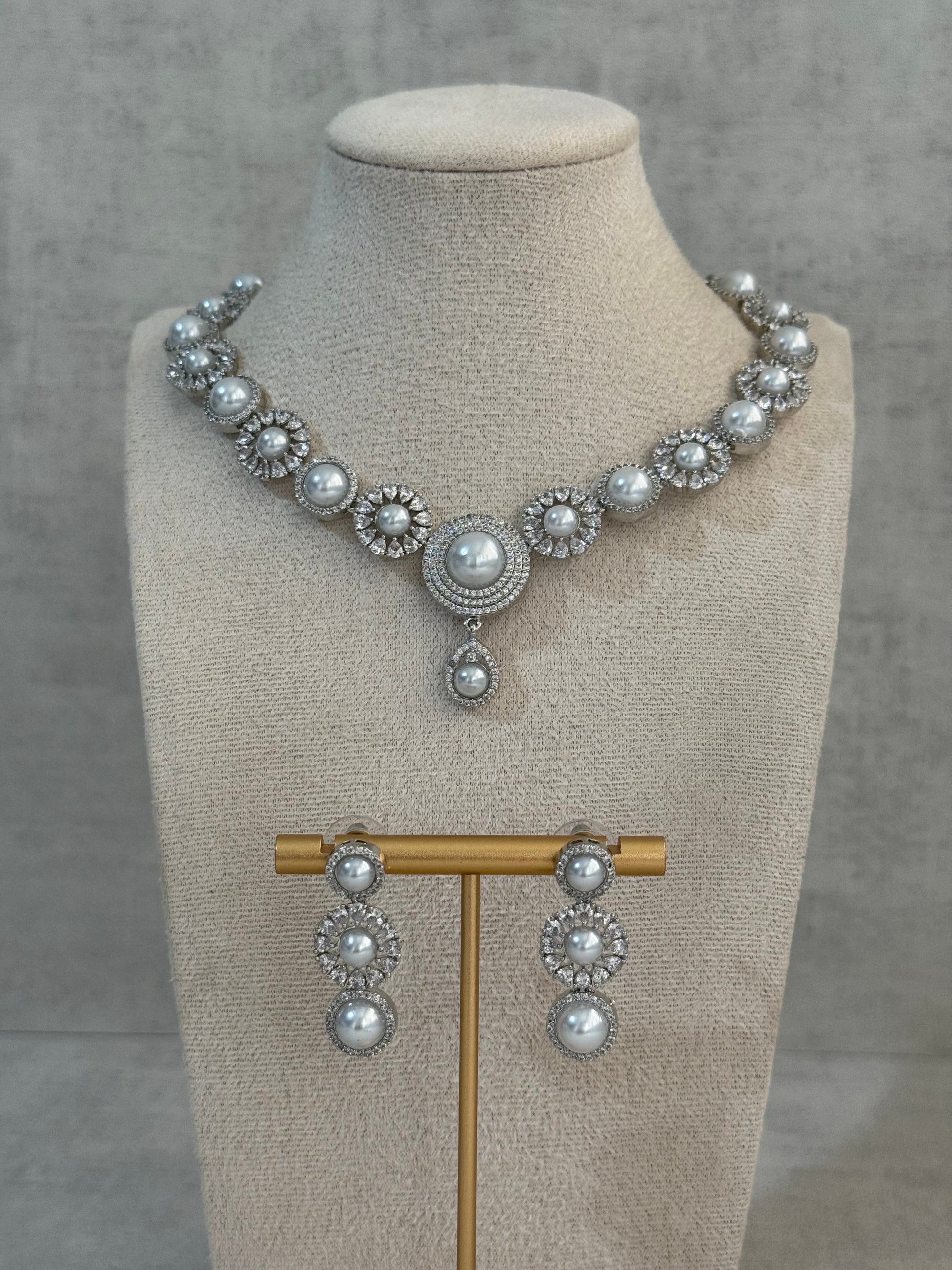 Crafted in a silver-toned finish, the necklace balances contemporary glamour with timeless elegance. The design alternates between larger and smaller pearl centres, framed by glittering crystal halos that add dimension and a luxurious shimmer. At its centre, a drop pendant detail adds a refined focal point, drawing the eye toward the décolletage.