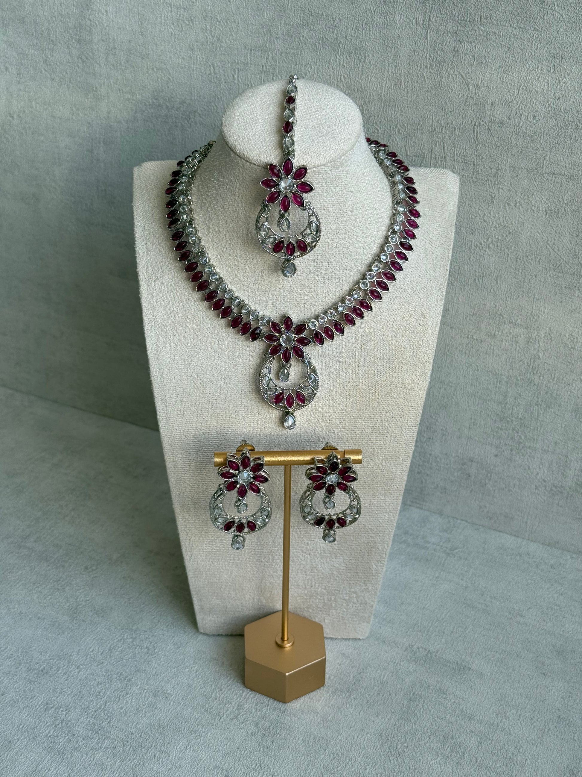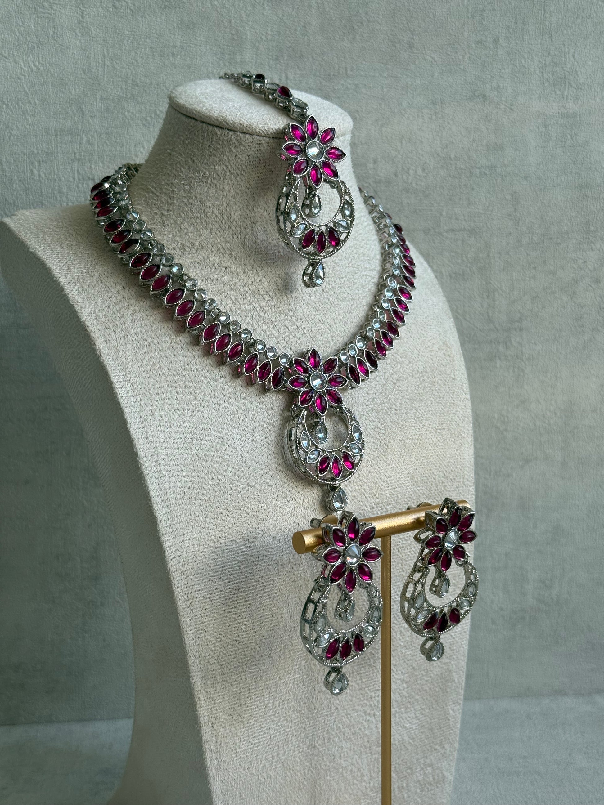 Bold, feminine, and intricately crafted — the Ayura Designs Fareeha Set is designed to turn heads. This statement three-piece set includes a necklace, earrings, and tikka in a polished silver finish, adorned with glimmering mirror-cut stones and rich fuchsia marquise accents. With its striking floral motifs and open crescent design, Fareeha brings a fresh take on classic elegance — perfect for festive soirées, mehndi nights, or contemporary bridal looks.