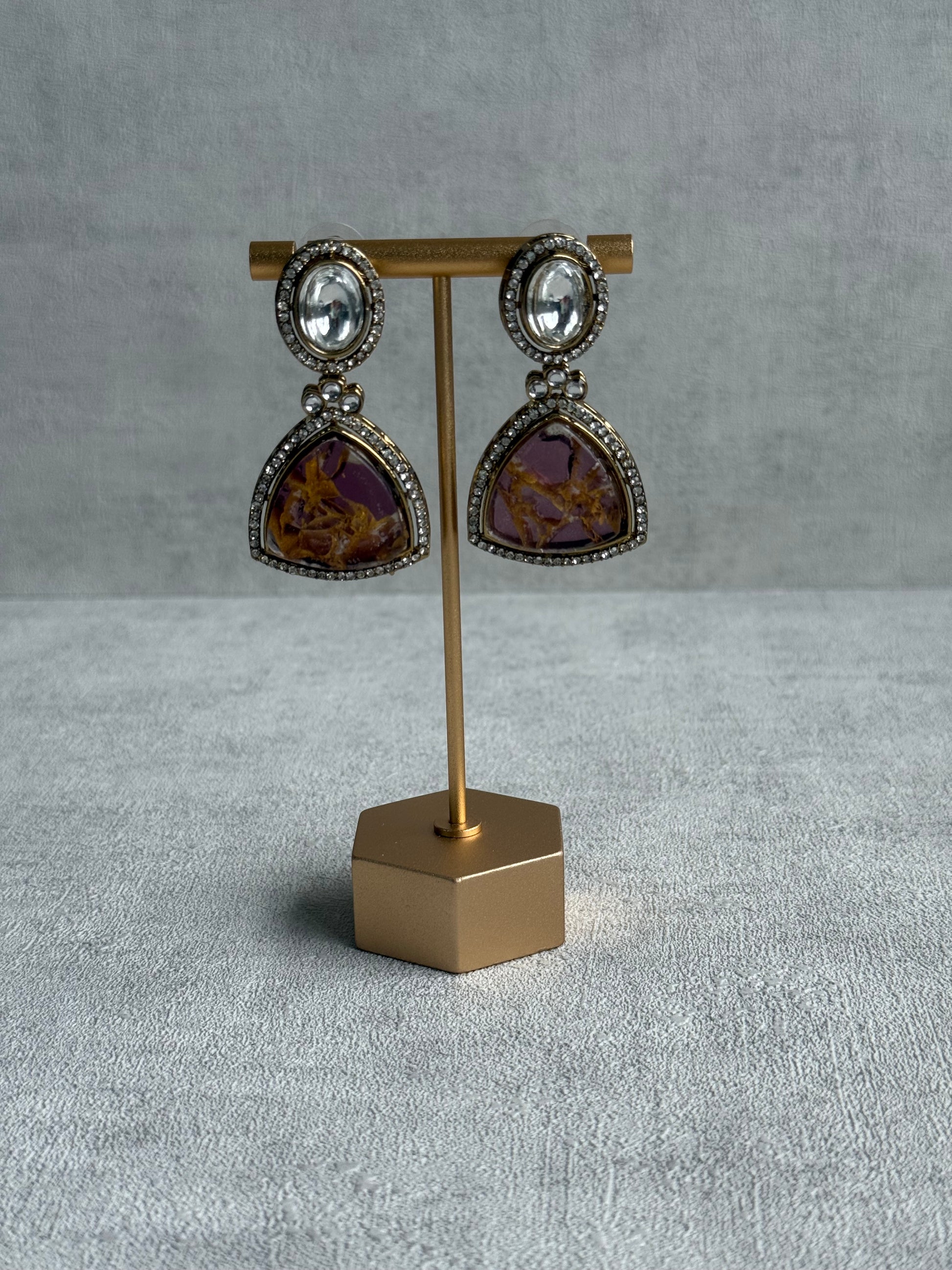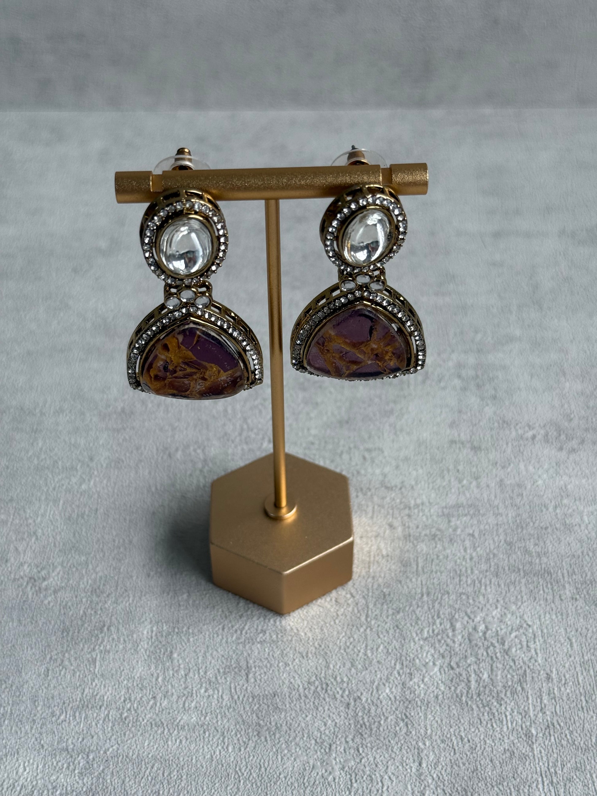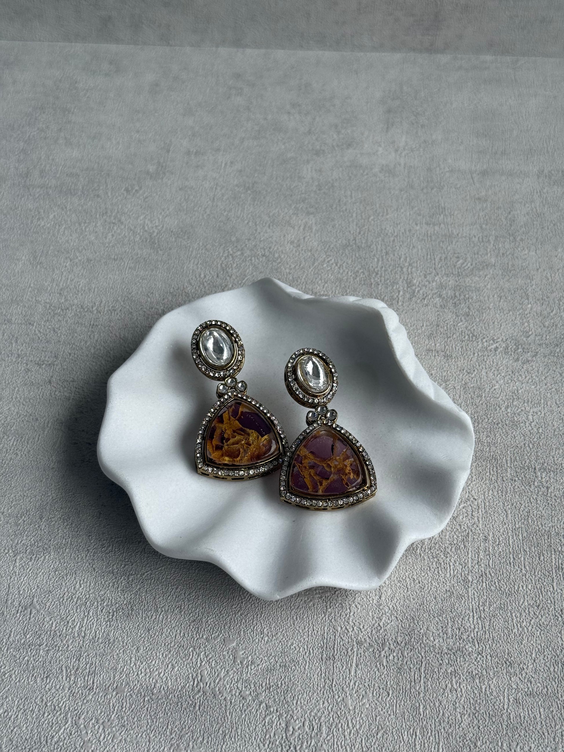 The soft yet striking colour palette makes these earrings incredibly versatile — bold enough to elevate an occasionwear outfit, yet subtle enough to pair with a classic kurta or saree. The rich berry tones are complemented by antique gold framing, giving the piece a slightly vintage look while the mirror-cut elements add a contemporary twist.
