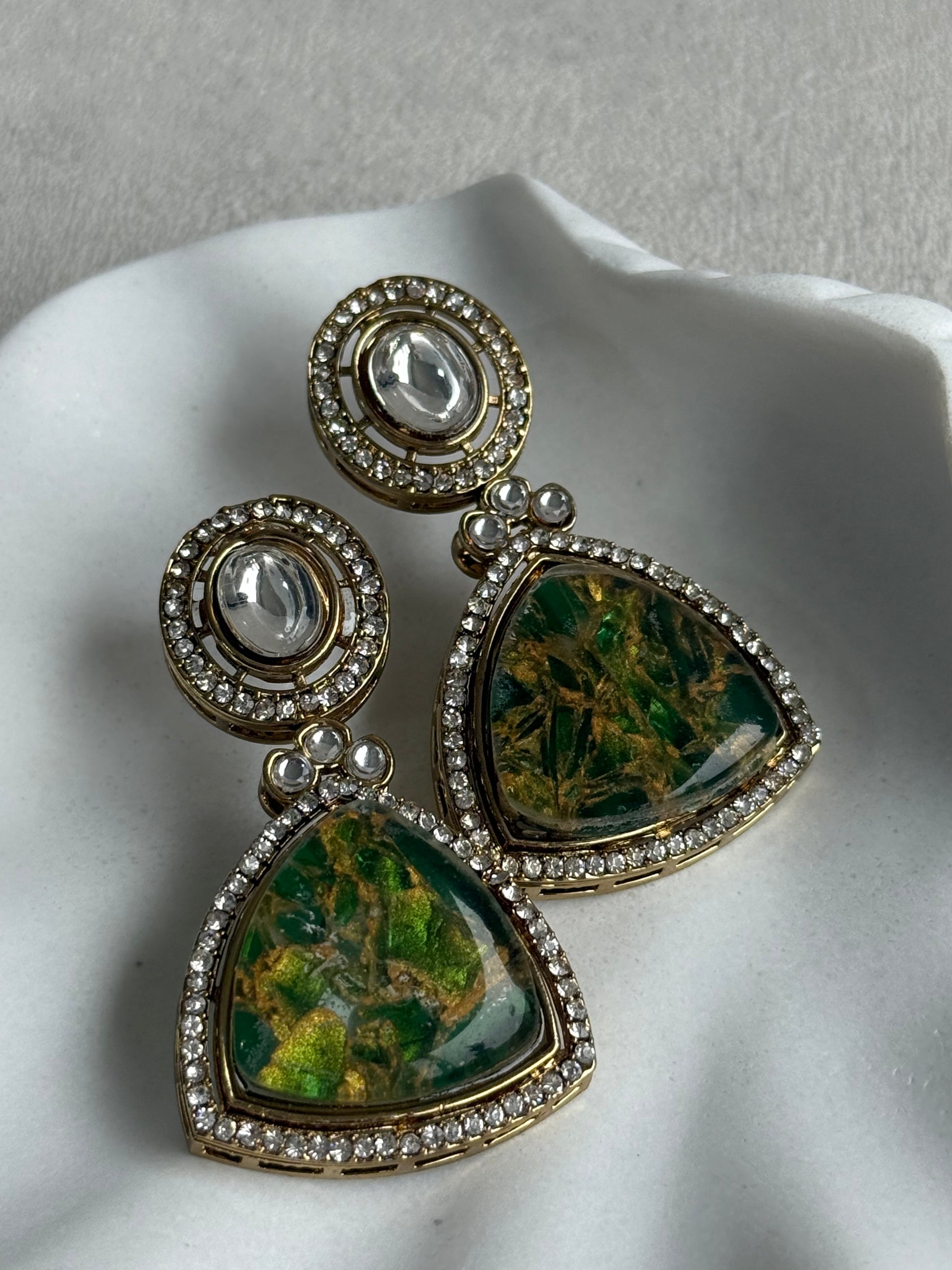Designed to catch the light from every angle, these earrings balance contemporary polish with timeless charm. The layered shape adds depth and dimension, while the emerald hues lend a grounded, graceful energy — perfect for those who love making a statement without shouting.
