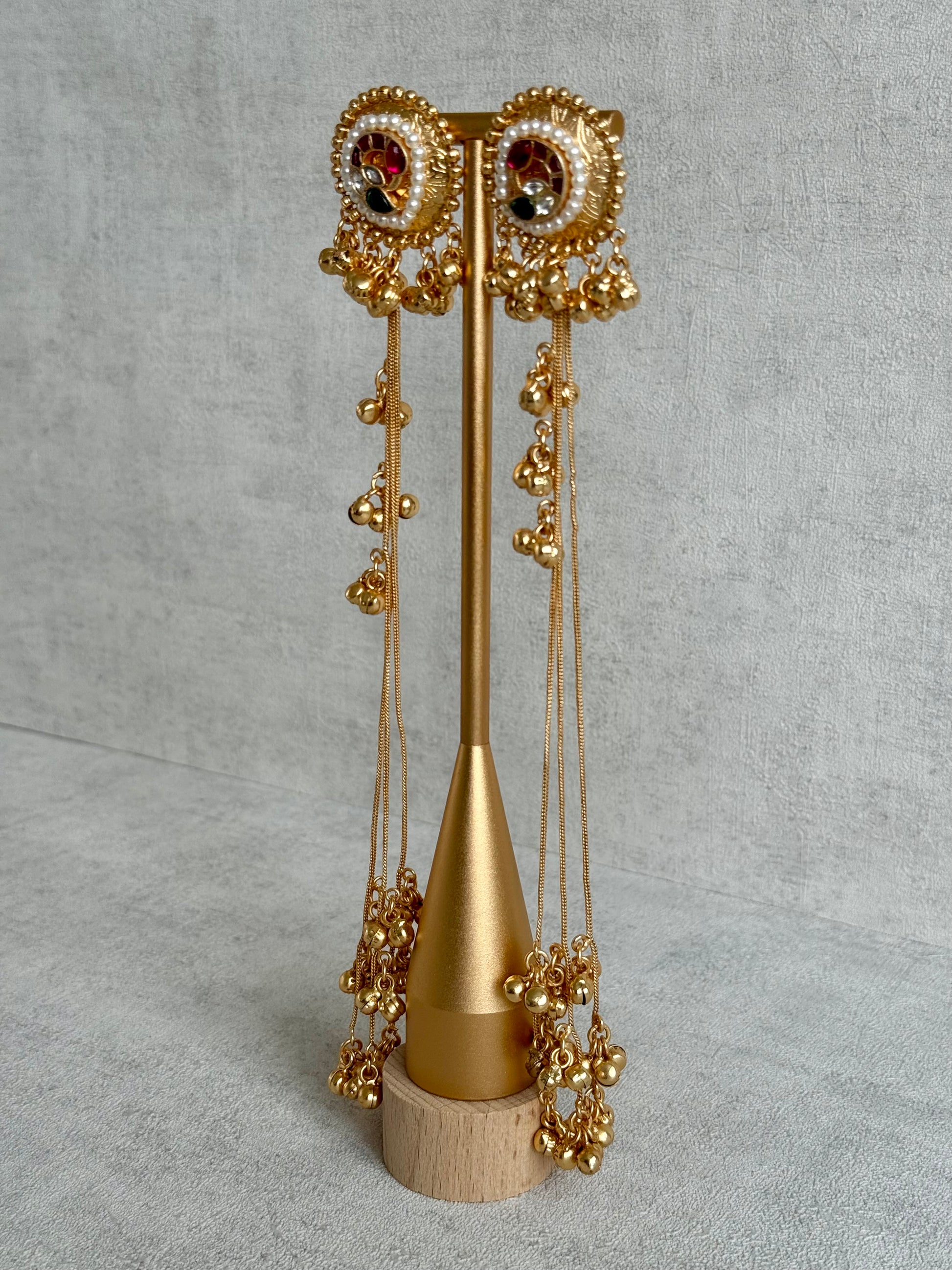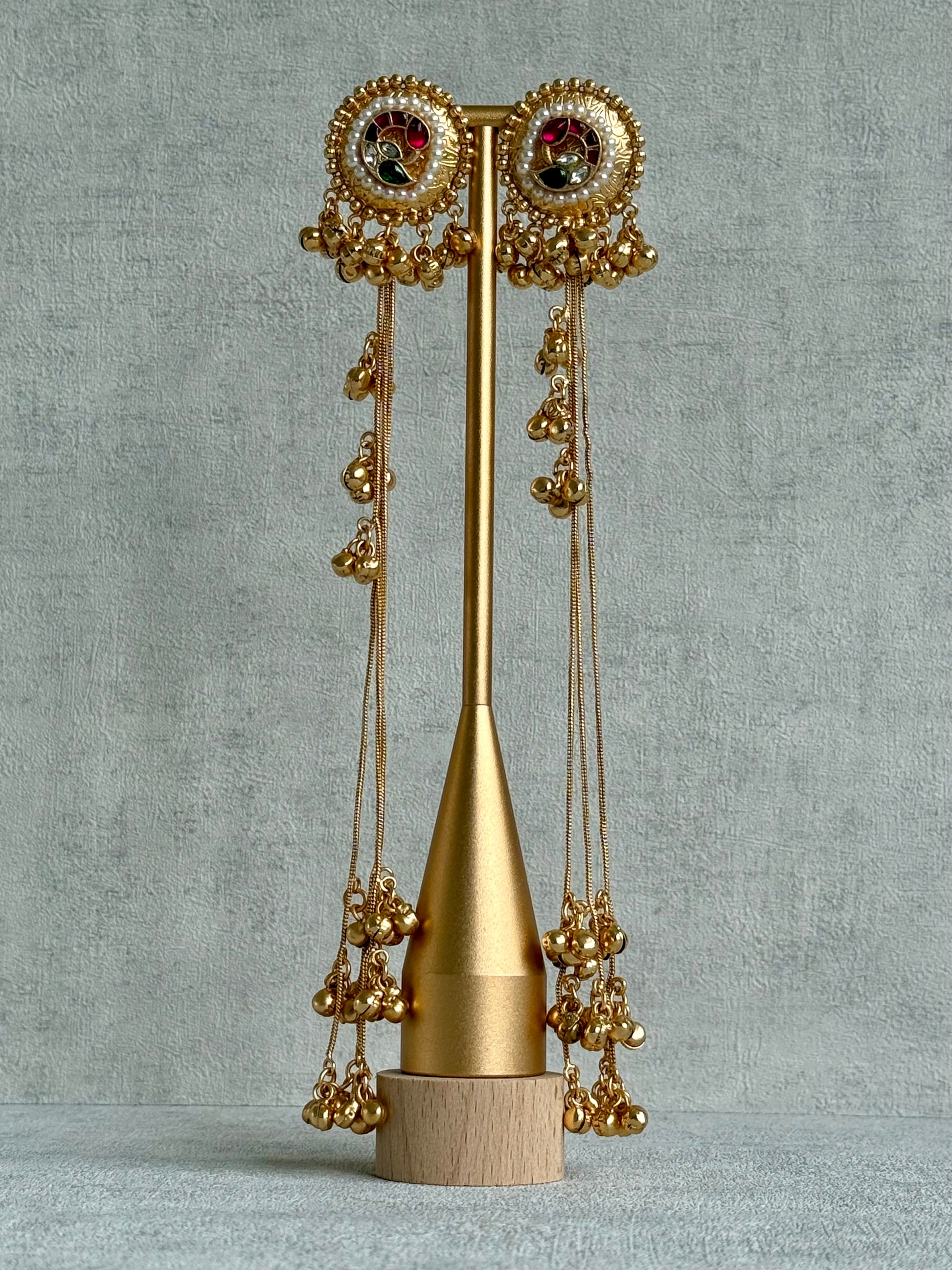 Long sahare chains cascade from each earring, adorned with golden ghungroo drops that sway softly with every movement. The design echoes old-world craftsmanship, where every element — from the enamel to the intricate chains — tells a story of elegance and devotion to detail.