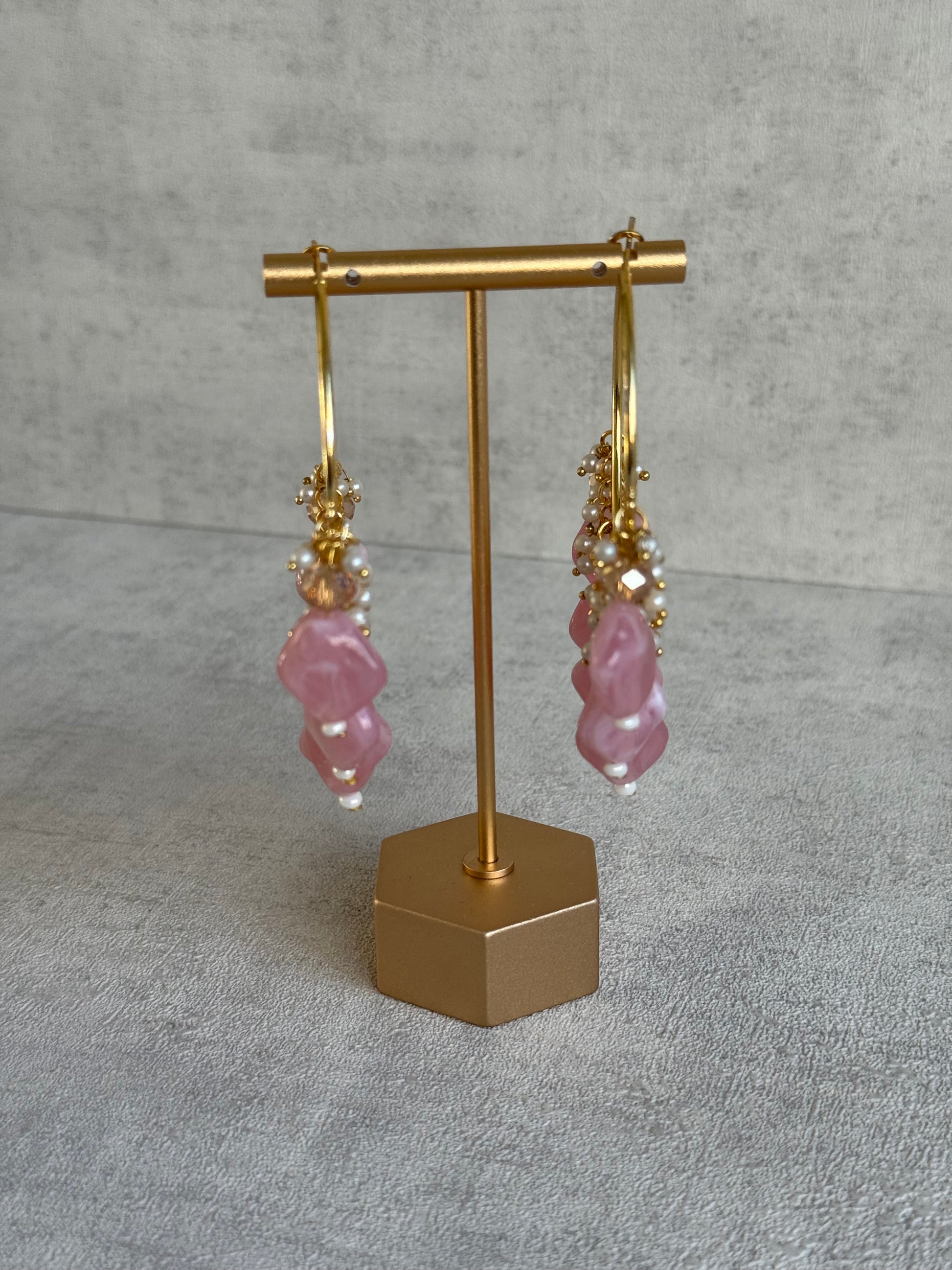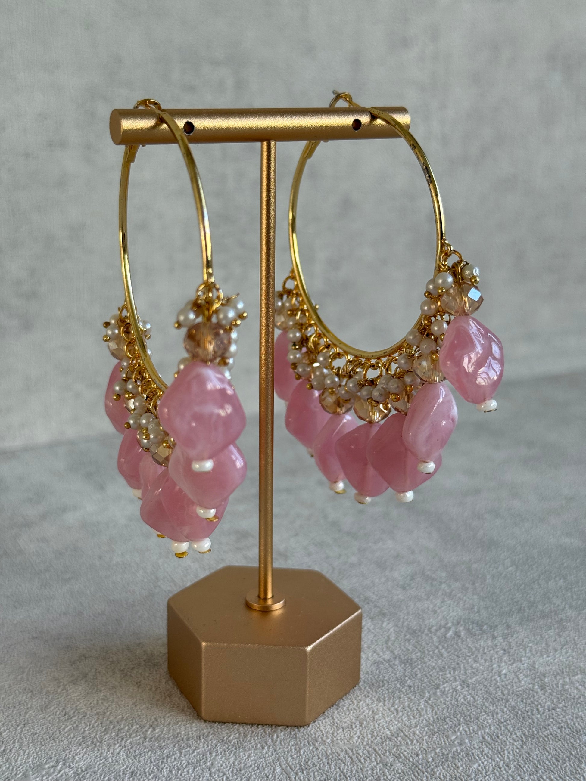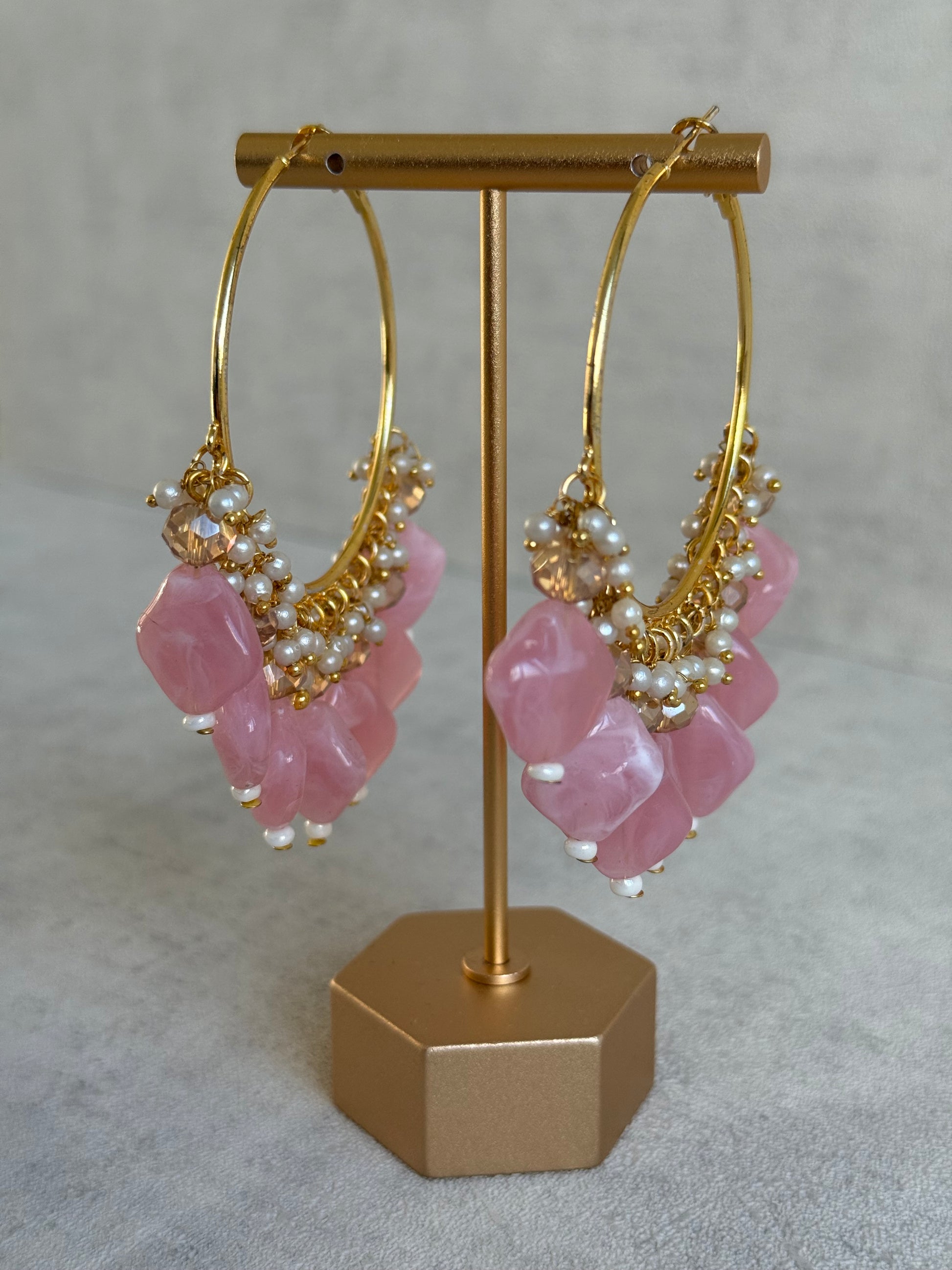 The Ayura Designs Heer Balis – Gold Hoops with Baby Pink Marble Beads, Pearls & Crystal Detailing are the embodiment of soft feminine charm and timeless allure. Designed with milky marble-effect beads in a delicate baby pink tone, each piece glows with a creamy translucence that feels both youthful and romantic. The gentle pastel hue is balanced with clusters of ivory pearls and golden champagne crystals, creating a subtle sparkle that enhances the overall warmth of the gold hoops.