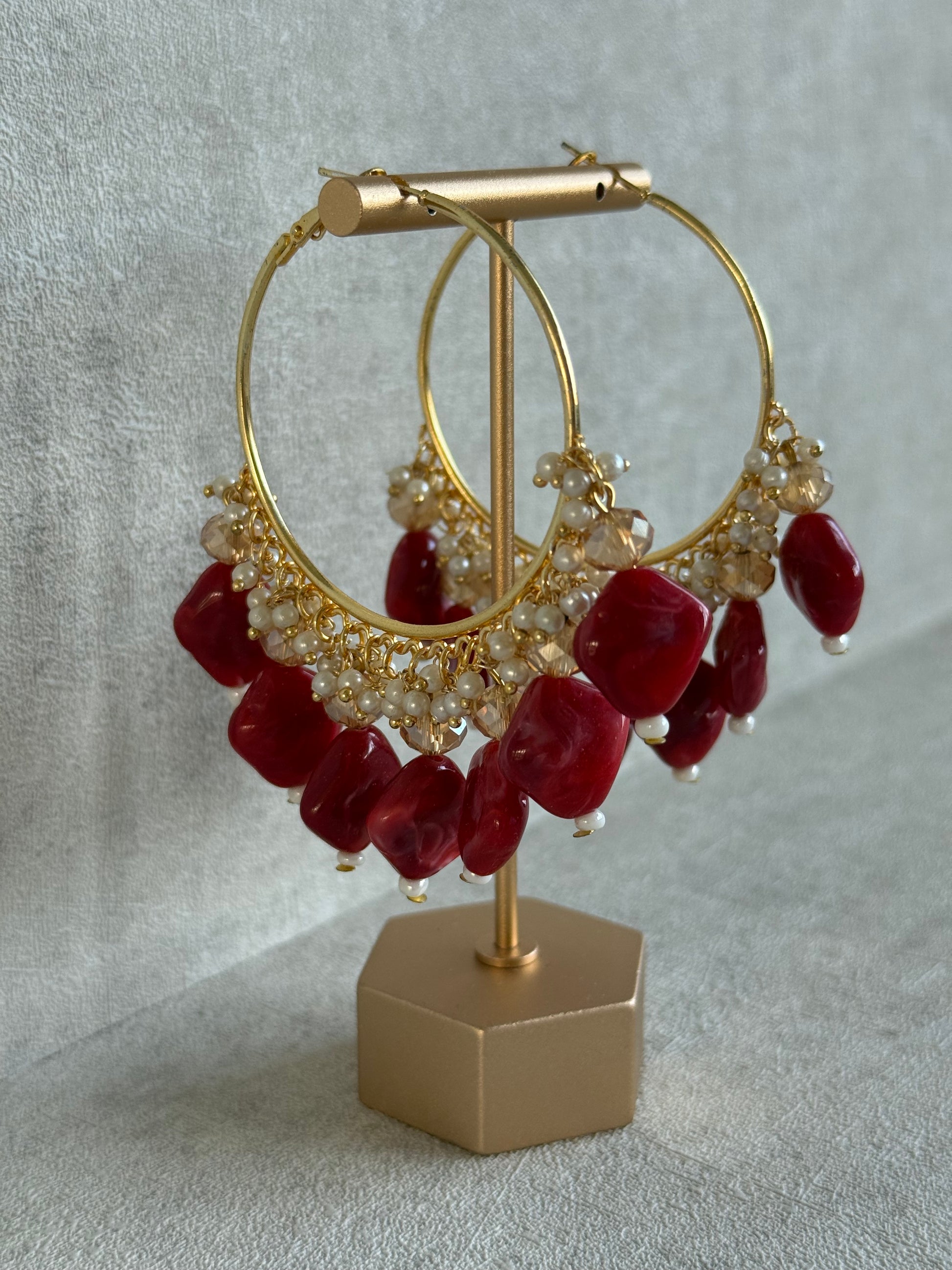 The Ayura Designs Heer Balis – Gold Hoops with Ruby Marble Beads, Pearls & Crystal Detailing capture the essence of festive opulence in a truly modern form. Set on radiant gold hoops, these balis feature striking ruby marble-effect beads that blend tones of deep crimson and cherry red, creating a luscious gemstone-inspired finish. Each piece is accented with clusters of dainty pearls and soft champagne-toned crystals that shimmer delicately as they move.