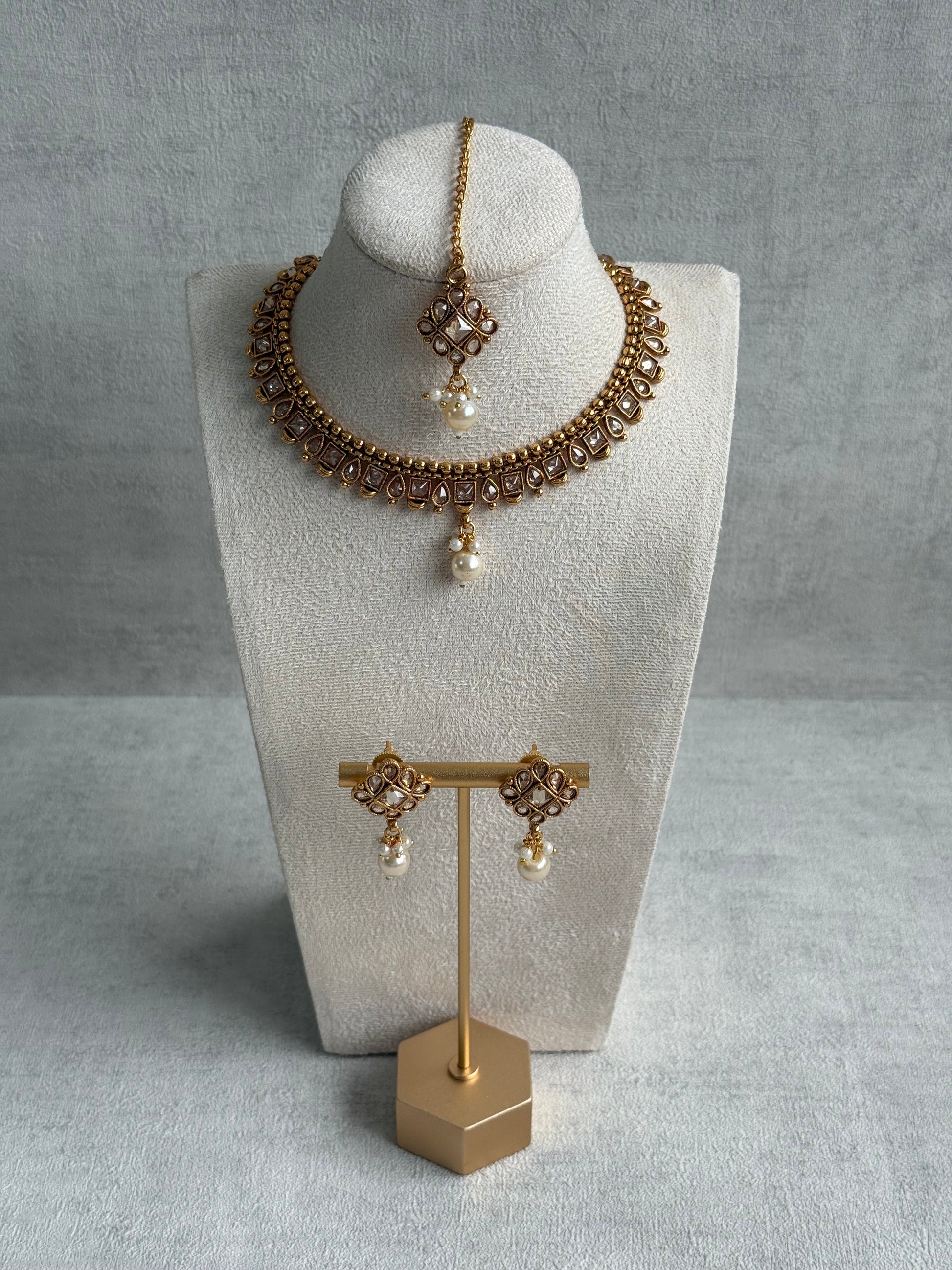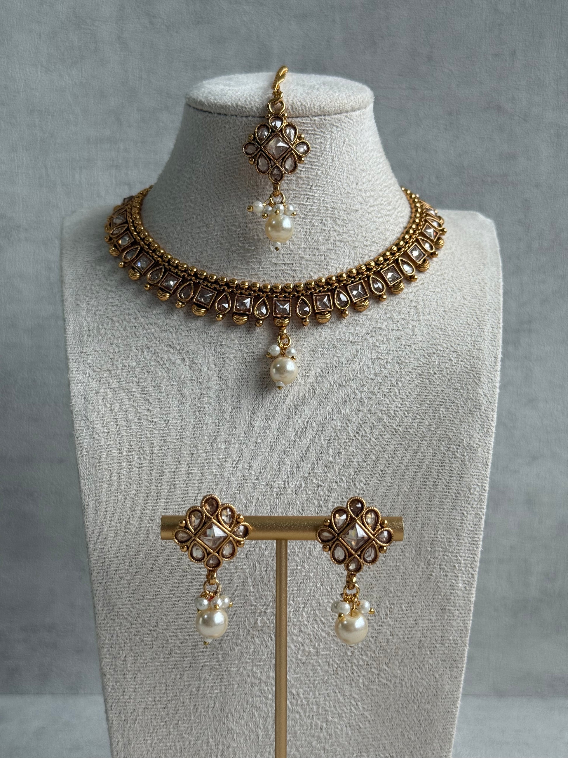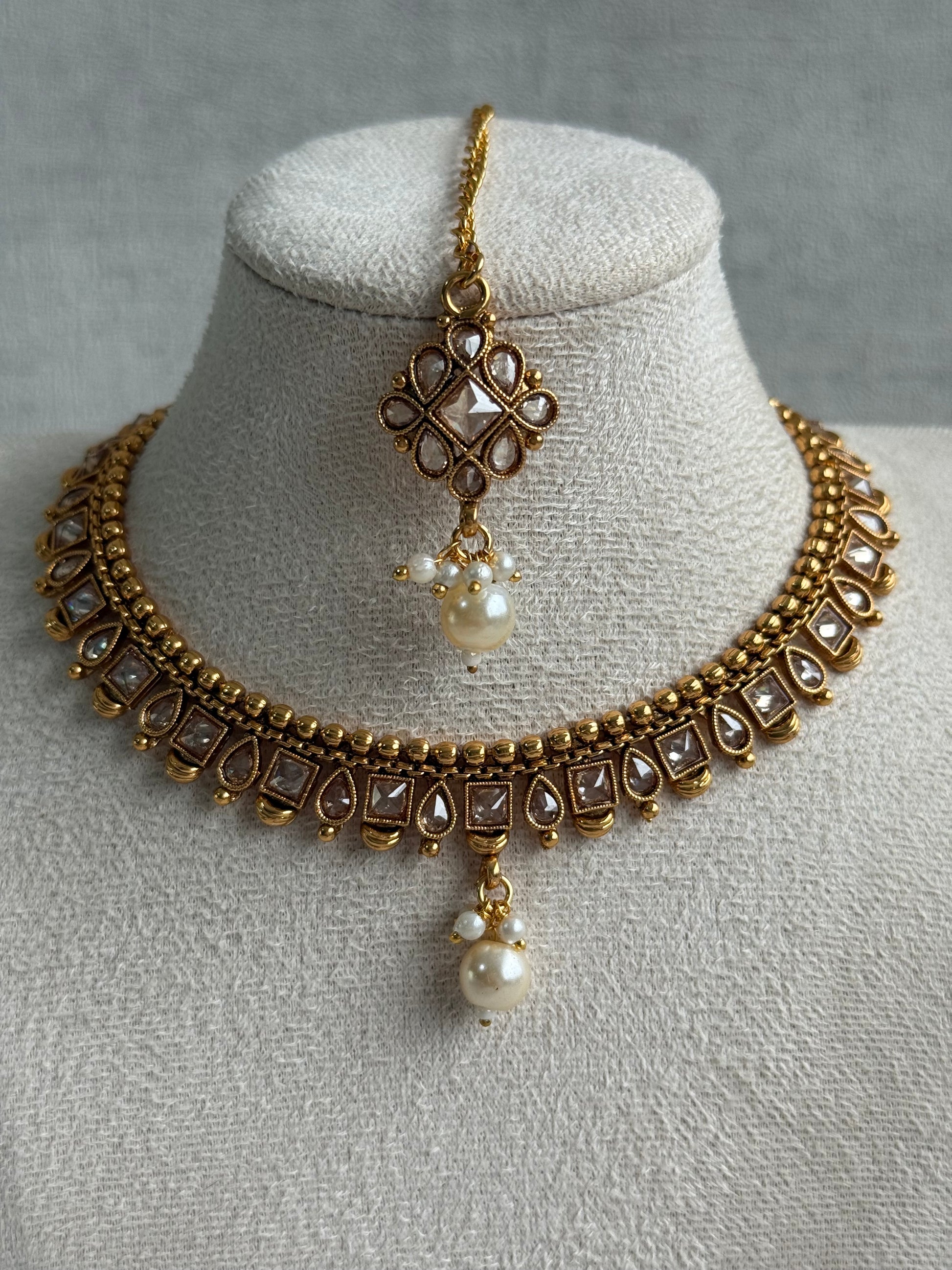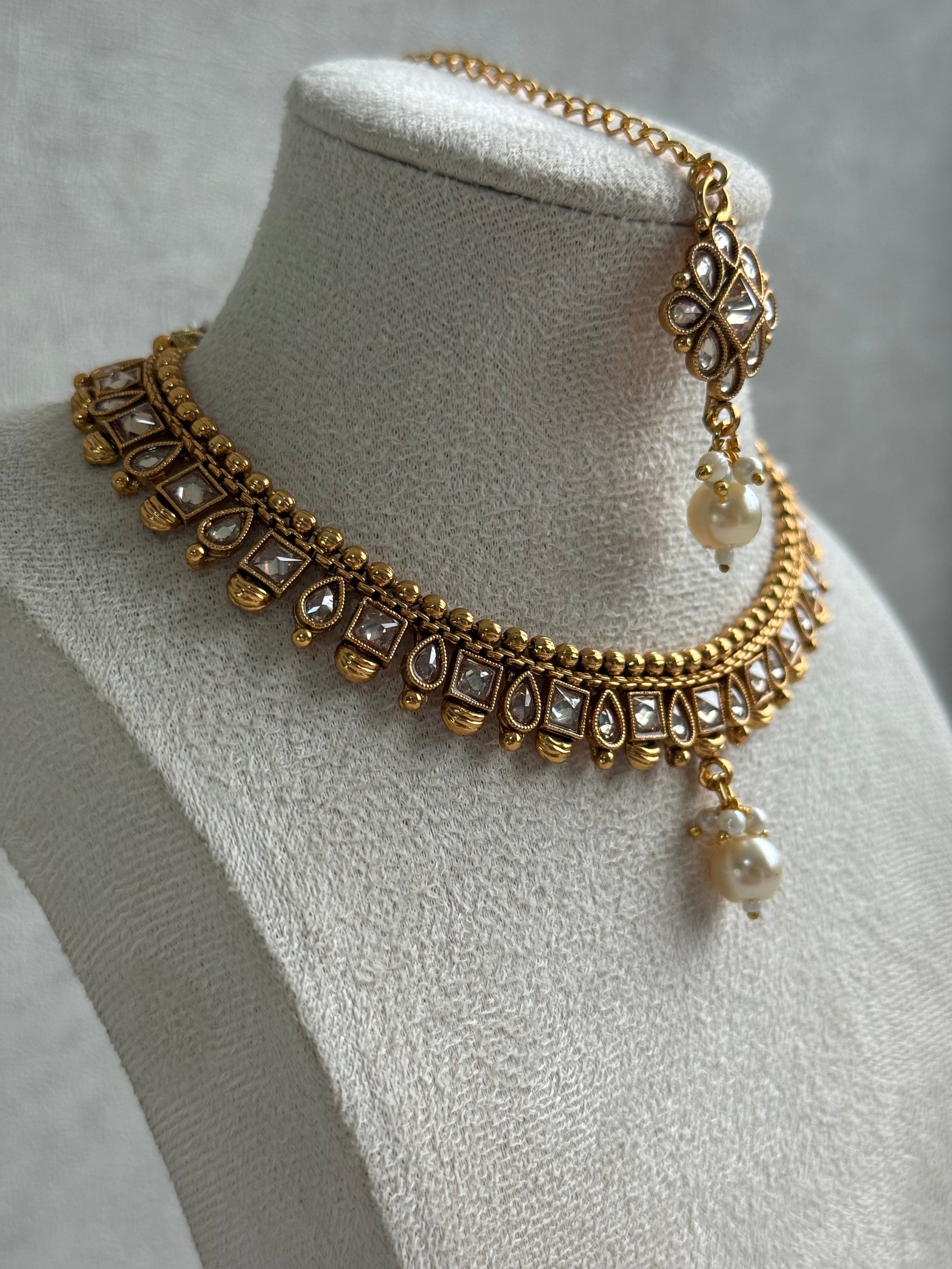 The necklace features a row of mirror-cut stones framed in intricate gold detailing, creating a soft radiance that enhances both traditional and modern ensembles. Delicate pearl drops add a hint of movement and classic charm, while the symmetrical pattern offers a look of balance and sophistication.
