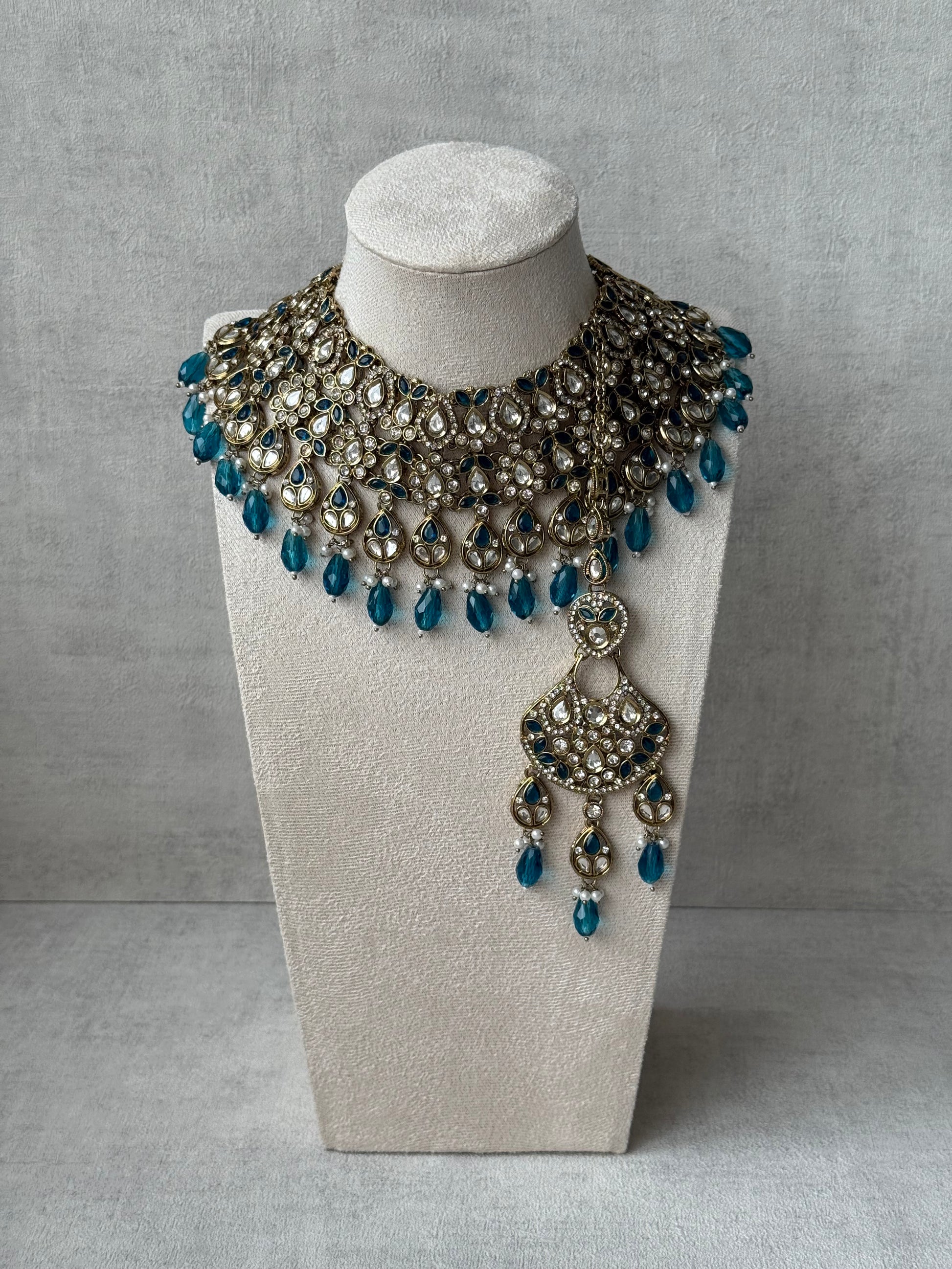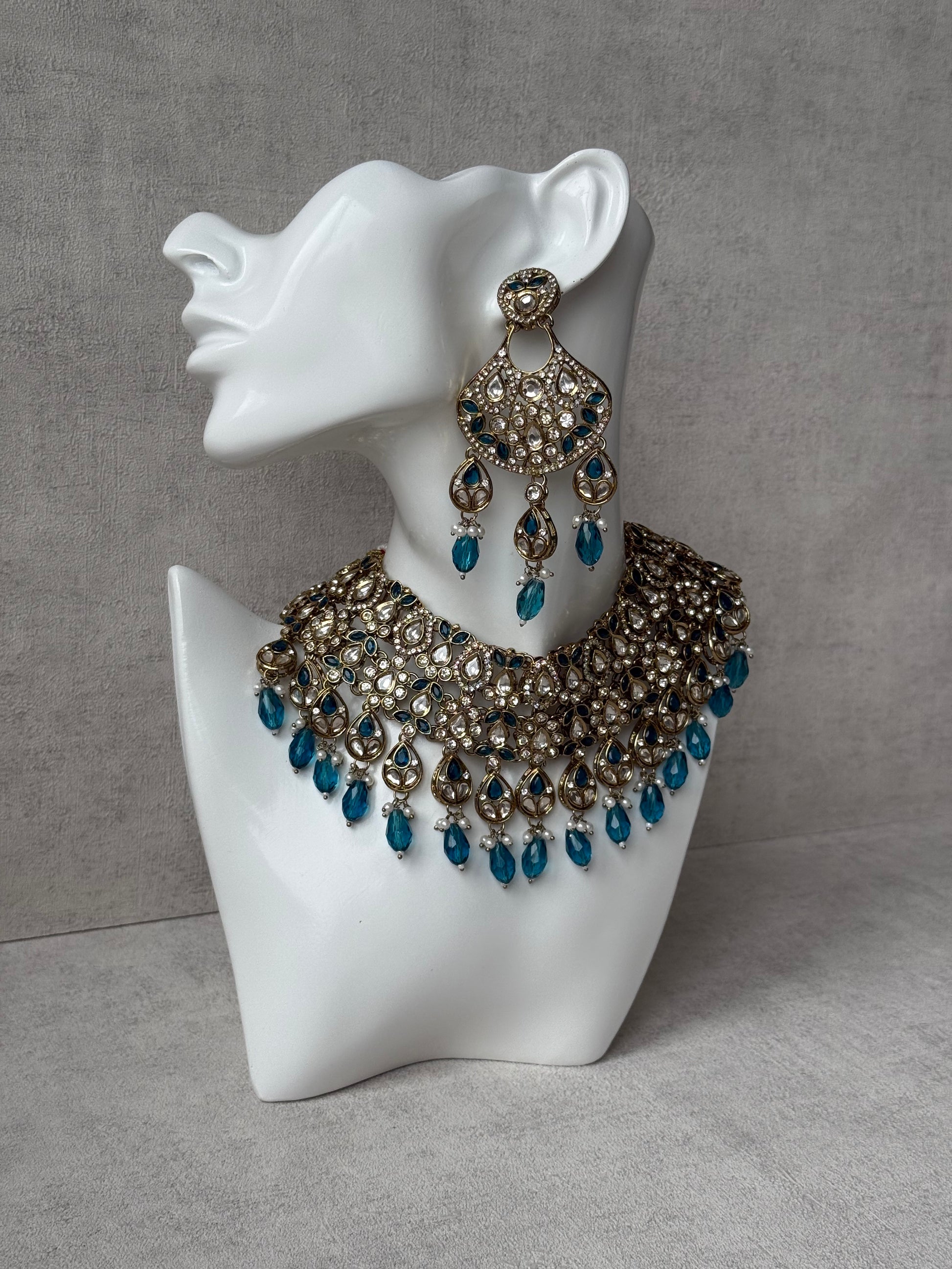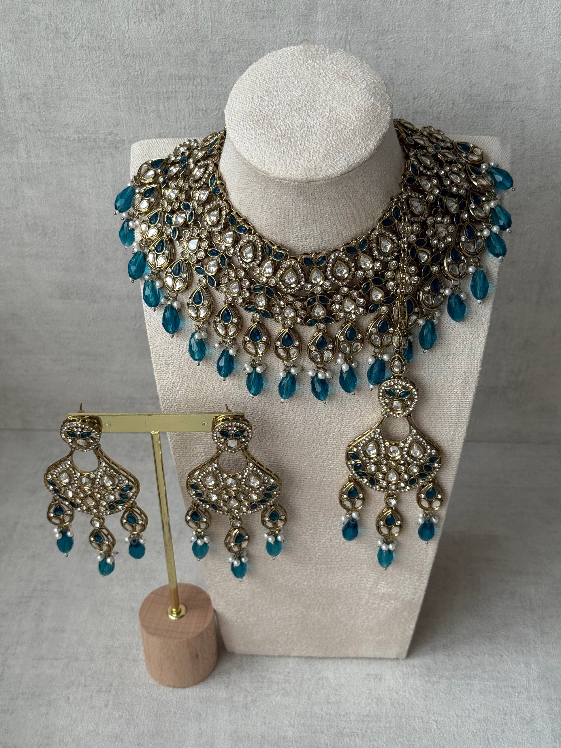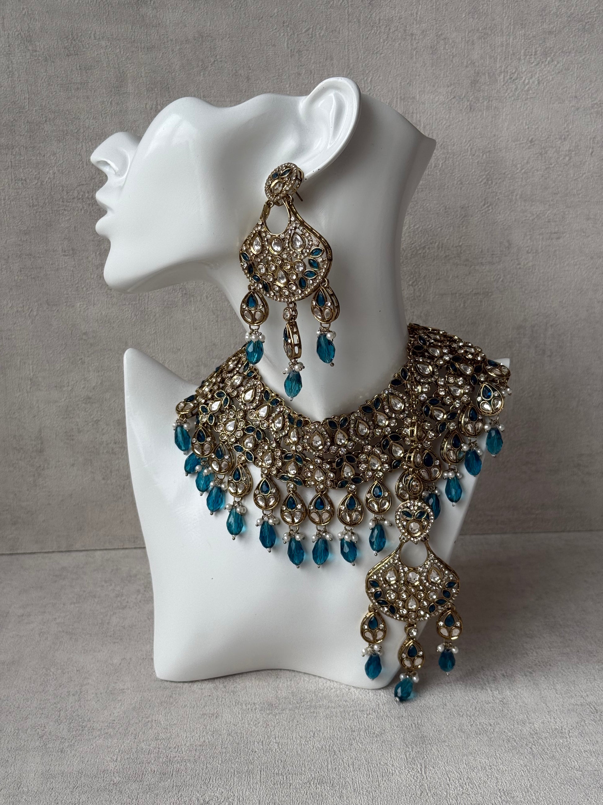 Whether styled with a deep emerald, sapphire, or ivory ensemble, this set promises to transform your look into one worthy of the spotlight. It’s ideal for brides seeking a bold, royal aesthetic or for anyone looking to make a statement at a festive event. The combination of antique gold tones with cool jewel-blue beads evokes a balance of old-world charm and contemporary opulence.