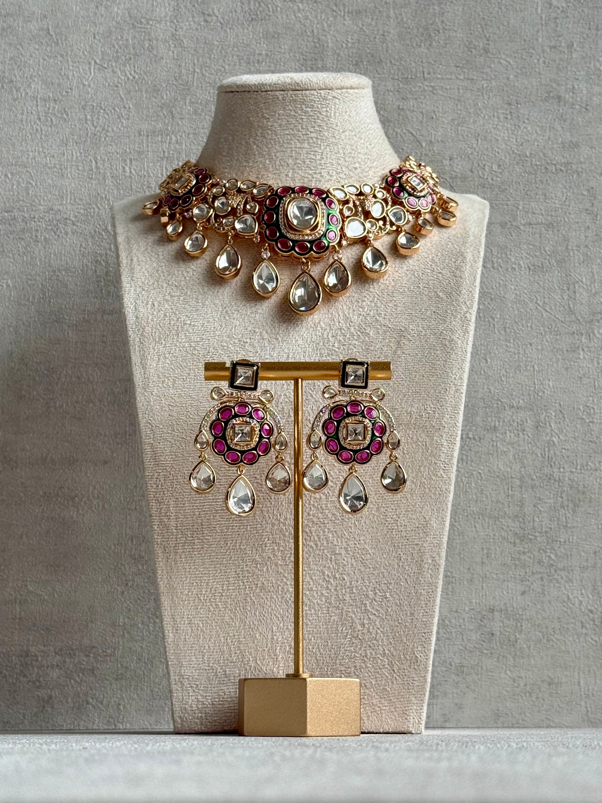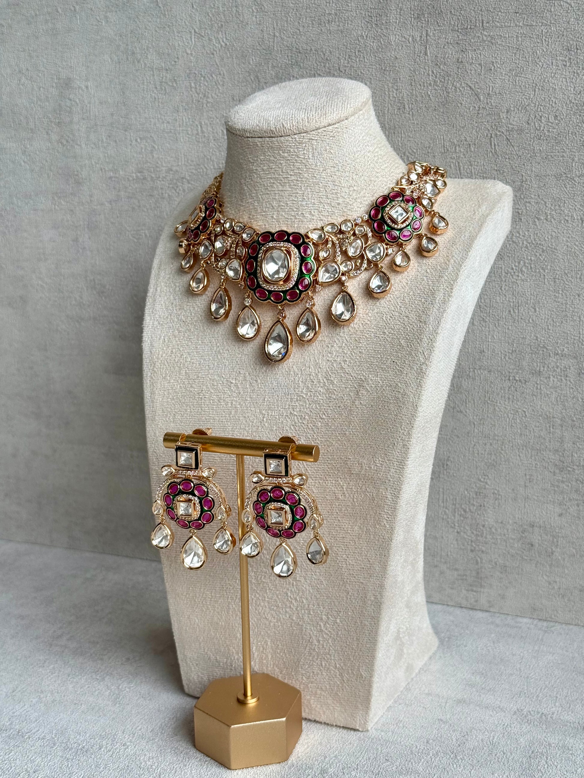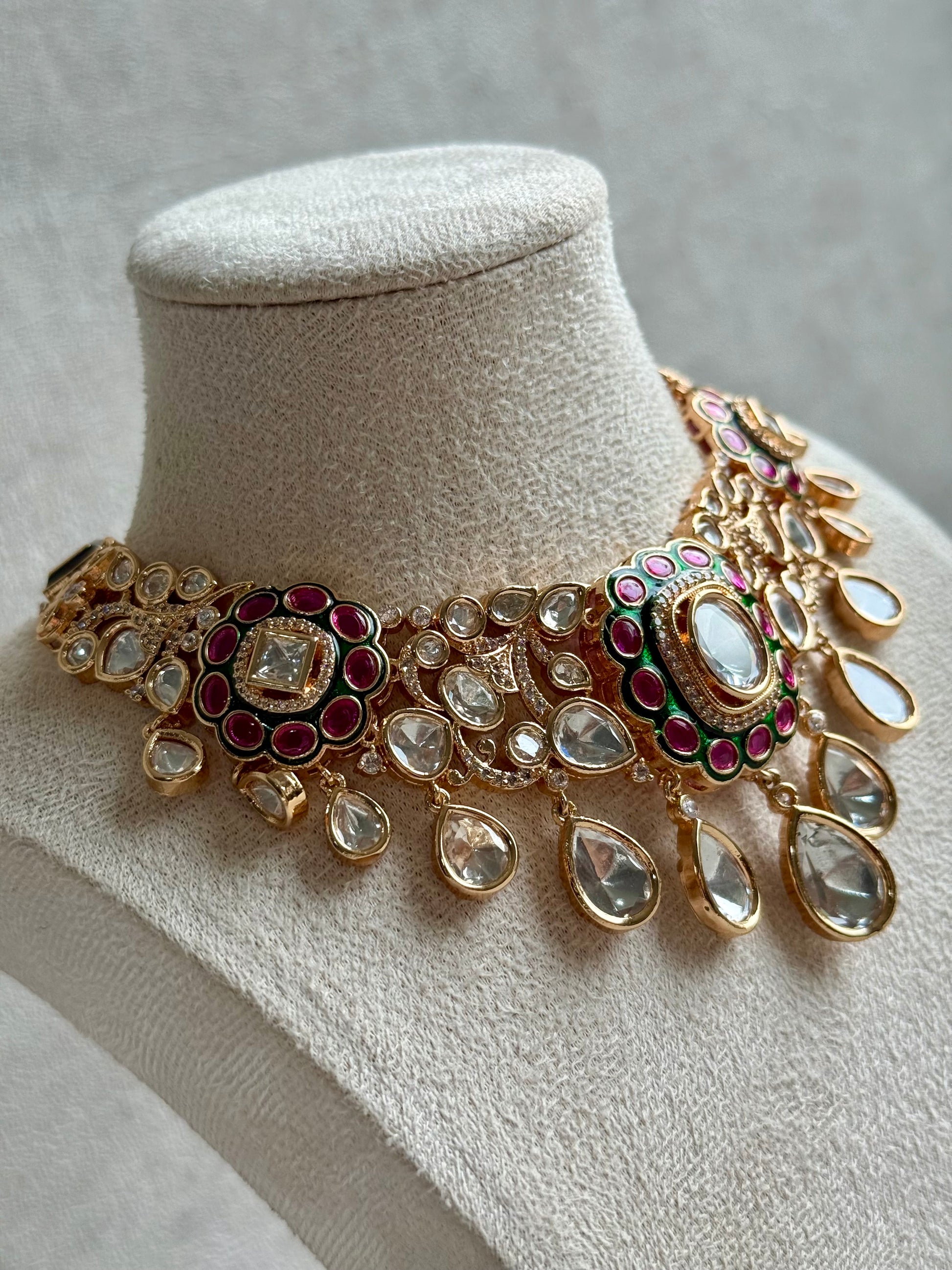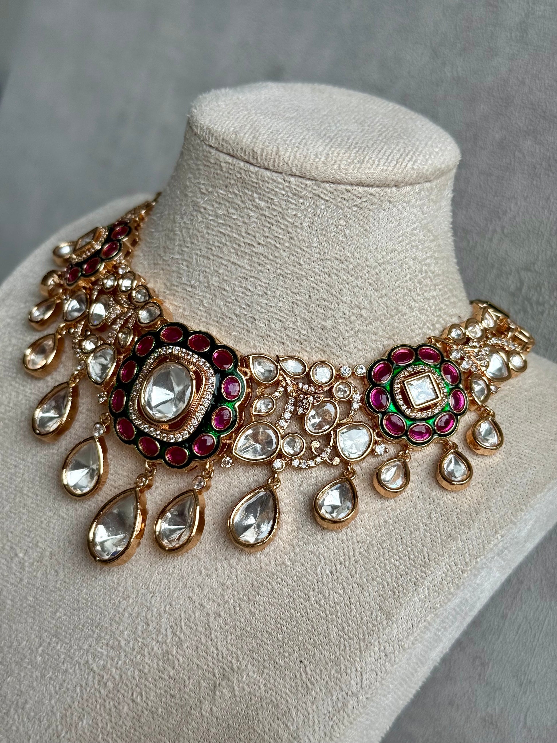 The necklace features a striking arrangement of kundan stones in varied cuts, bordered with soft pink and emerald green enamel detailing. Each motif glimmers with mirror-cut brilliance, framed by polished gold accents and finished with cascading teardrop crystals that create a graceful sense of movement. The play of colour and light gives the piece its signature Ayura Designs glow — rich, luminous, and unmistakably elegant.