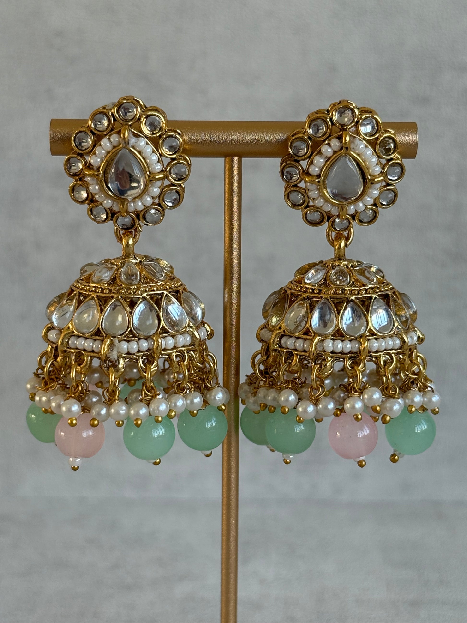 The Ayura Designs Iyla Set in Mint & Blush is a soft, romantic composition that balances traditional kundan craftsmanship with delicate pastel tones. Finished with classic ivory pearl drops, this colourway feels fresh, elegant, and effortlessly graceful.