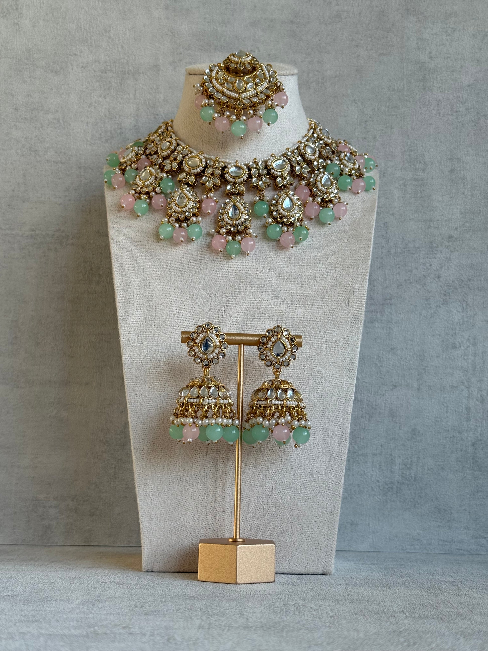 The necklace is adorned with pear and oval-cut kundan stones, arranged in a layered silhouette that sits beautifully along the neckline. Gentle mint and blush bead drops add a subtle play of colour, bringing light movement and a refined softness to the overall design.