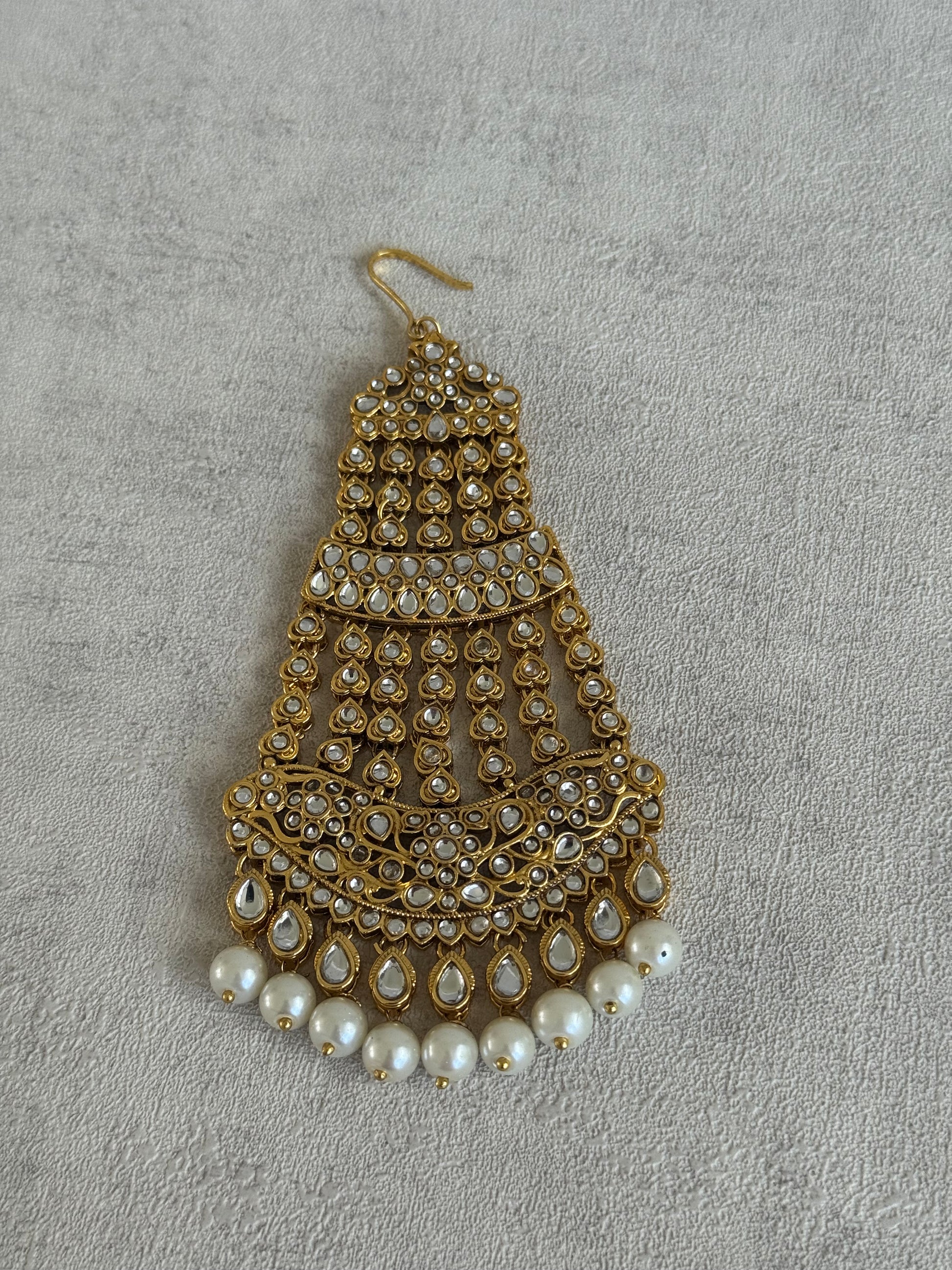 At the base of the passa, luminous pearl drops bring softness and movement, gently swaying with every turn of the head. These pearls complement the warm antique finish of the gold framework, adding balance and vintage allure to the overall design. The jhoomar sits beautifully on the side of the head and is perfect for traditional mehndi, baraat, or walima ensembles—bringing a Mughal-inspired aura to your final look.