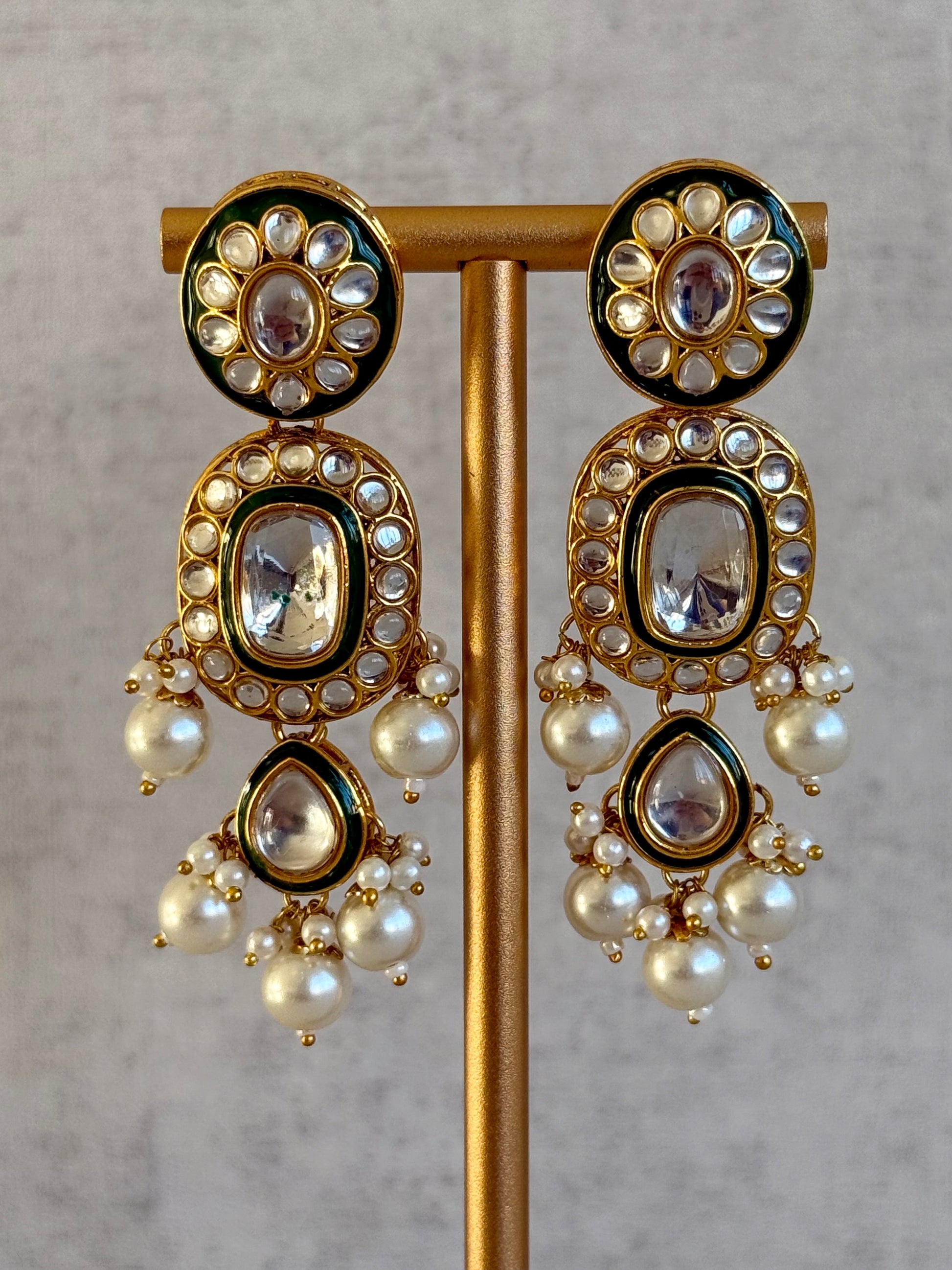 Soft ivory pearl drops add an elegant contrast, bringing movement and a refined bridal feel to the design. Each element is carefully balanced to feel luxurious without overpowering.