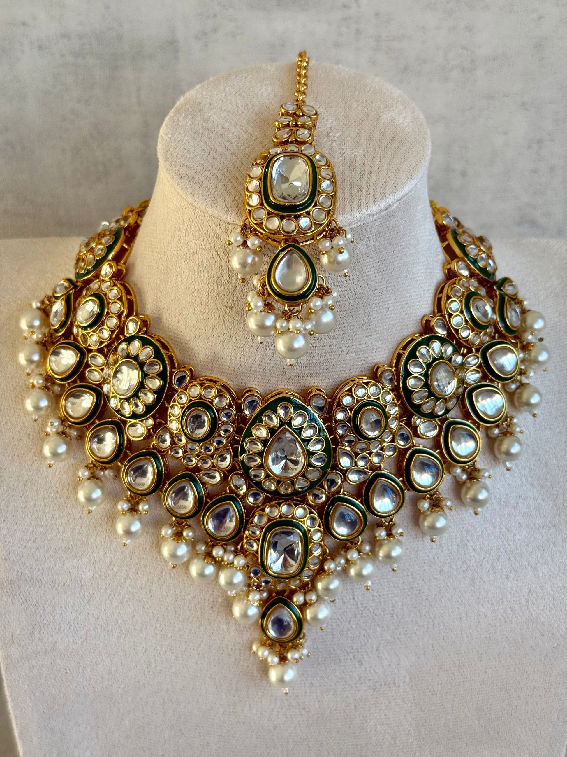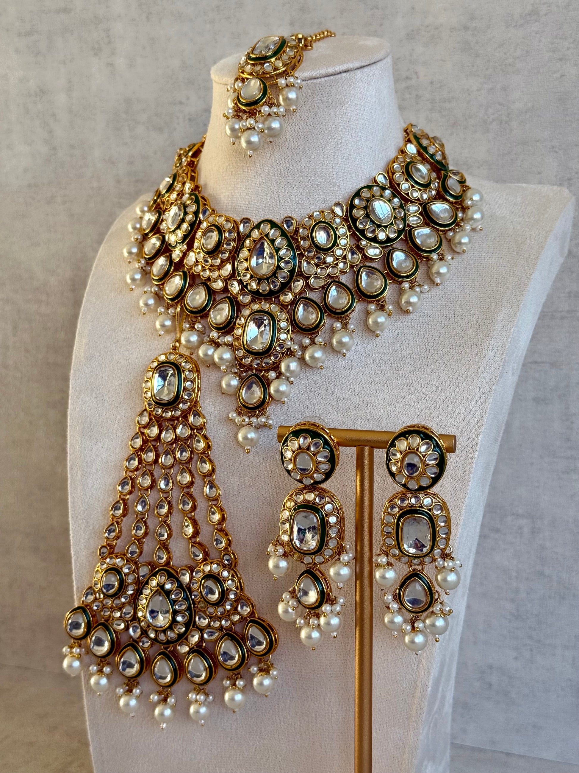 The matching earrings echo the necklace’s motifs, finished with pearl clusters for a cohesive and polished look. The coordinating tikka and passa complete the set, making it ideal for full traditional styling.