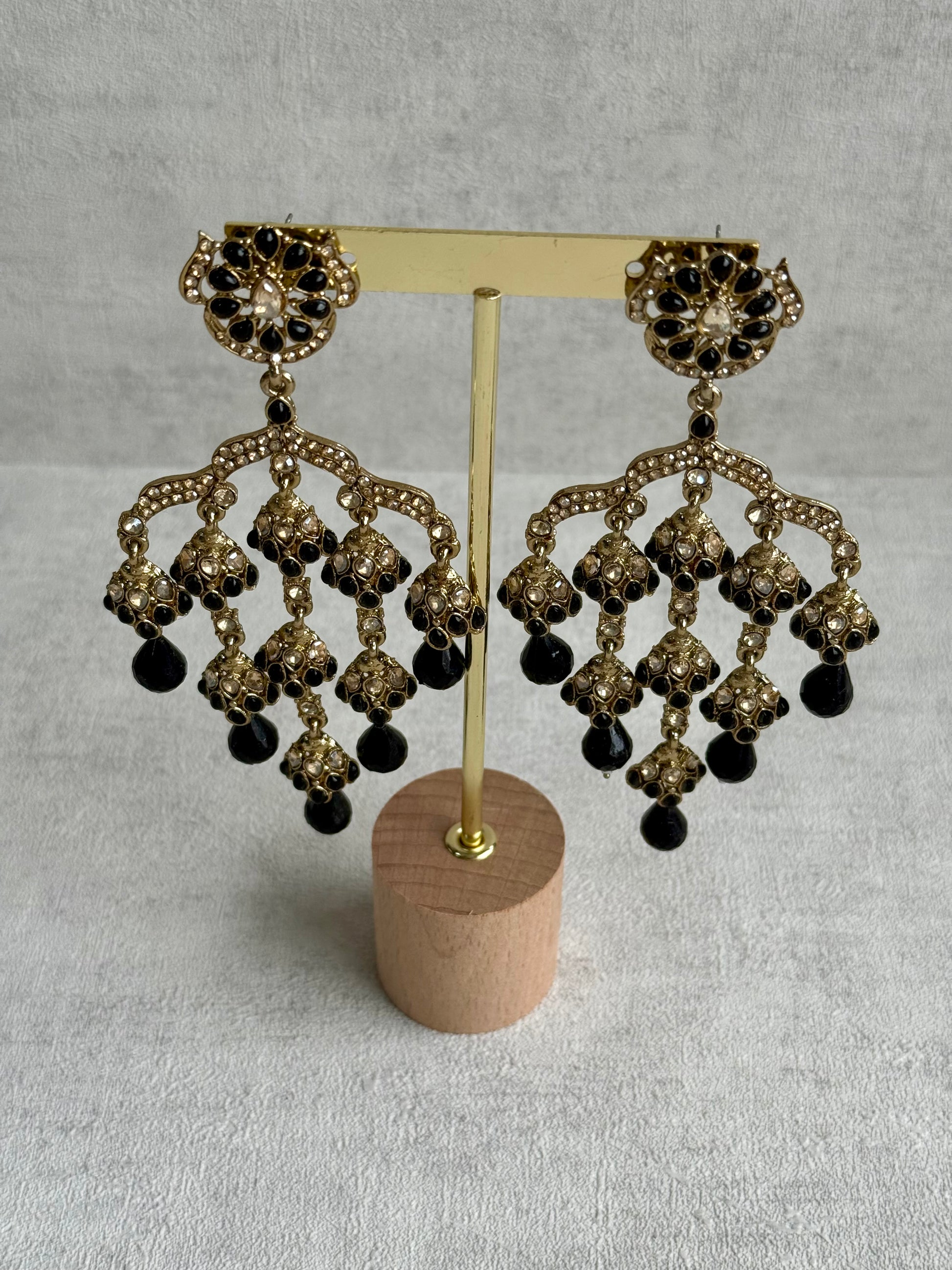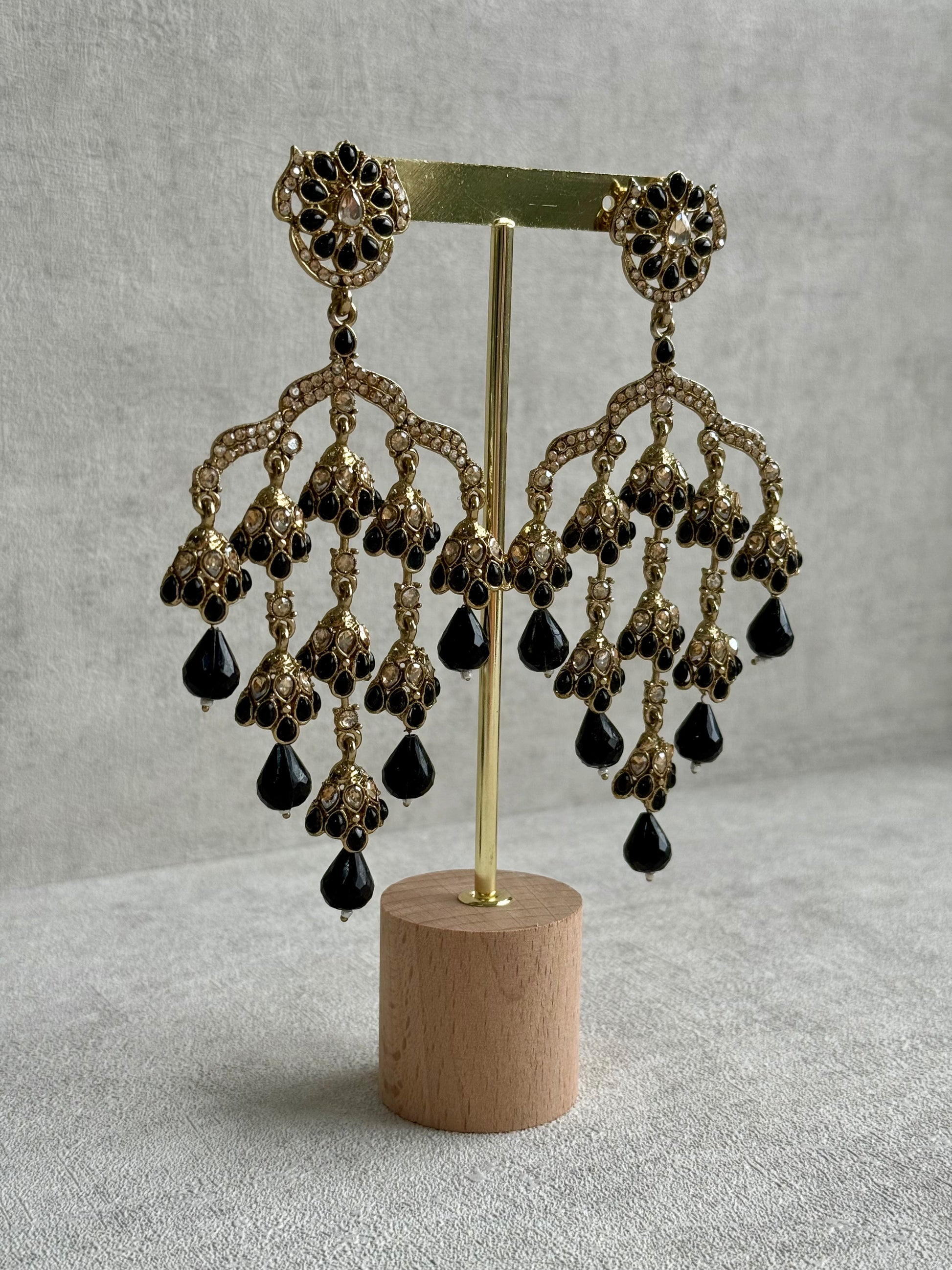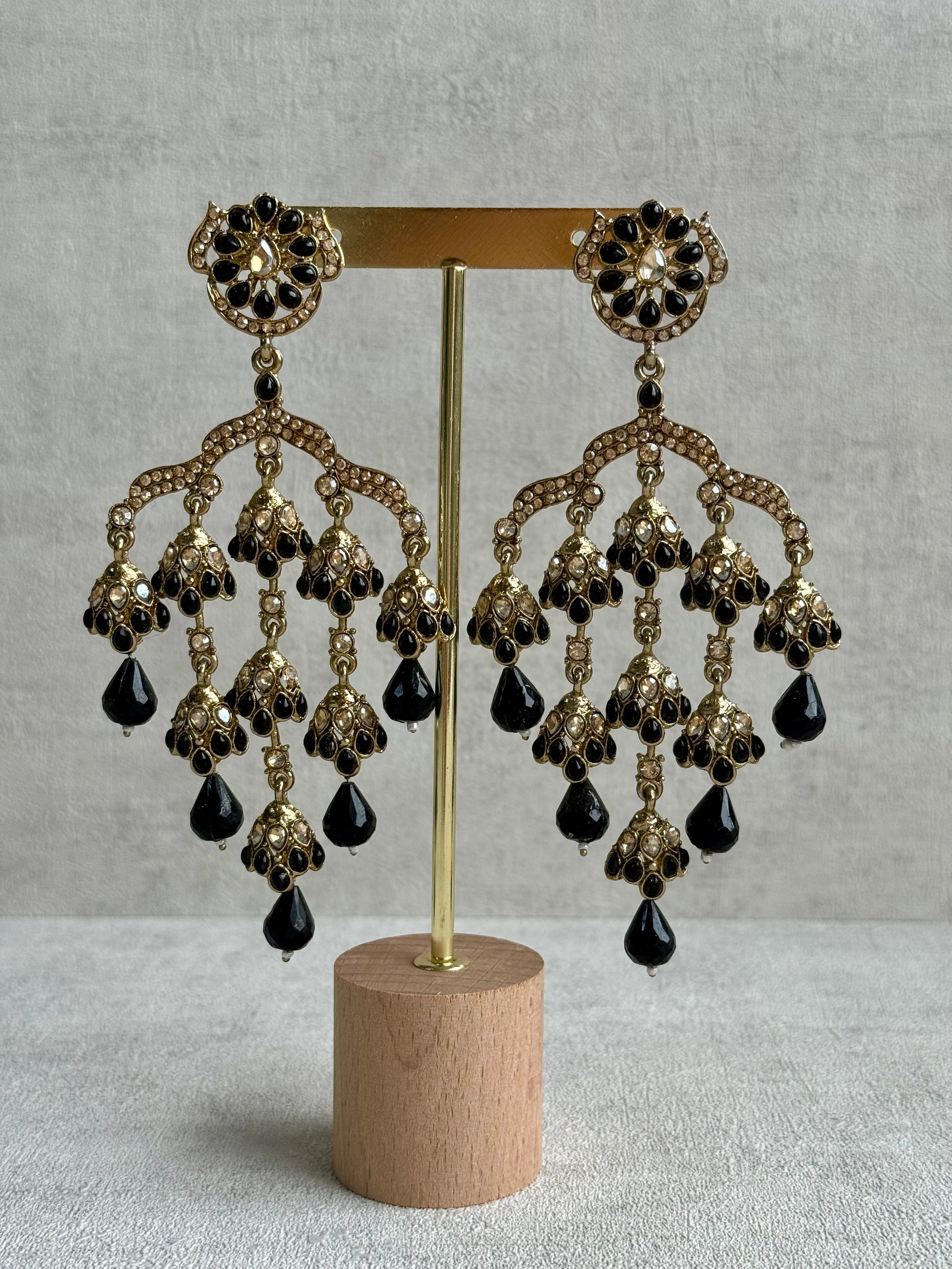 The earring tops are designed with intricate petal-shaped detailing, set with black and champagne-toned stones that bloom into a full floral motif. Below, a graceful arrangement of bell-like tiers unfurl in layers, each adorned with mini black bead accents and finished with larger teardrop beads for bold, rhythmic movement.