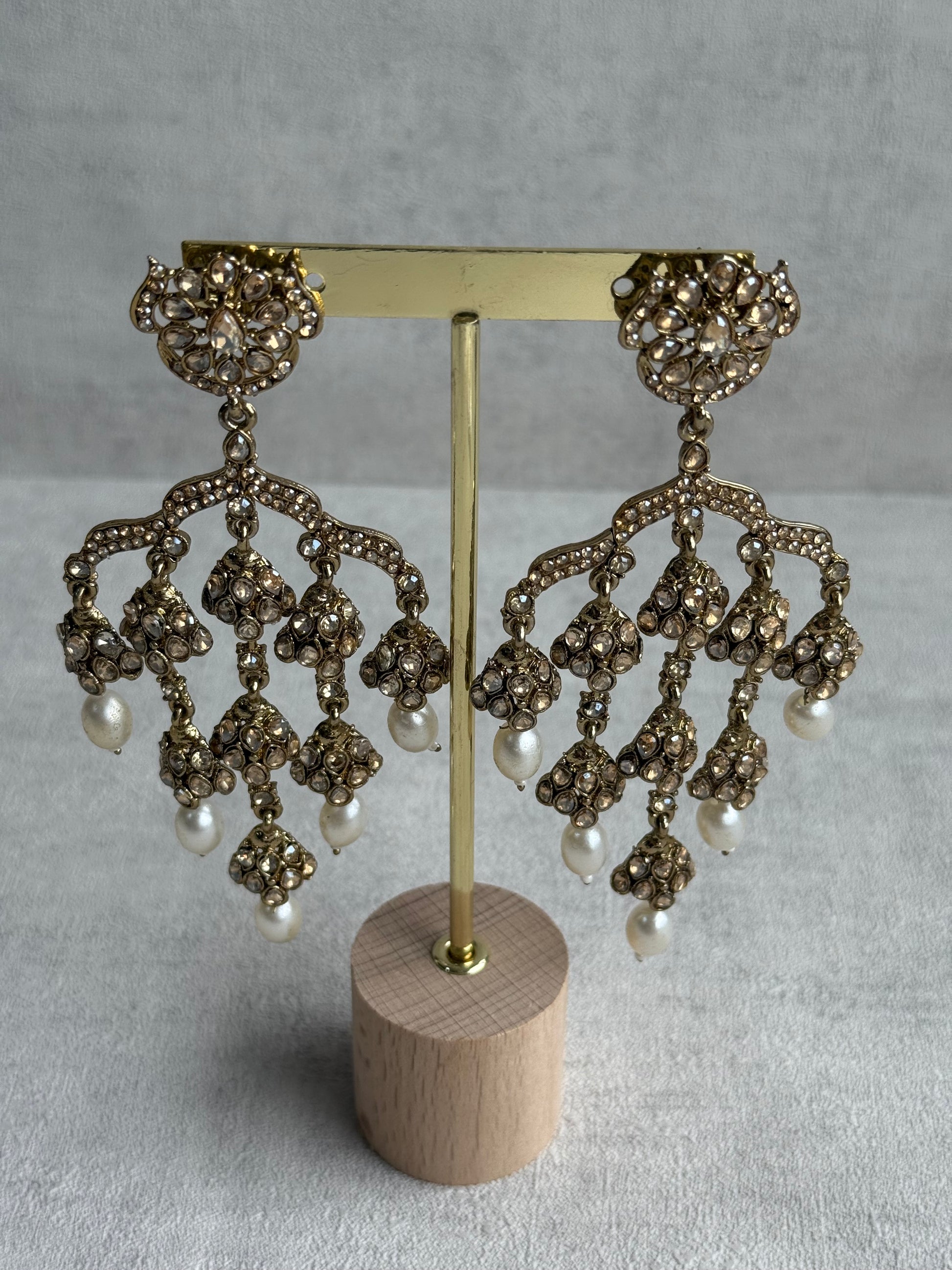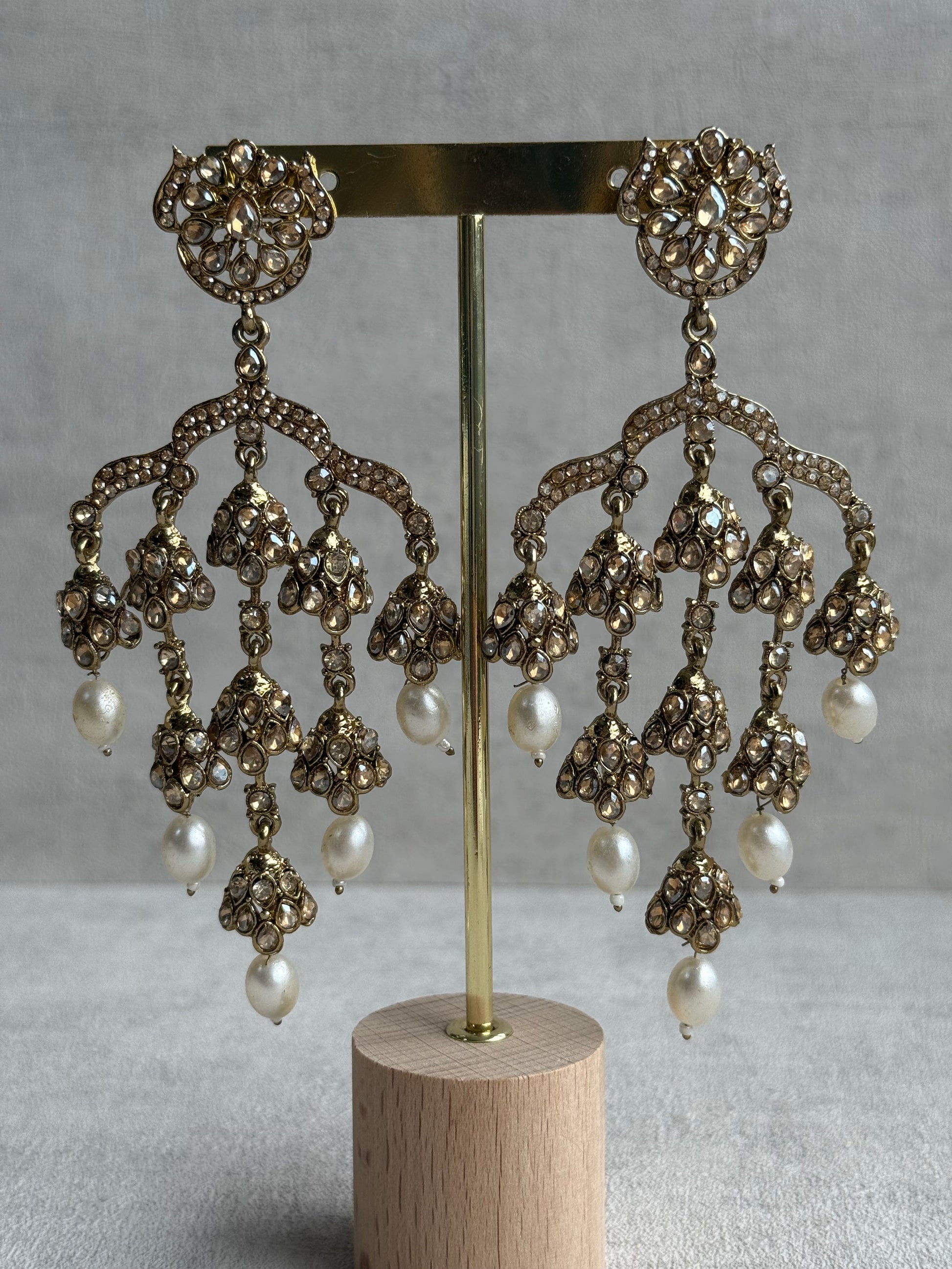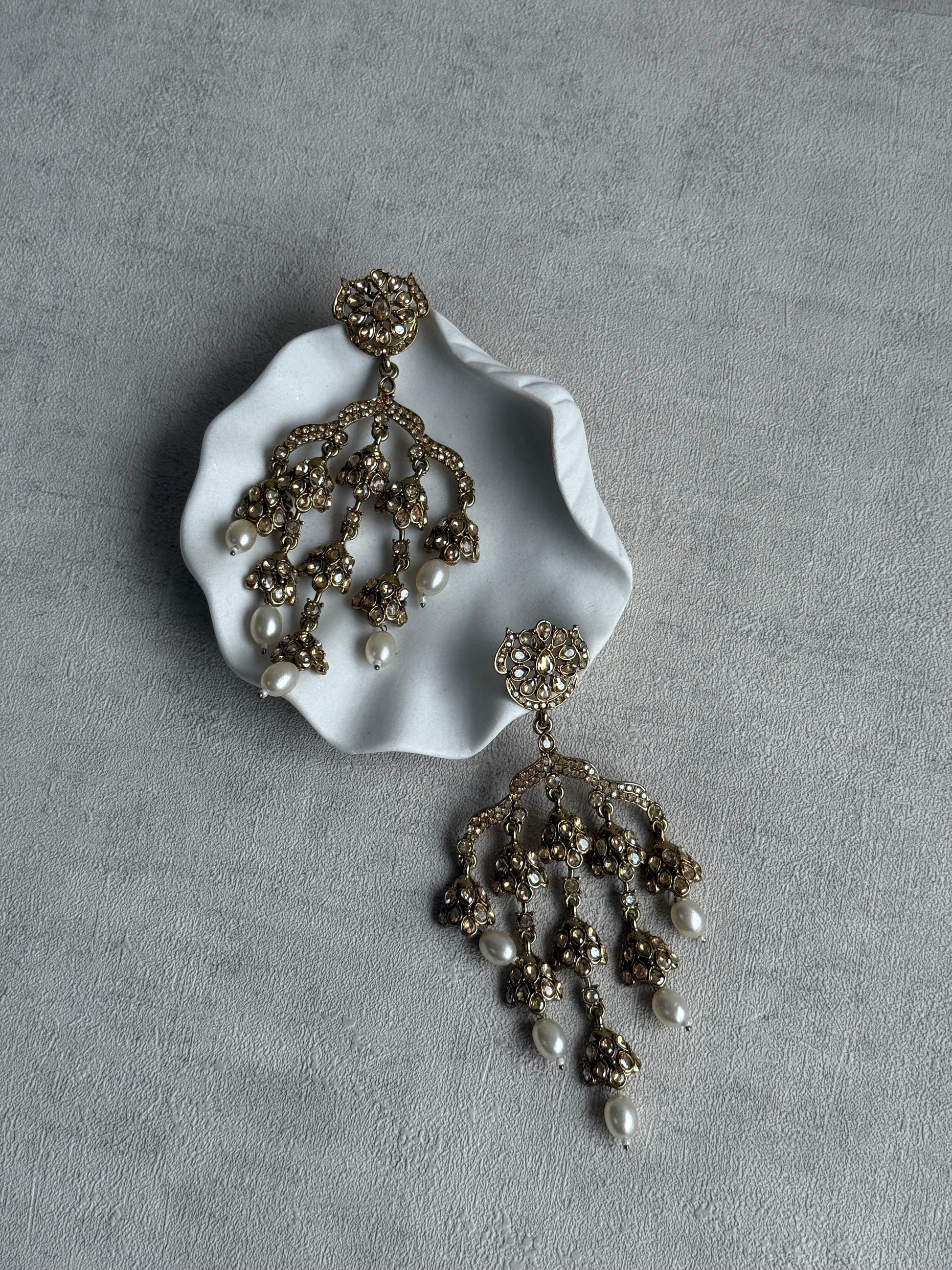 The Jasmine Earrings in Ivory are a timeless statement piece, pairing antique gold detailing with soft pearl drops. Their chandelier silhouette features layered domes adorned with mirror-cut accents, creating an elegant balance of sparkle and grace.