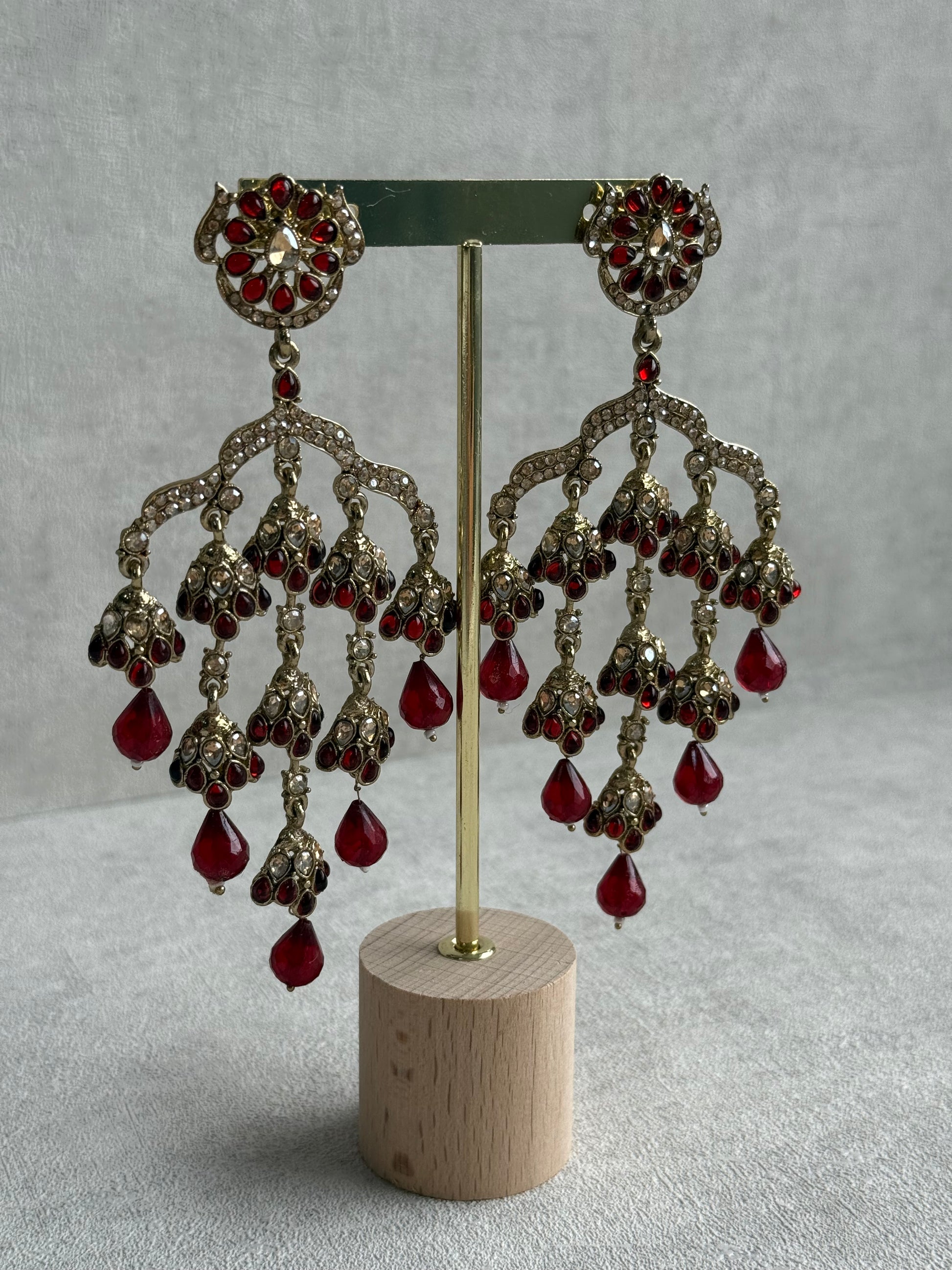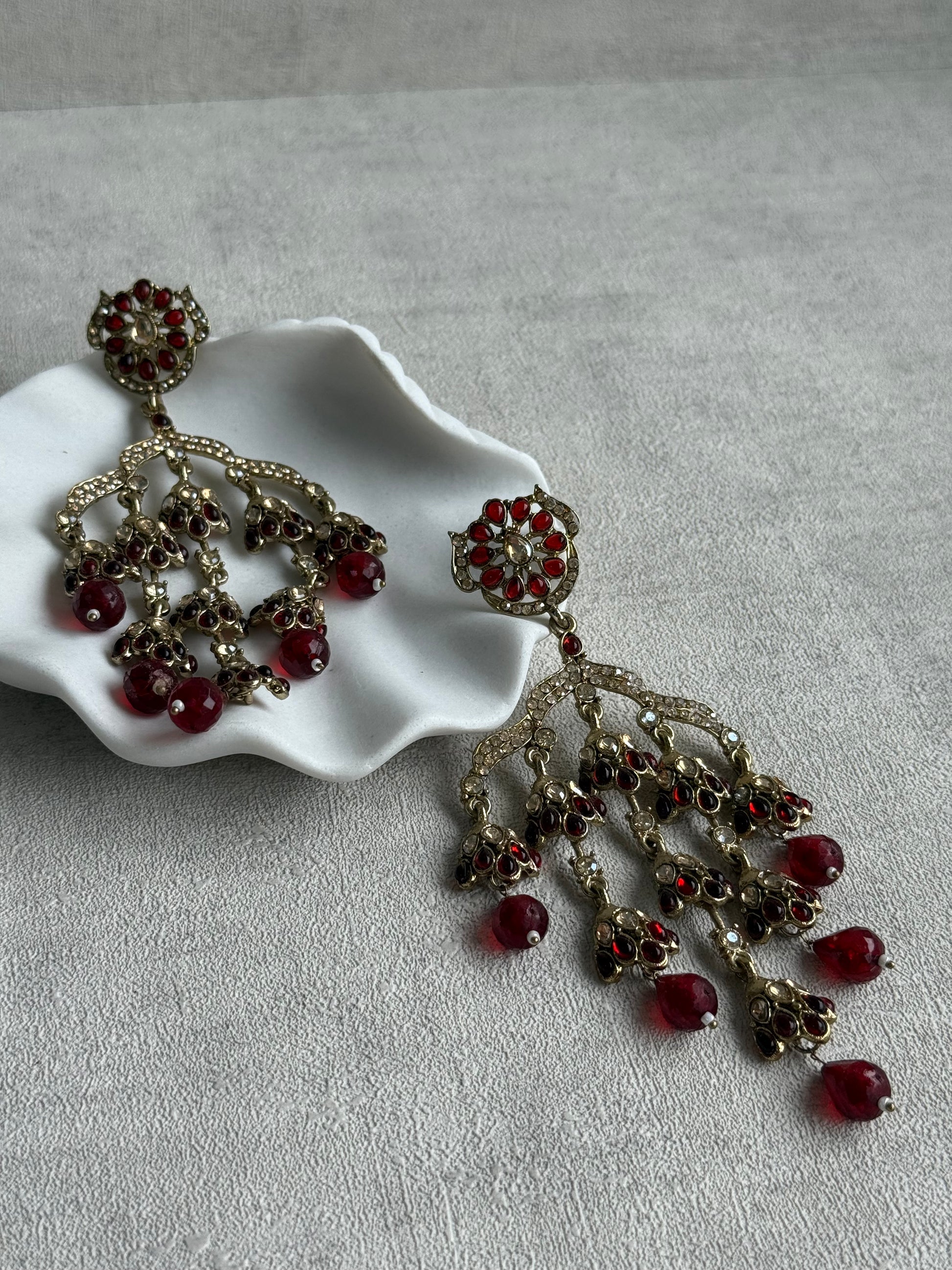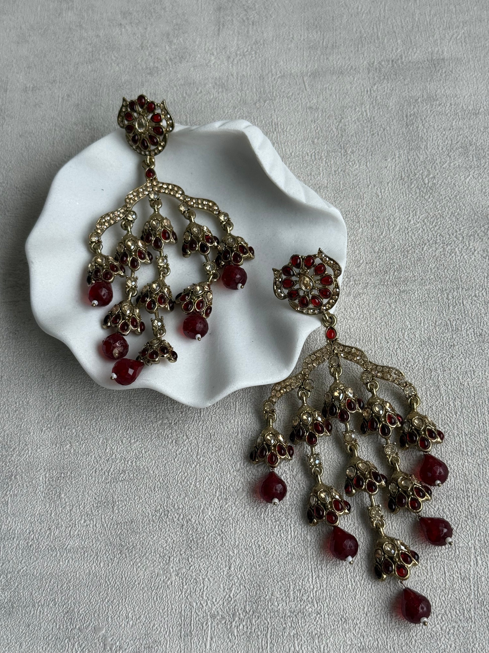 The darker tone of the maroon beads gives these earrings a more dramatic character compared to brighter ruby shades, making them ideal for evening occasions and bridal styling. Their striking silhouette ensures they frame the face with elegance and grandeur.