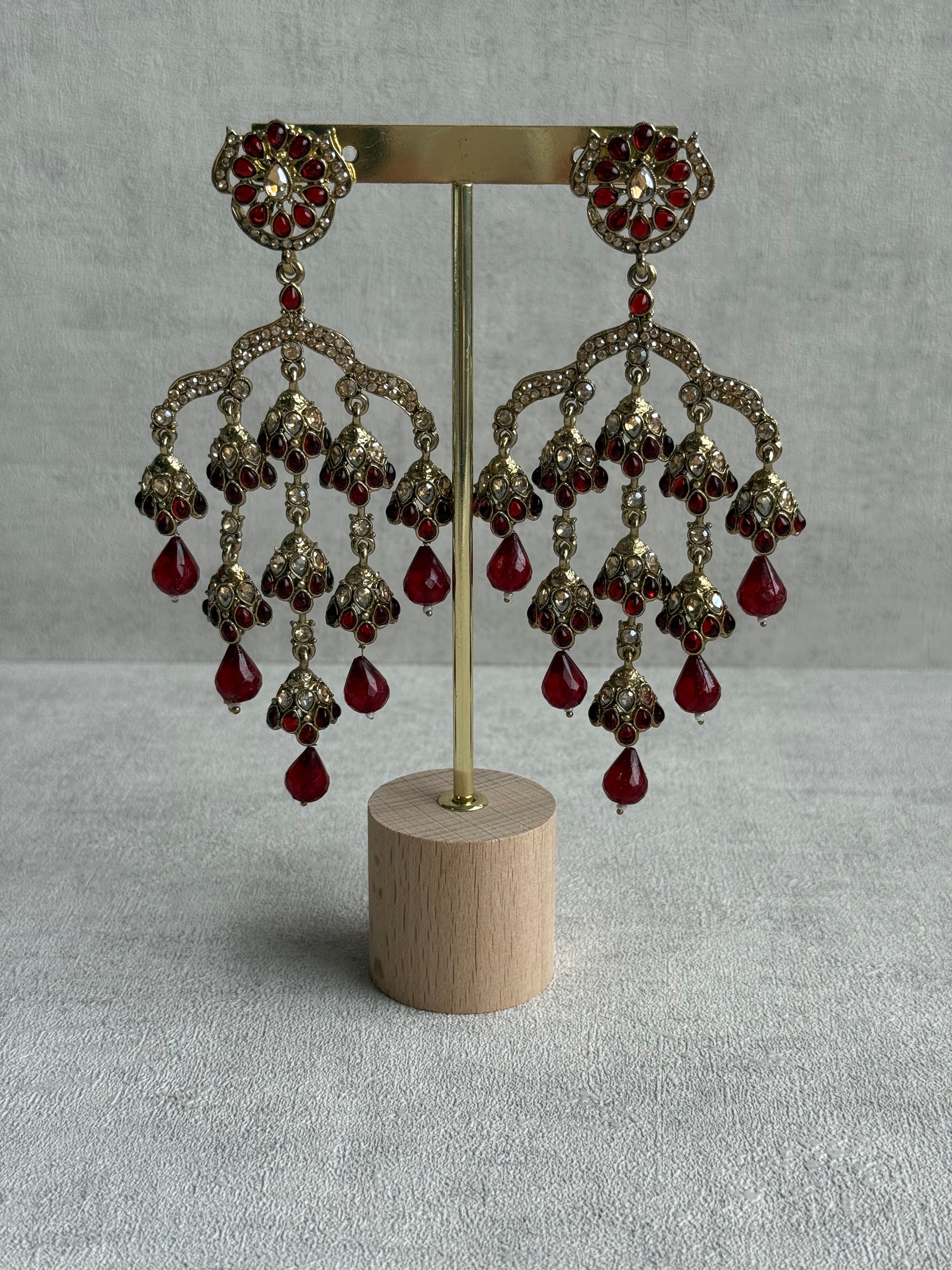 The Jasmine Earrings in Maroon are bold, regal, and timeless. Crafted with antique gold detailing, their chandelier silhouette features layered domes adorned with mirror-cut accents, finished with deep maroon bead drops that add richness and depth.