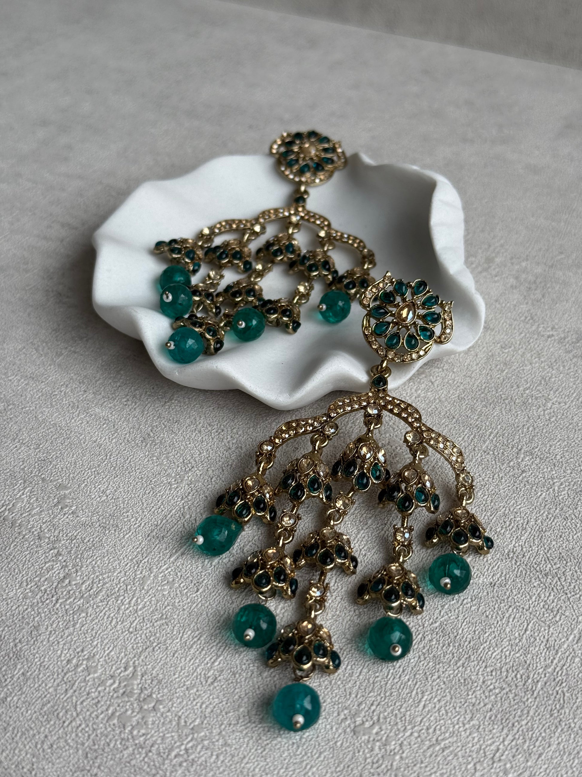 The Jasmine Earrings in Teal Green are a striking fusion of colour and craftsmanship. Designed in an antique gold finish, they feature cascading domes with mirror-cut detailing, finished with bold teal green bead drops that add a refreshing burst of vibrancy.