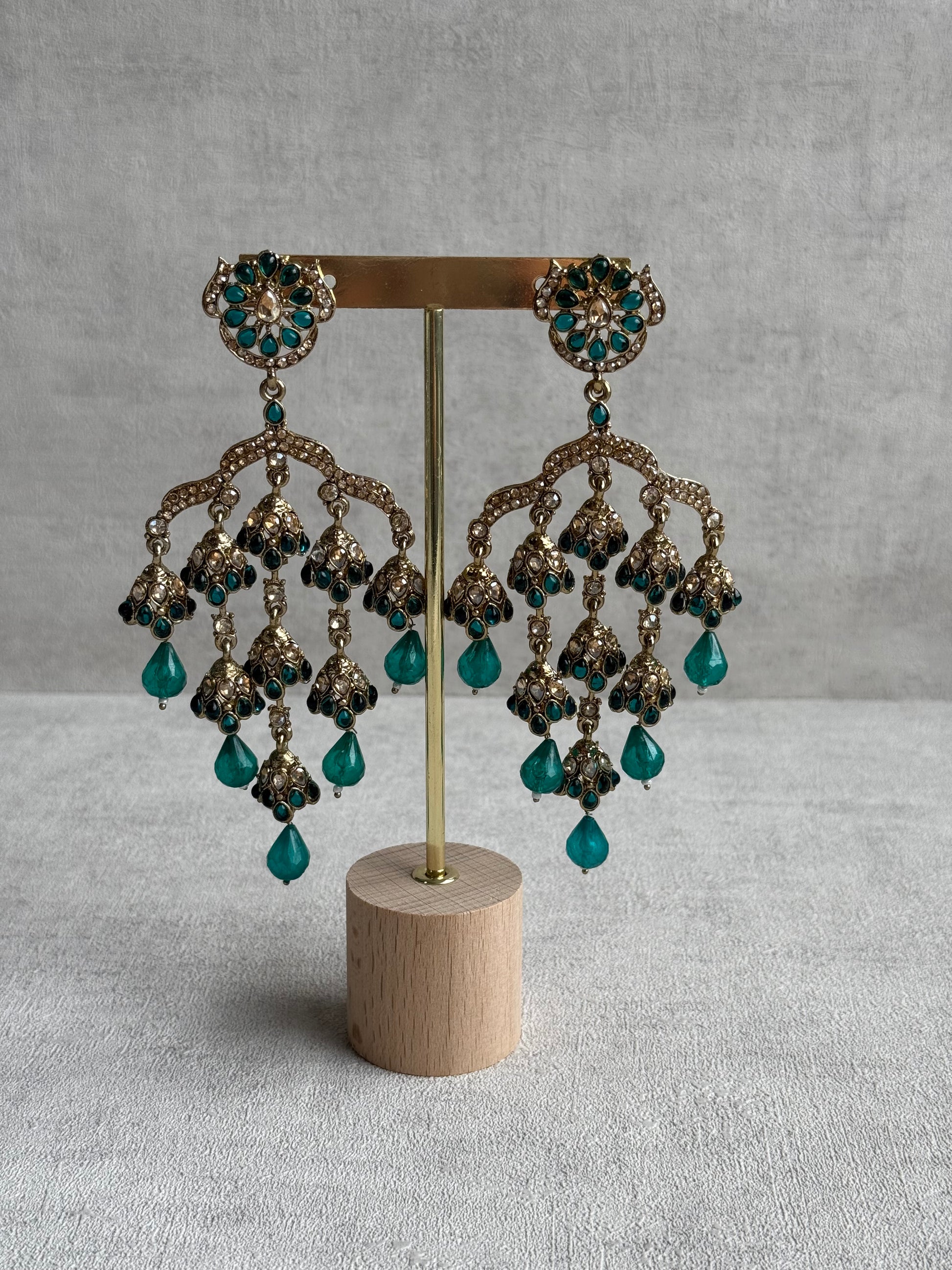 Their chandelier silhouette creates graceful movement, ensuring they catch the light with every step. The teal tone offers a unique alternative to classic emerald, blending blue and green hues for a modern yet regal look.