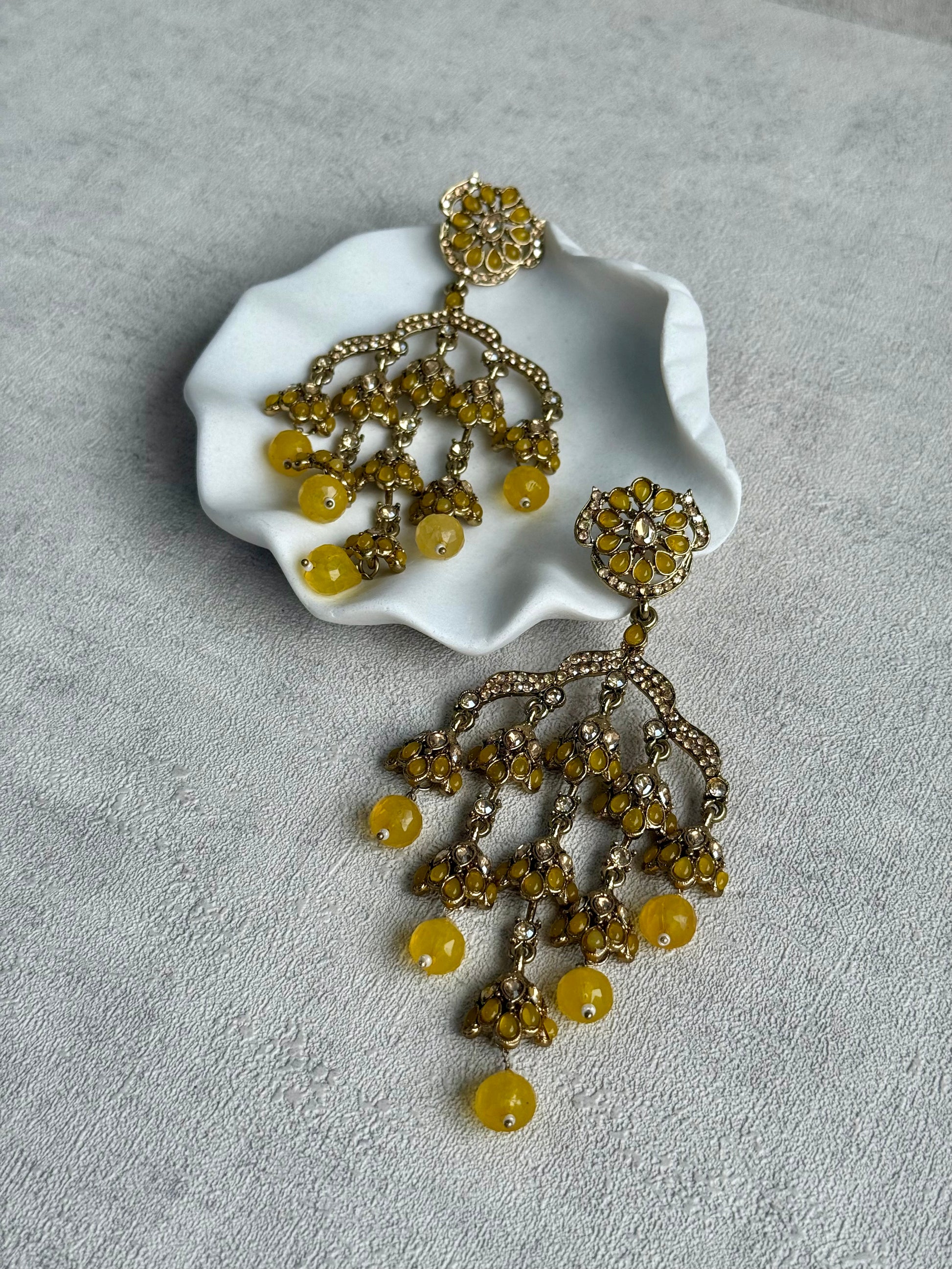 The top stud is framed with a dainty petal pattern, encrusted with yellow accents and a single mirror-cut centrepiece. From there, each layer is delicately strung with dangling clusters and luminous yellow bead drops, creating a sense of rhythmic movement and dramatic flair. The antique gold finish adds an old-world elegance that balances the vibrant tones with a rich, timeless glow.