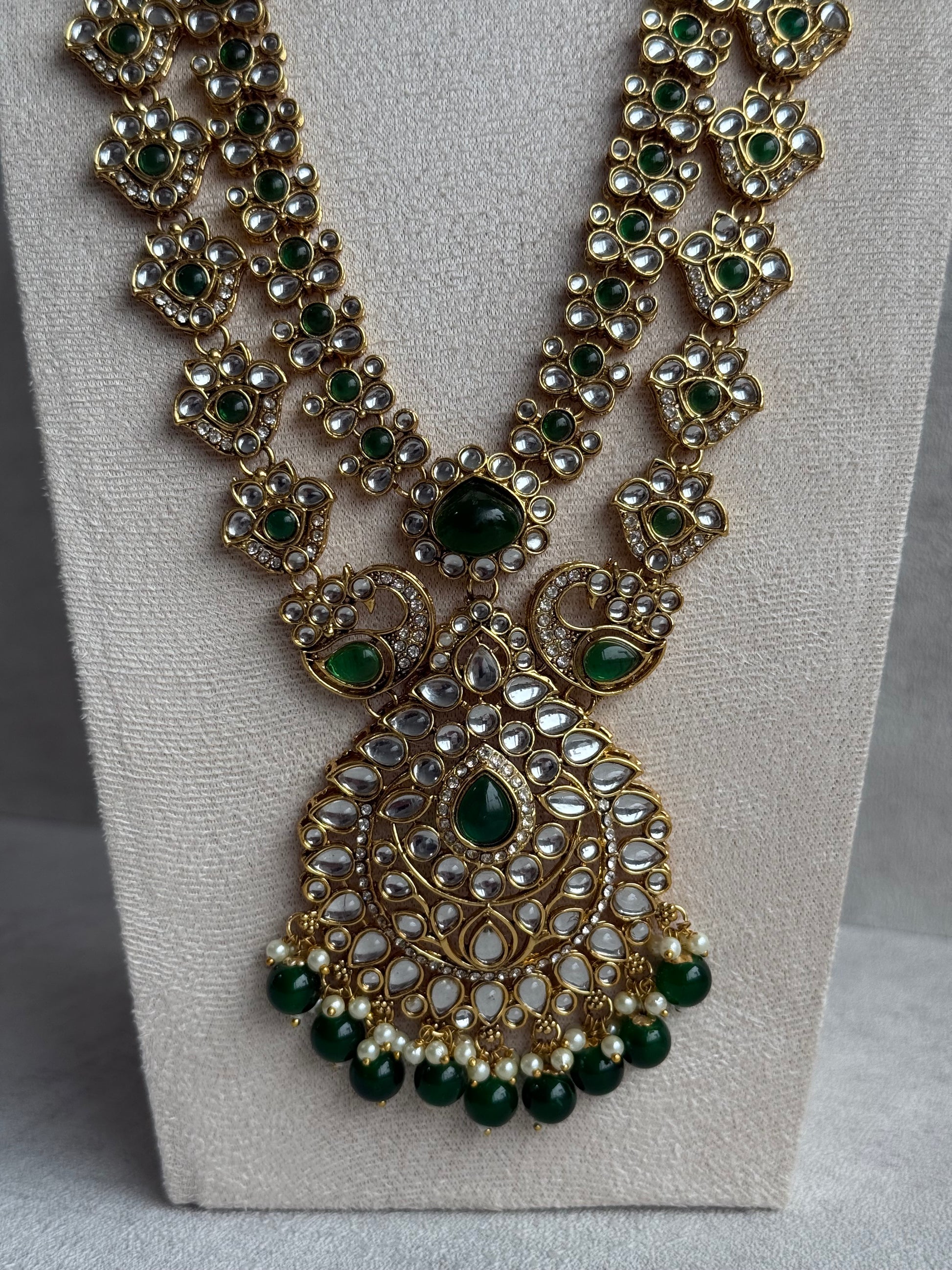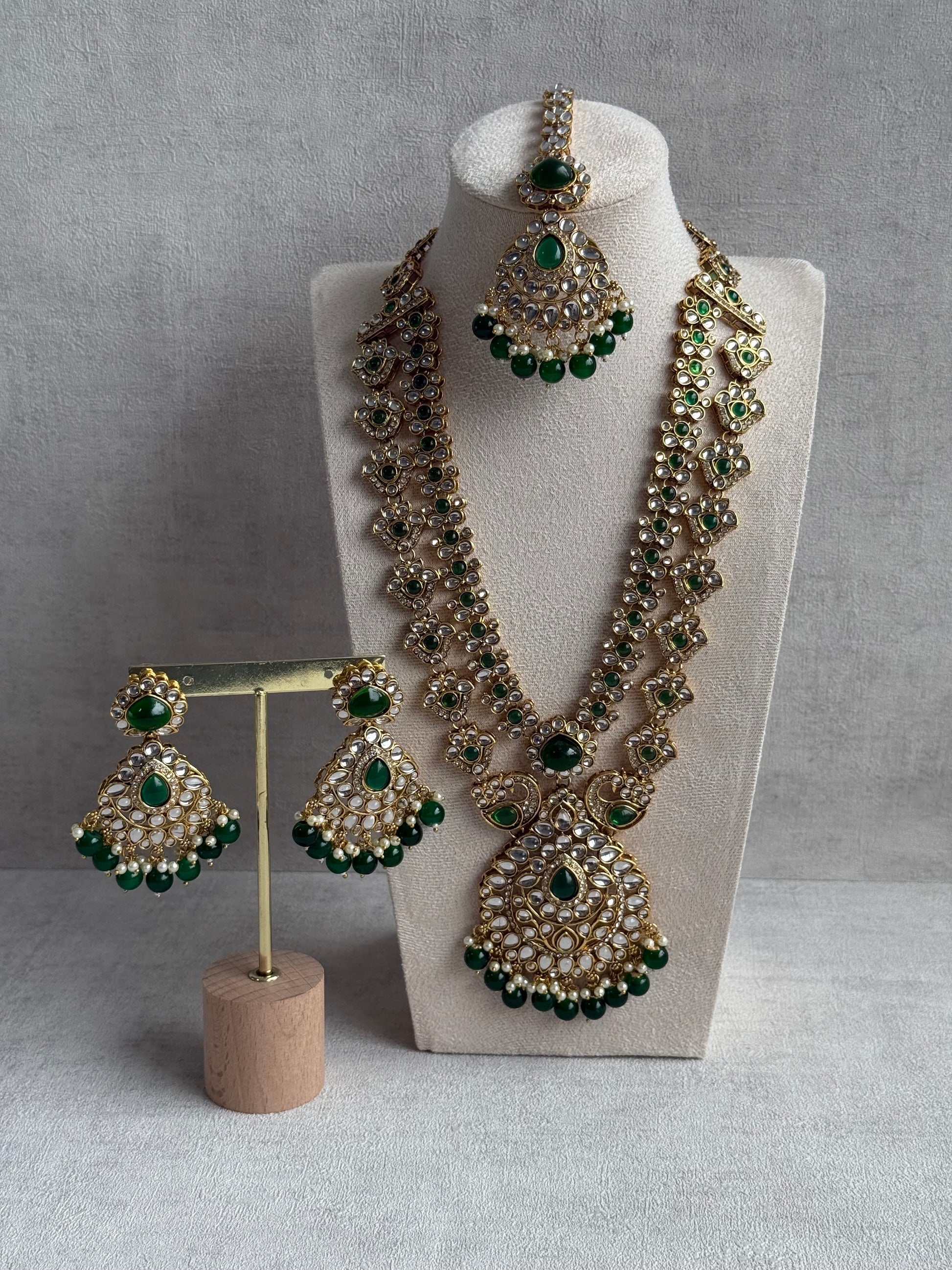 The statement necklace features a double-layered design, each tier adorned with delicate floral motifs and mirror-cut kundan stones framed by rich green enamel. At its centre lies a grand pendant, elegantly teardrop-shaped and encrusted with alternating emerald and clear stones, cascading into dainty clusters of pearls and green beads. The layered silhouette rests gracefully along the neckline, evoking the charm of heritage Indian jewellery with a modern refinement.