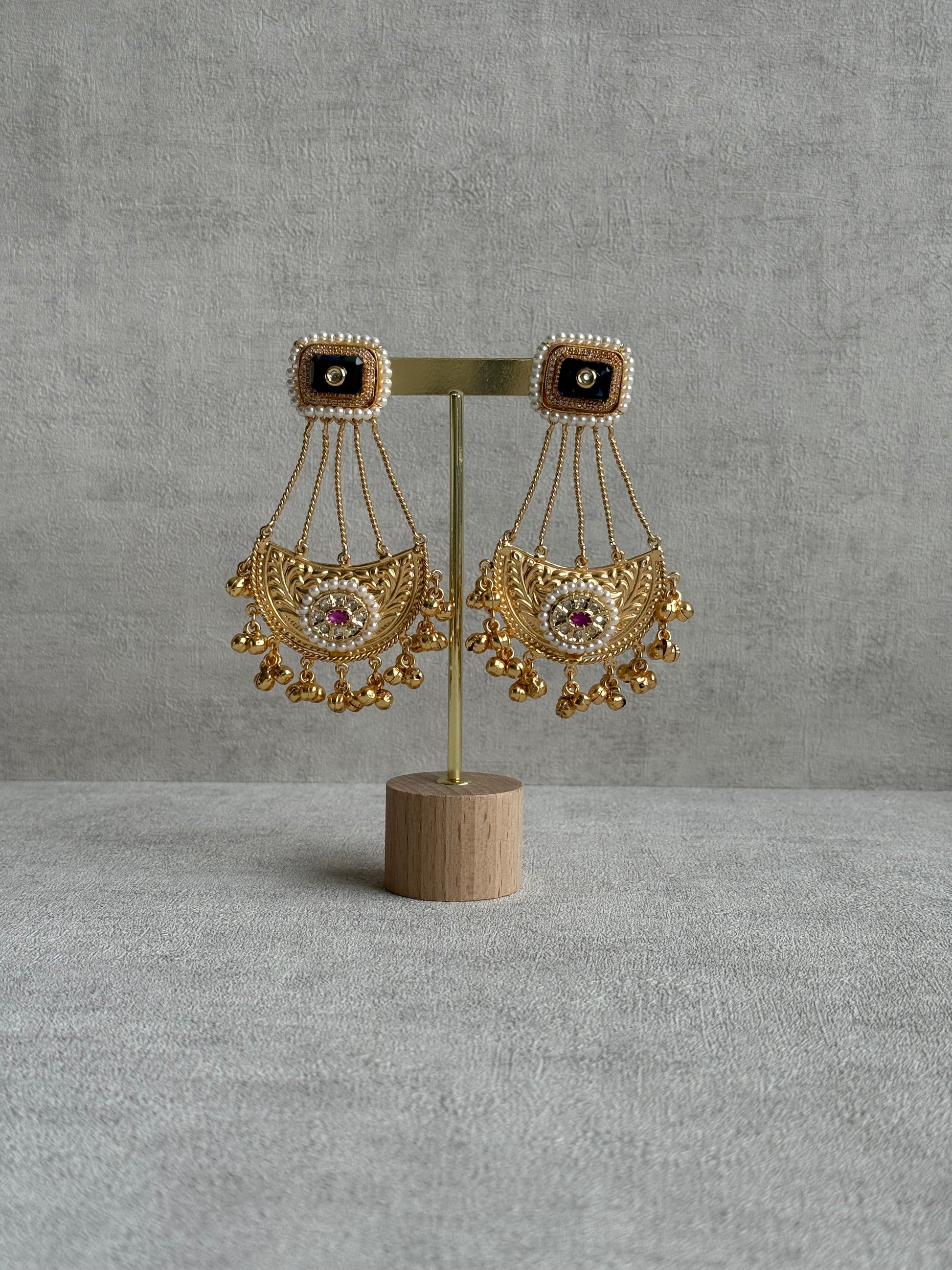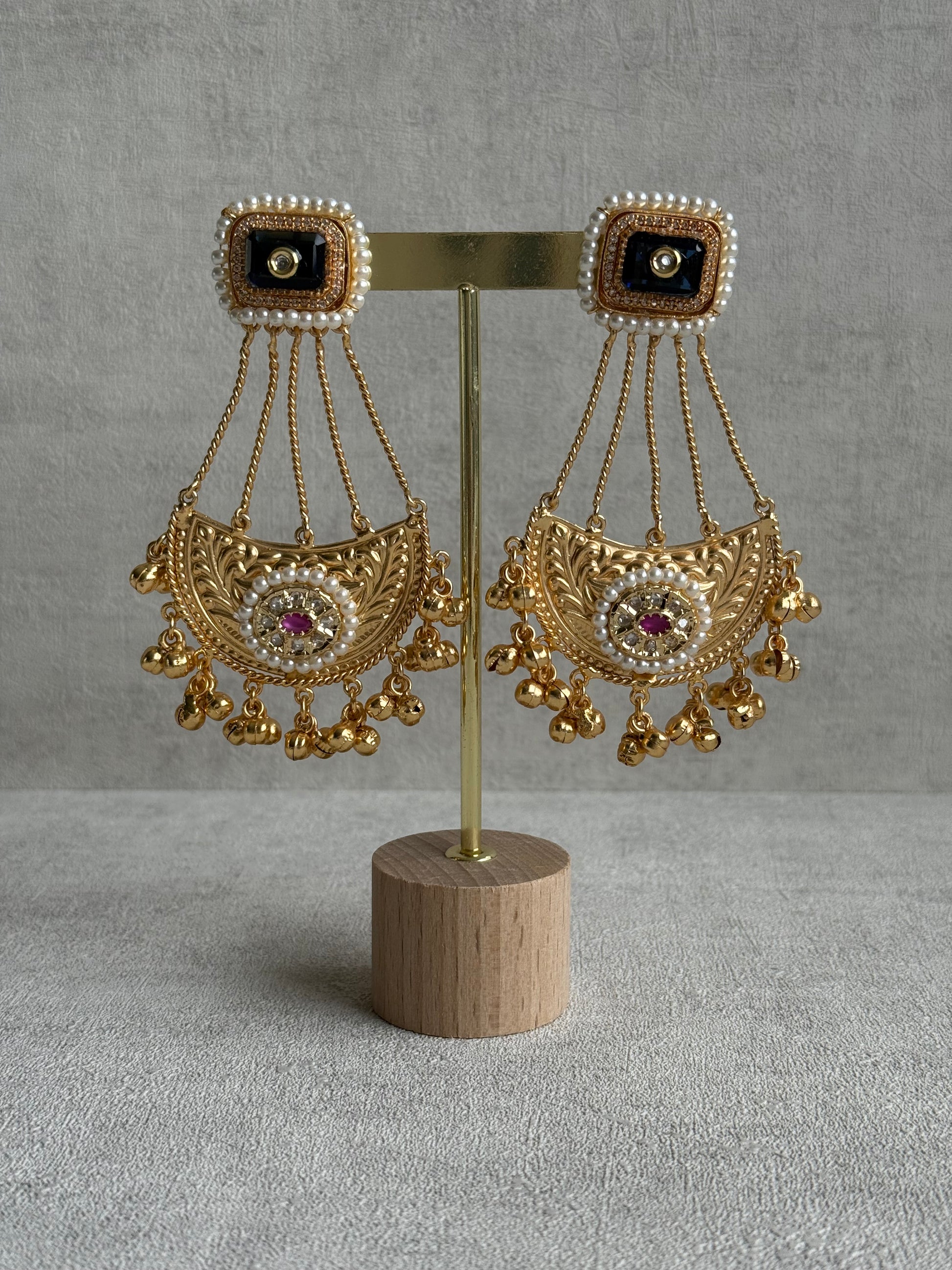 Ayura Designs Jheel Earrings – Navy Half-Moon Drops with Pearl Edging & Golden Ghungroos