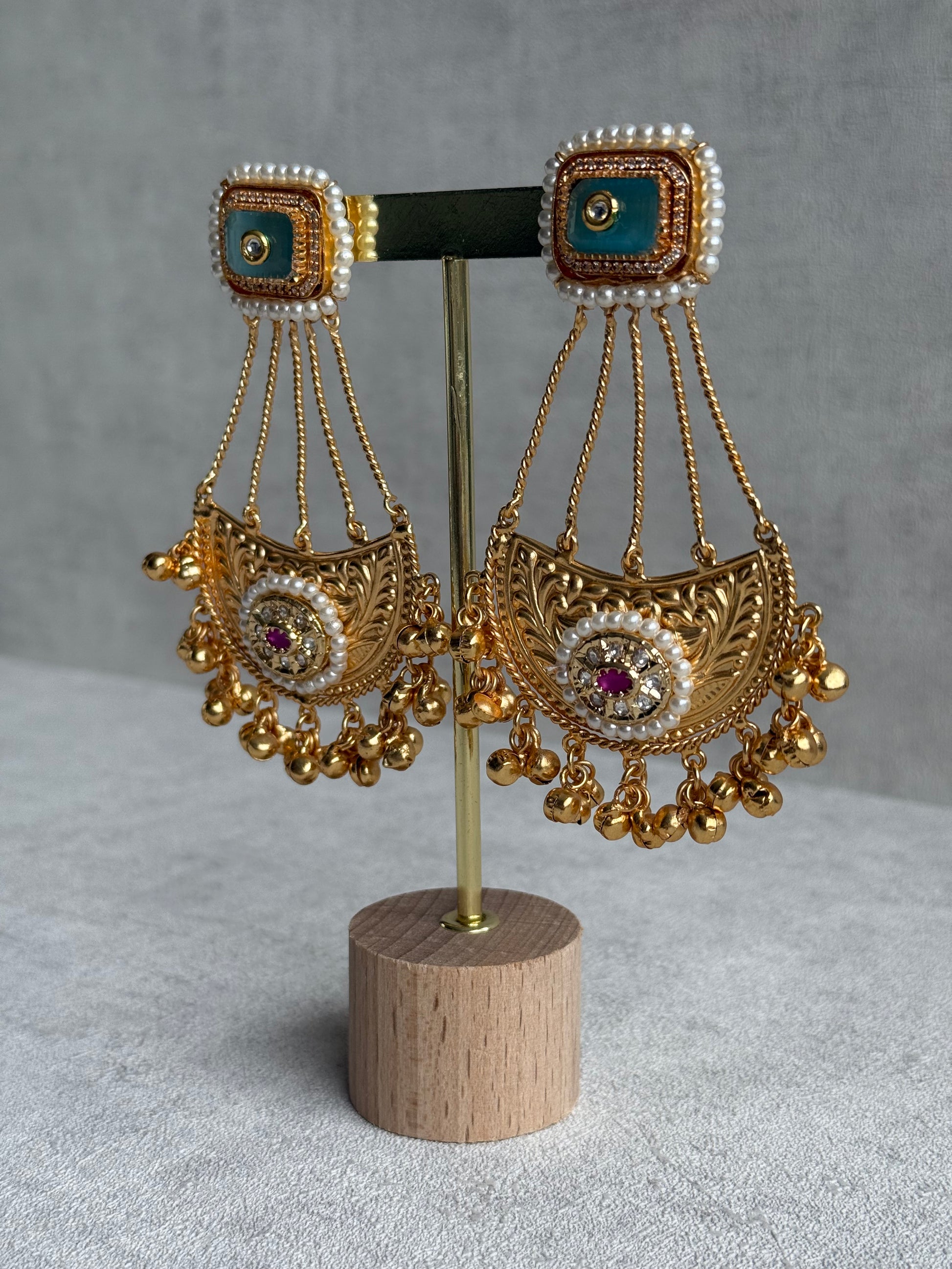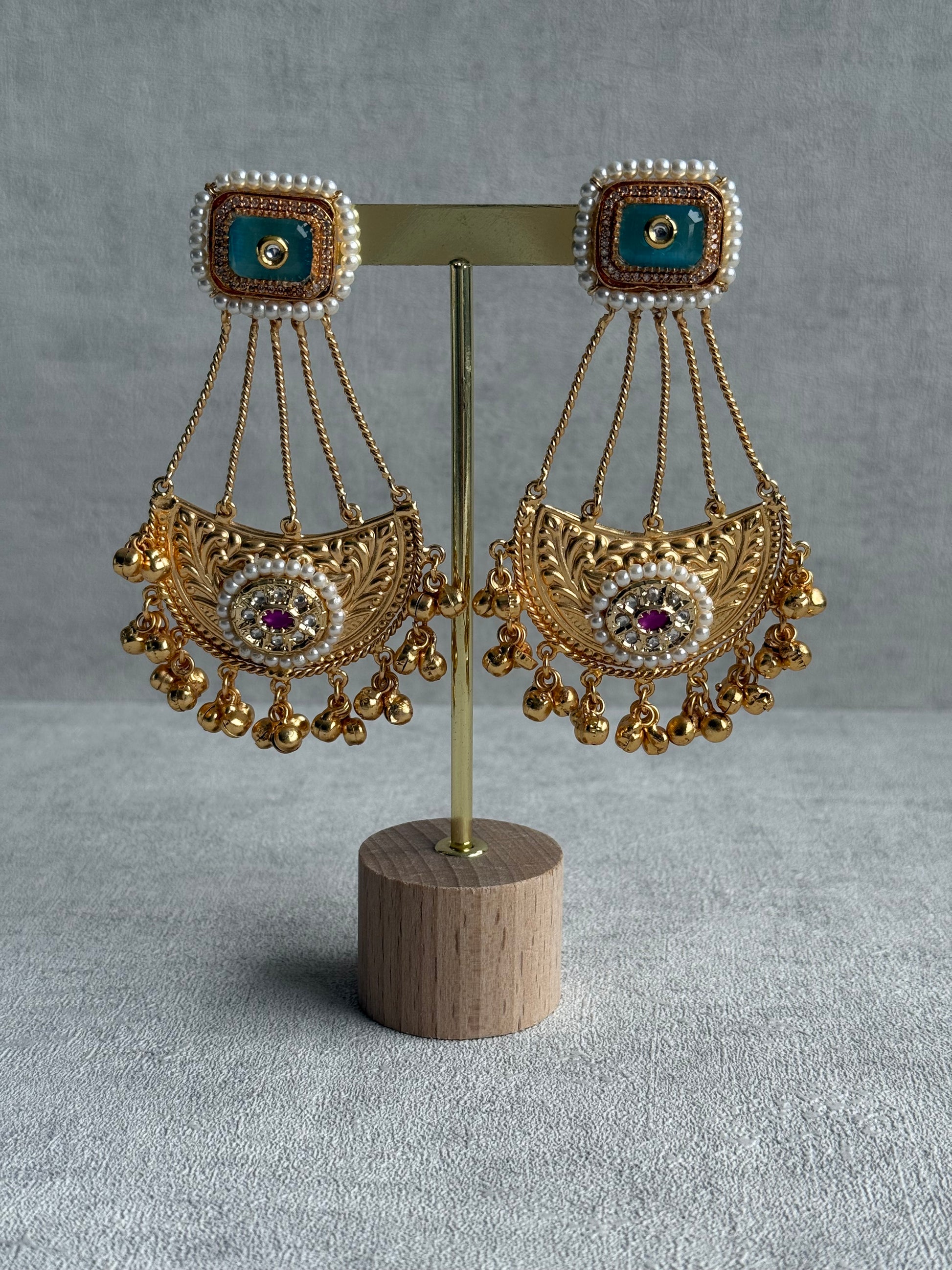 The pearl-framed circular stud adds a timeless finish, while the golden ghungroo fringe brings in subtle movement and rhythm. The turquoise enamel lends a refreshing pop of colour — serene, cool, and striking against the antique gold base.