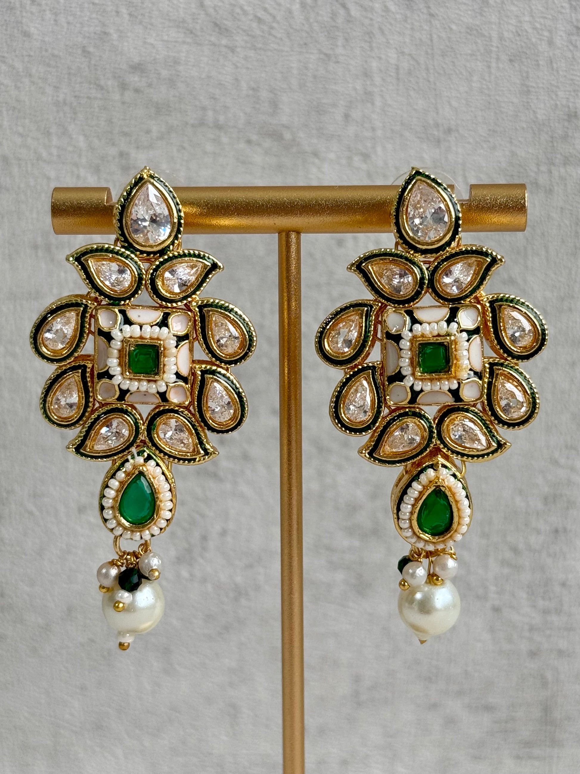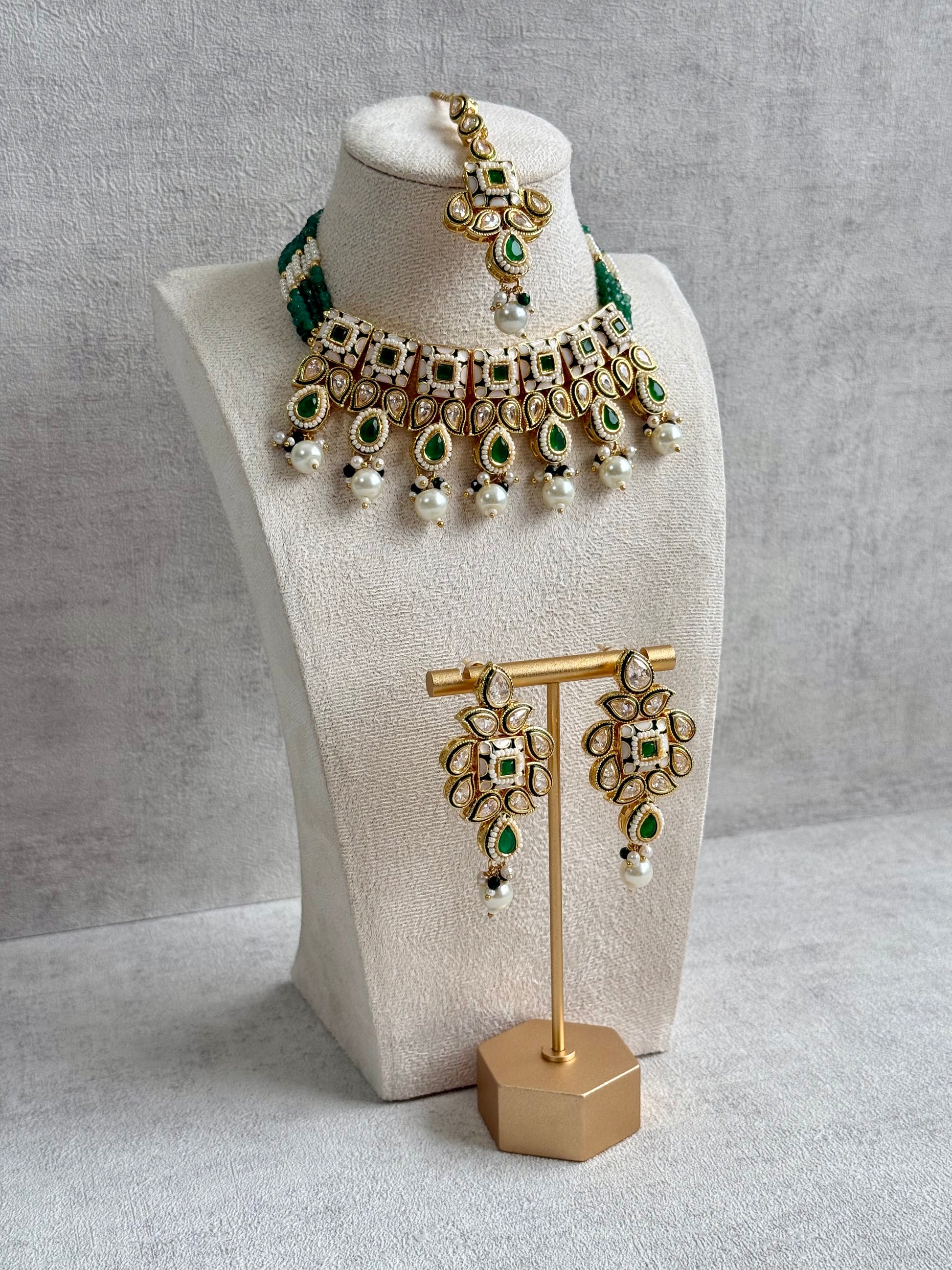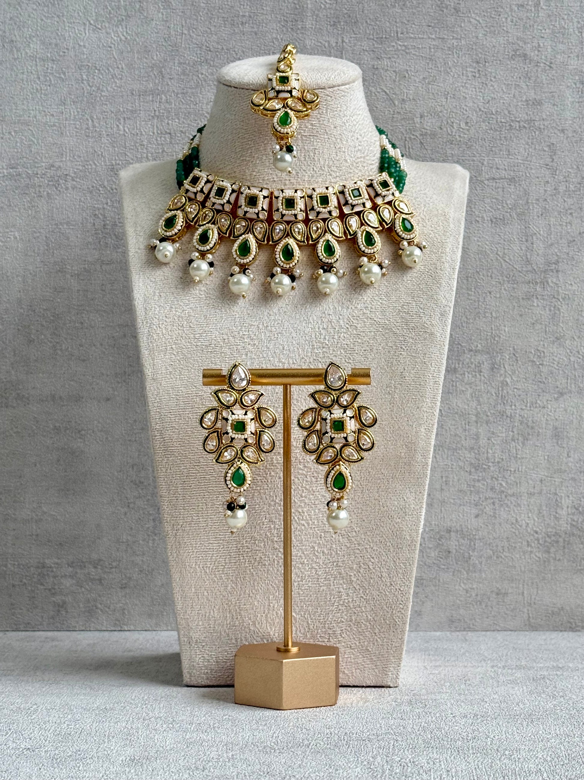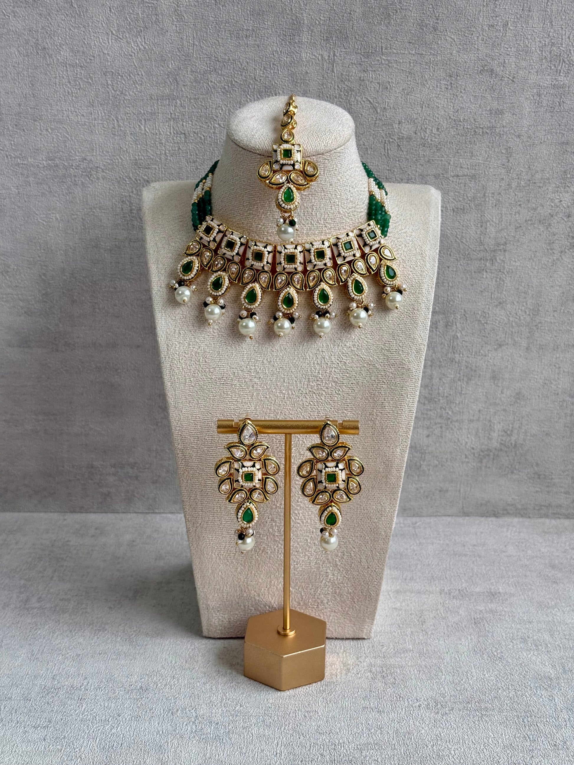 The necklace features square and teardrop-shaped patterns intricately bordered with green enamel and studded with mirror-cut stones that shimmer softly in the light. Emerald green stones form the heart of the design, balanced by pear-drop pearl drops that sway gracefully with movement. The multi-strand green bead back ties the look together with a timeless, regal finish.
