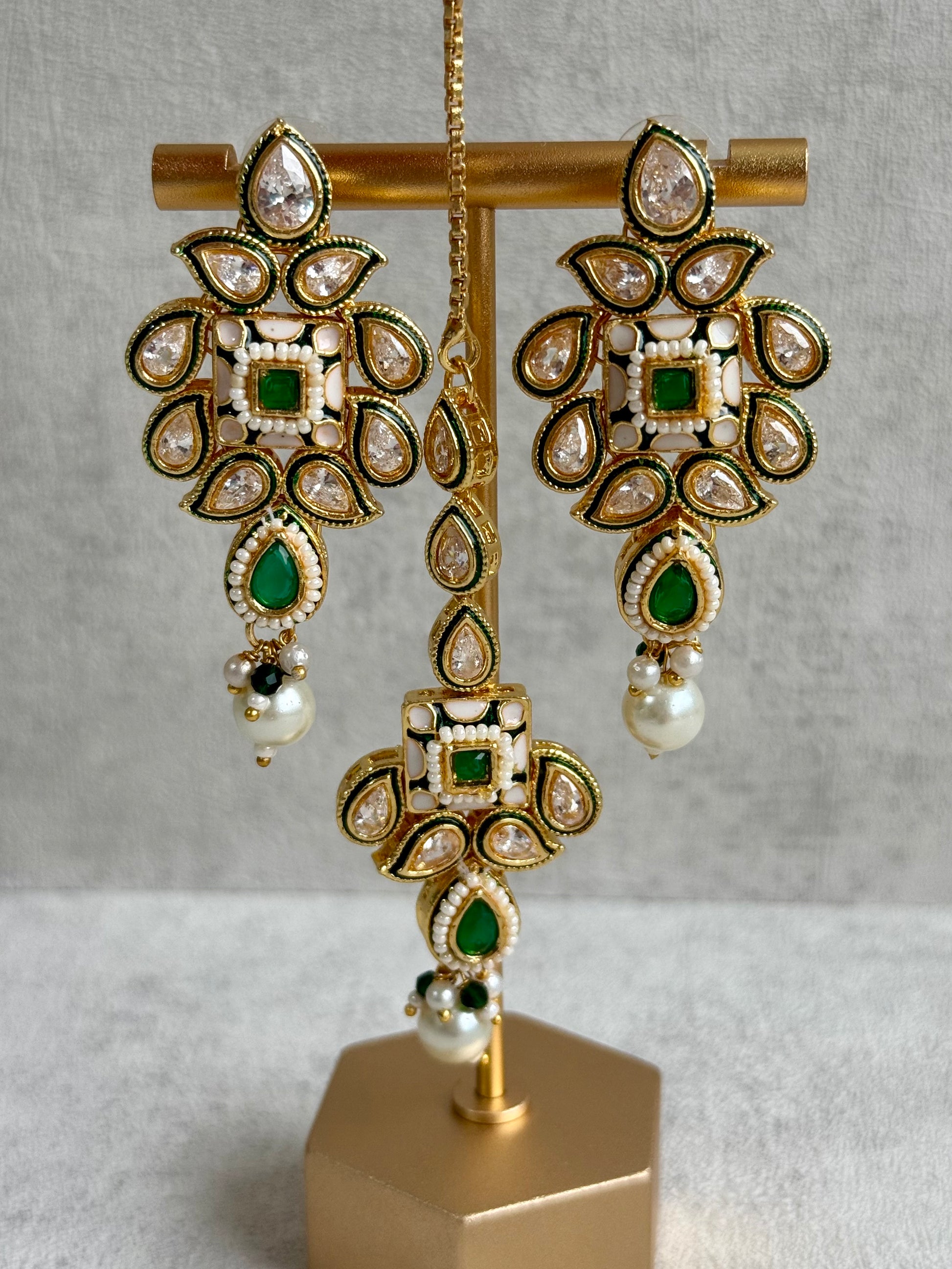 The matching earrings are statement pieces in their own right, echoing the floral-leaf structure of the choker. Each earring features a central green stone surrounded by mirror-cut petals and delicate pearls, finished with a bold teardrop emerald accent. The coordinated tikka mirrors this artistry, completing the set with a touch of bridal opulence.