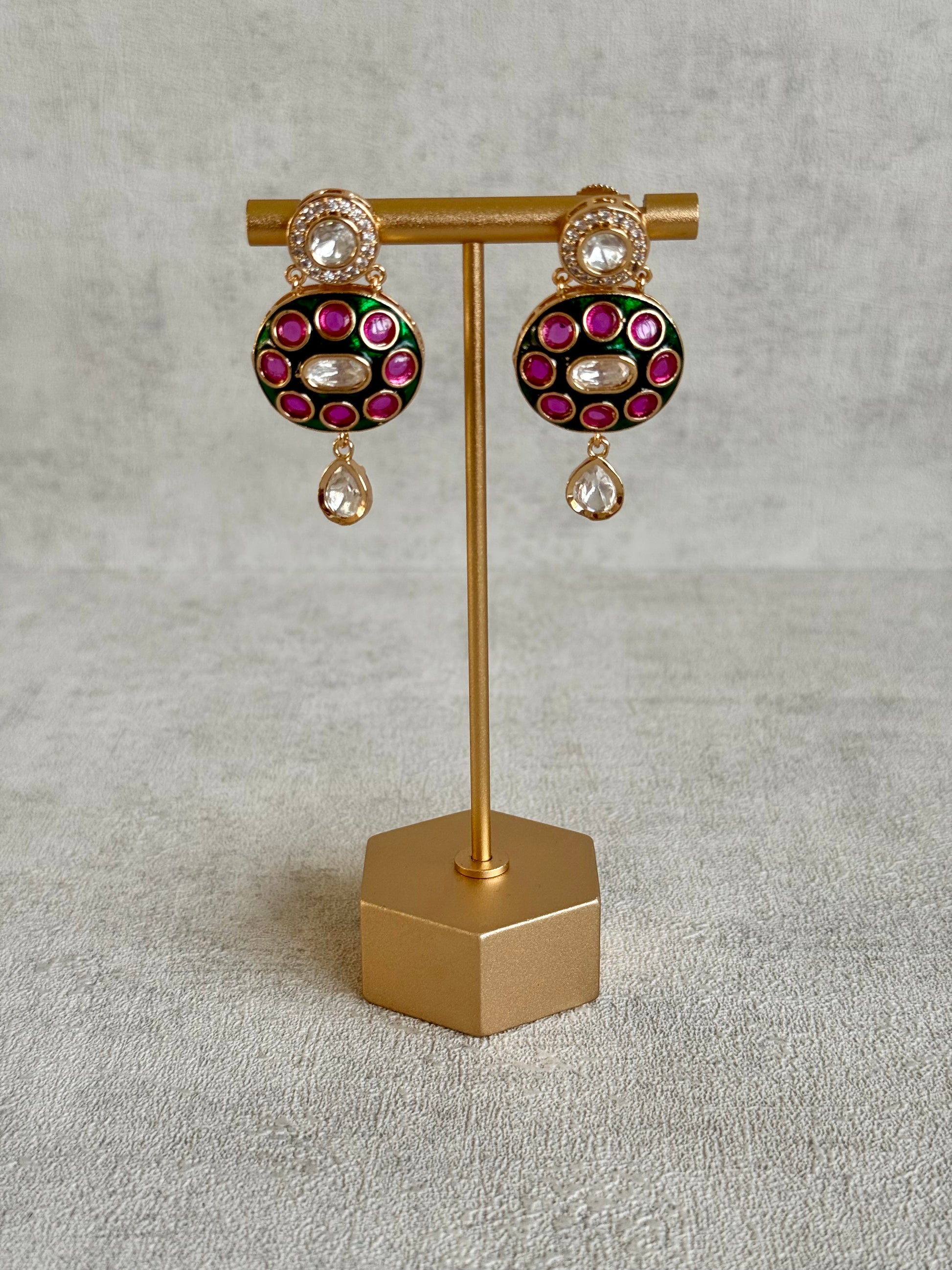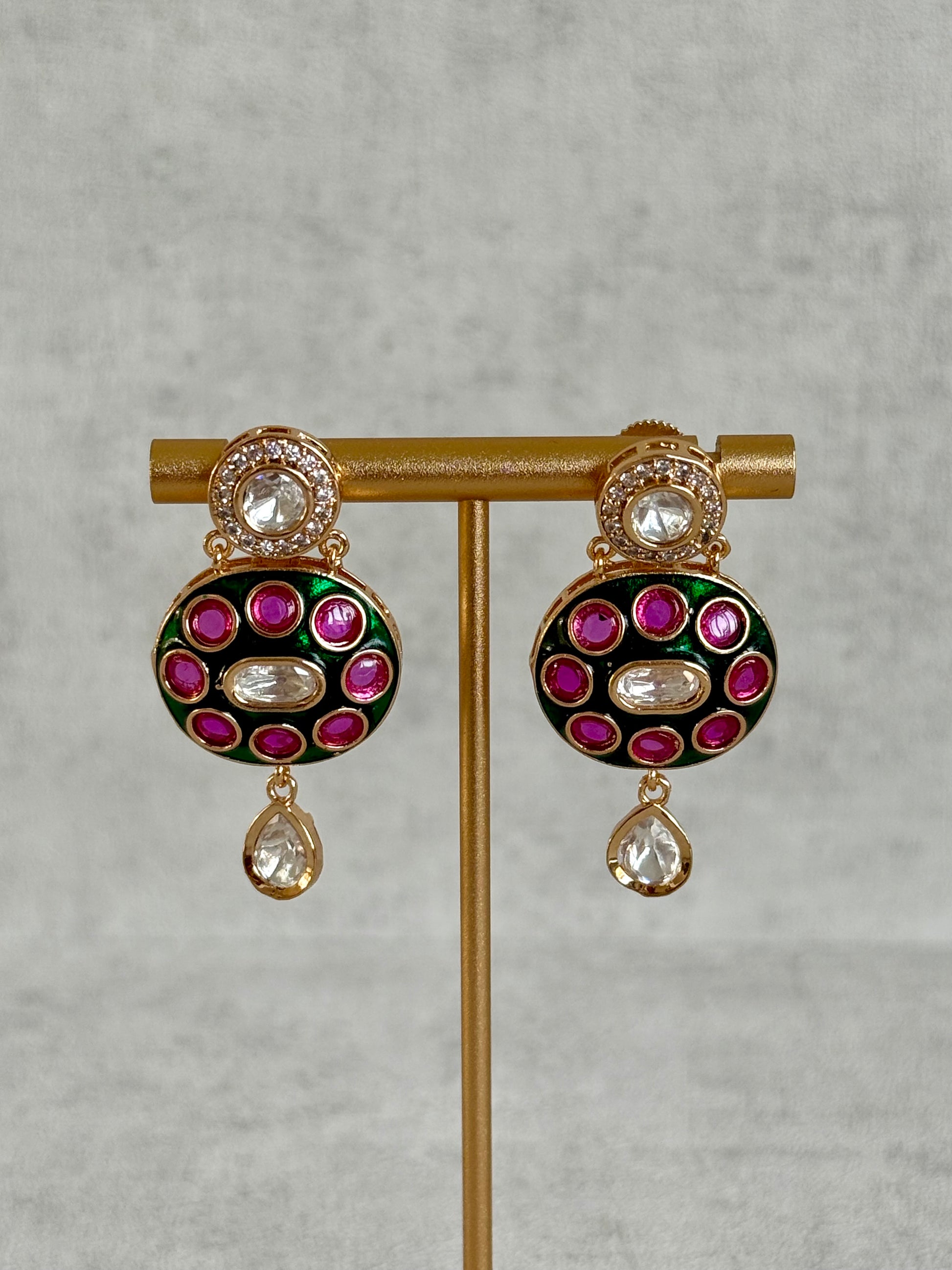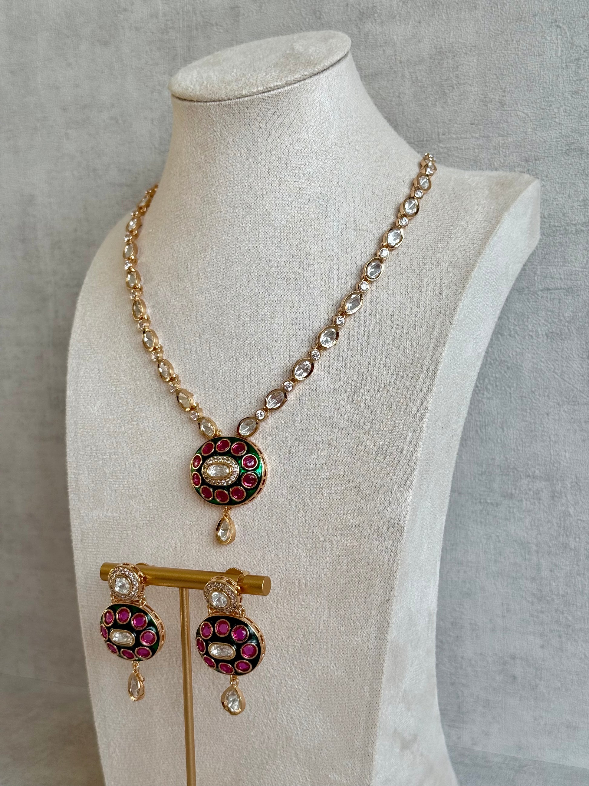 Ayura Designs Jiya Set with Earrings – Oval Motif, Pink & Green Meenakari with Crystal Detailing
