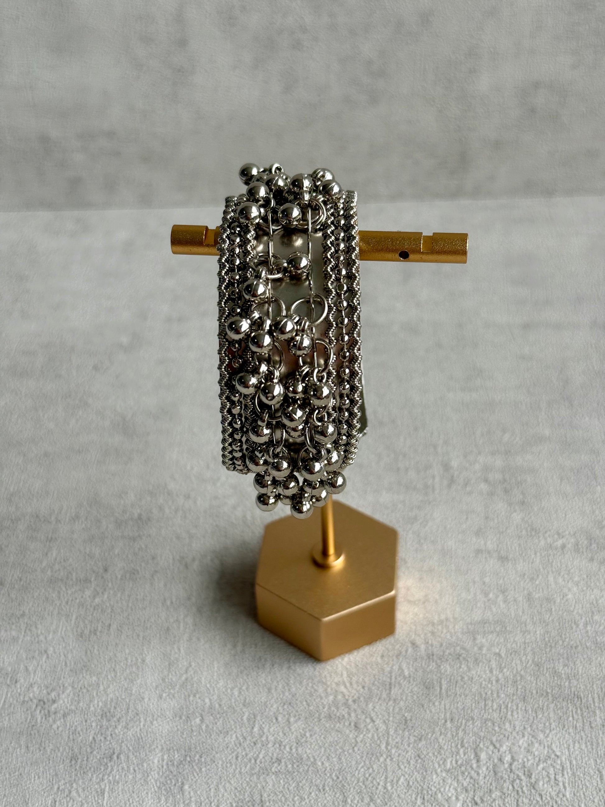 Unlike conventional bangles, the Jodha Gajra is a half-cuff design that fits securely over the wrist while remaining lightweight and easy to wear. The structured silhouette is softened by the rhythmic movement of the metallic beads, which sway and sparkle with every gesture. Whether styled as a single bold accent or paired with stackable bangles, it brings effortless drama to both modern and traditional outfits.