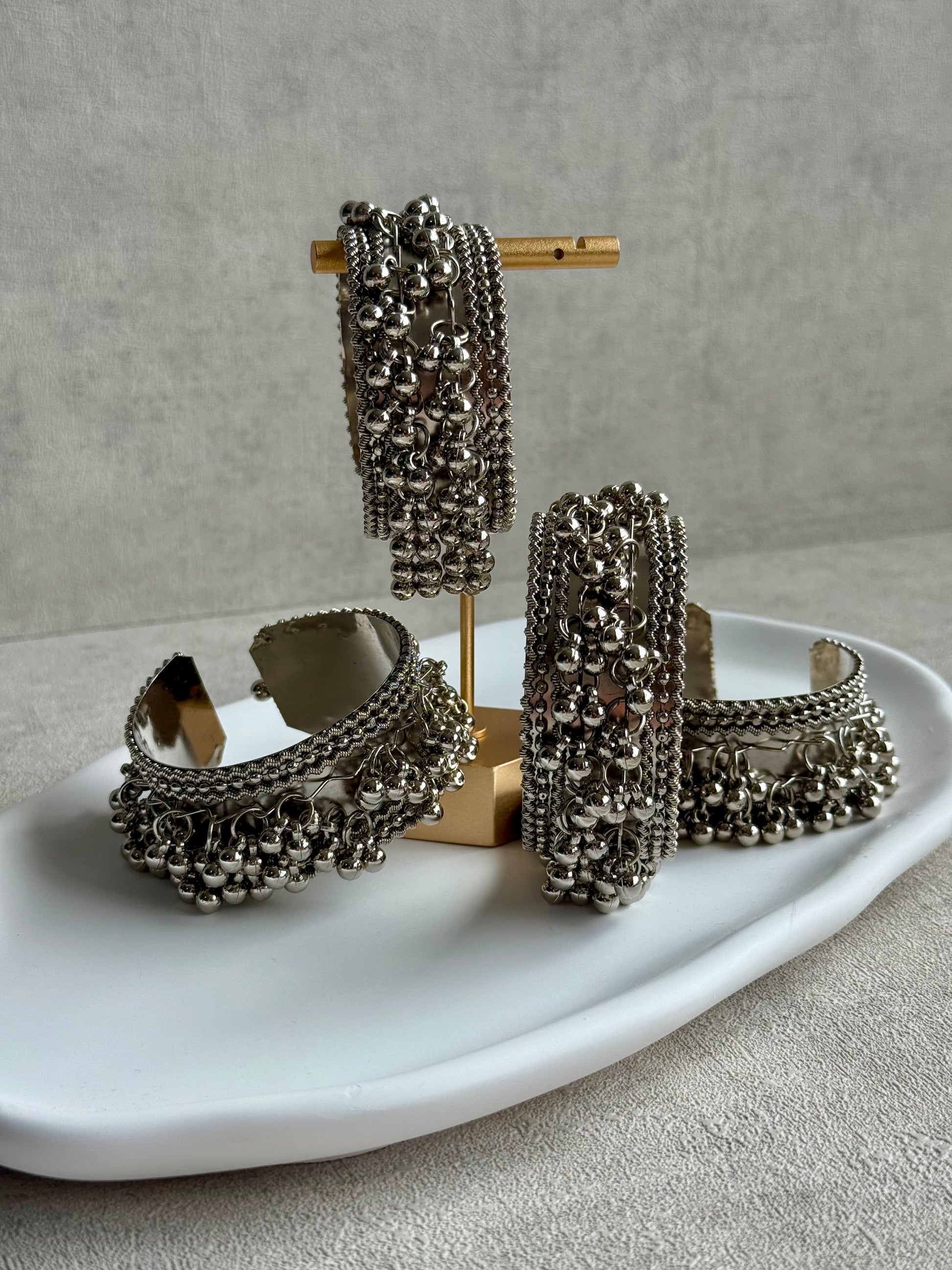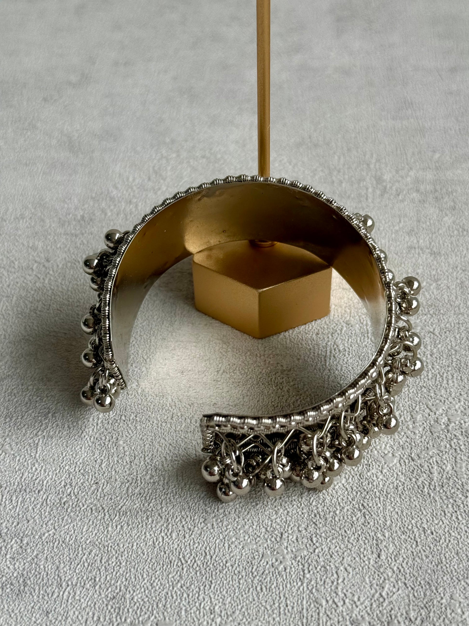 Unapologetically bold and unmistakably regal, the Ayura Designs Jodha Gajra is a statement piece inspired by the fierce femininity of warrior queens. Crafted in an oxidised silver finish, this wide cuff bangle wraps around the wrist with commanding elegance, its edges trimmed with delicate wirework and a dramatic cascade of traditional ghungroos. Every jingle carries the echo of a royal court — spirited, unapologetic, and rich with heritage.