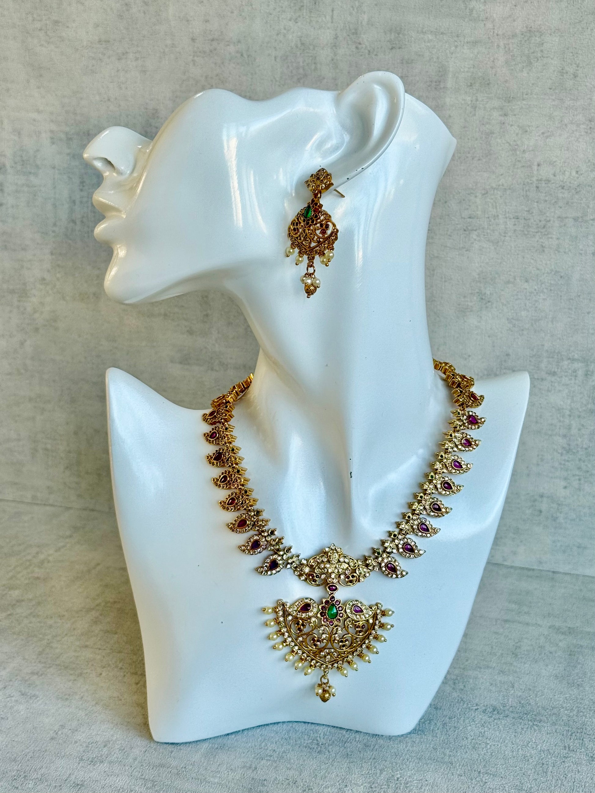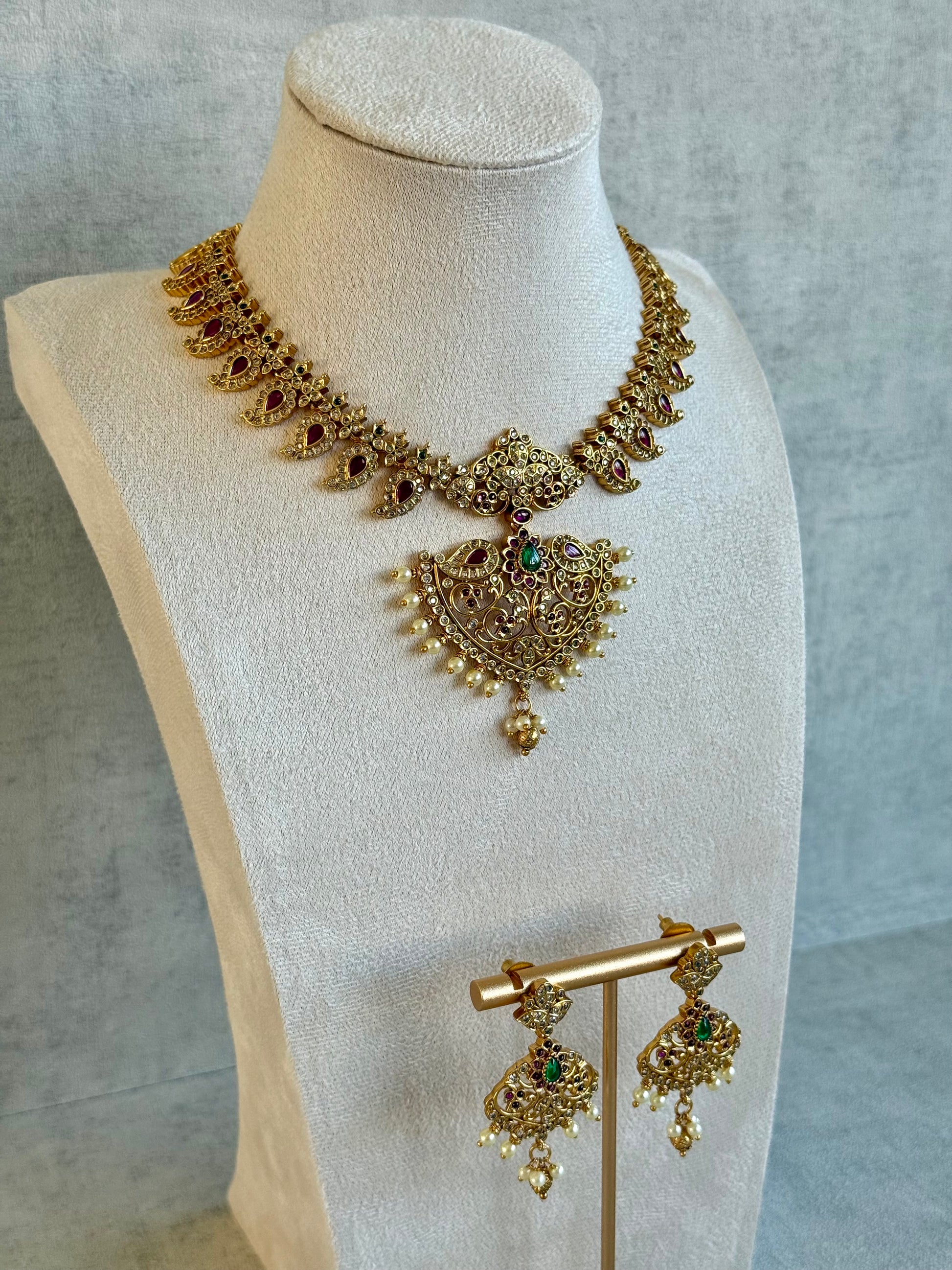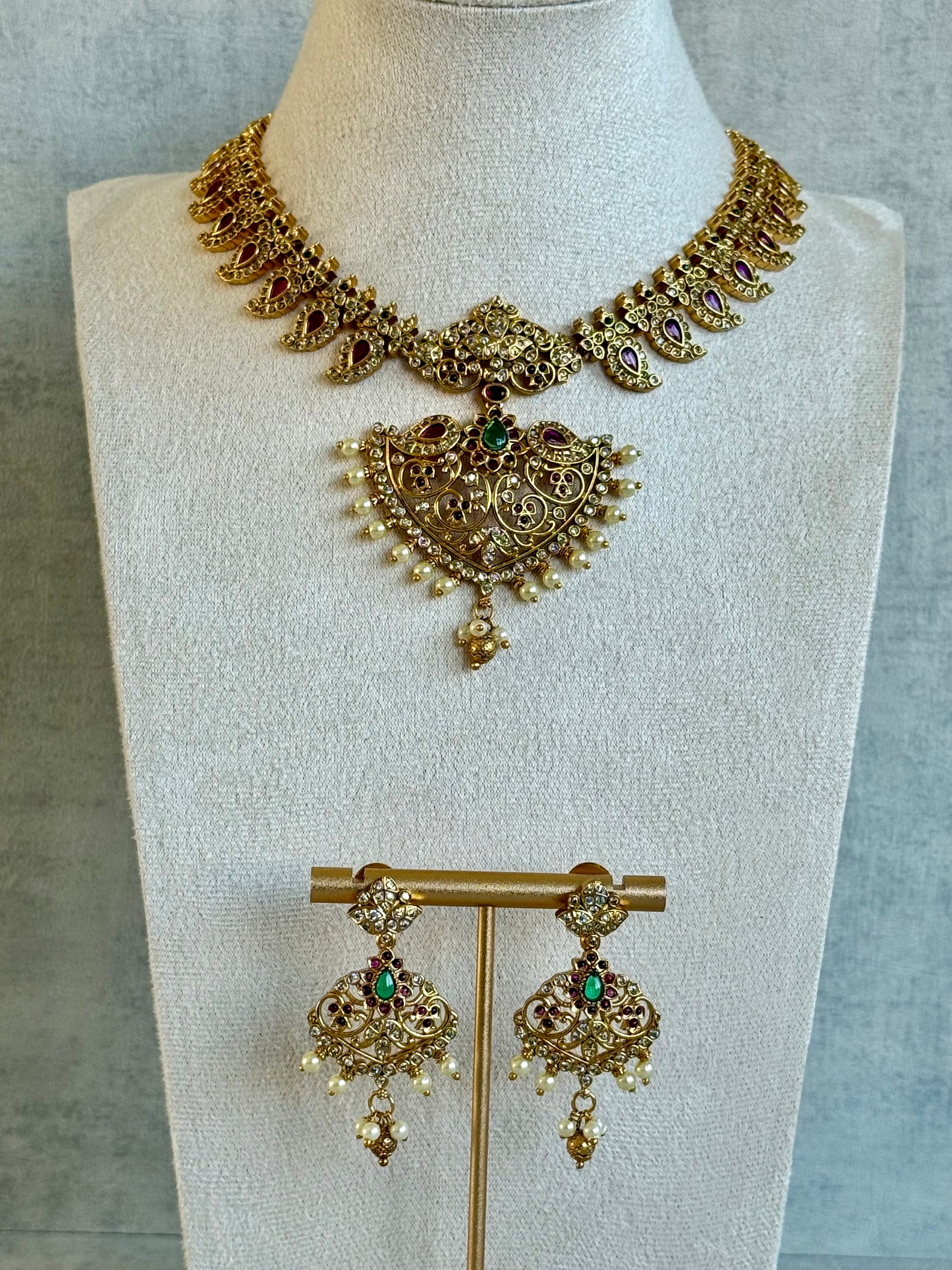 Ayura Designs Nithya Set – Gold Necklace & Earrings with Multicolour Stones and Ruby Centre