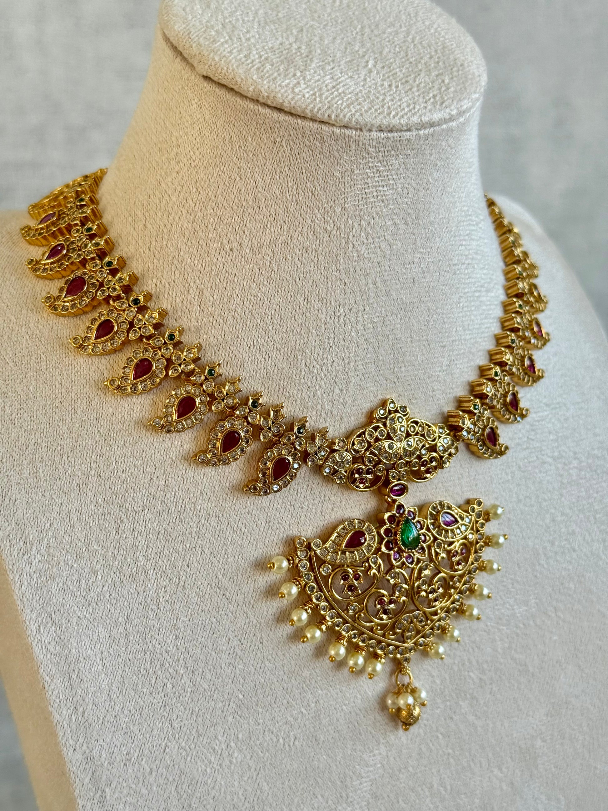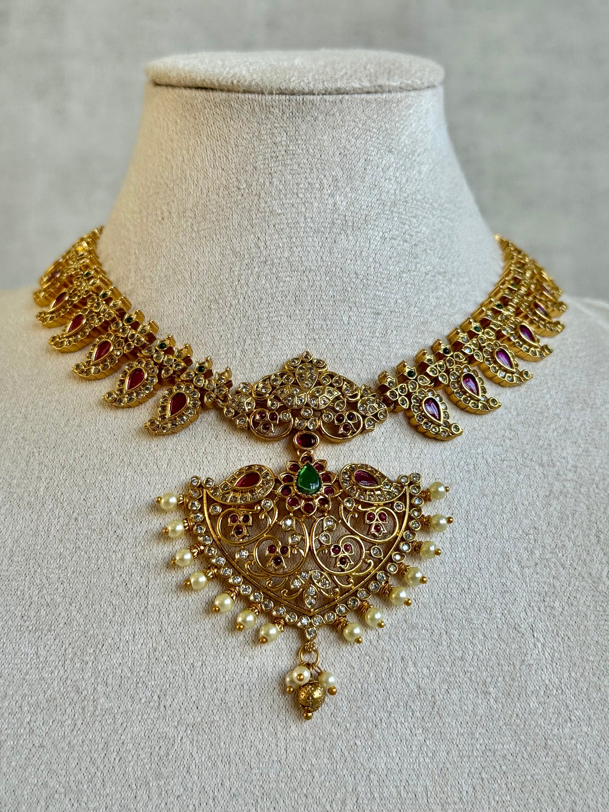 The necklace is designed with intricately detailed motifs set with pear-shaped and round stones, leading into a statement pendant accented with pink and green stones. Fine pearl edging adds movement and elegance, making the piece feel rich yet beautifully balanced.
