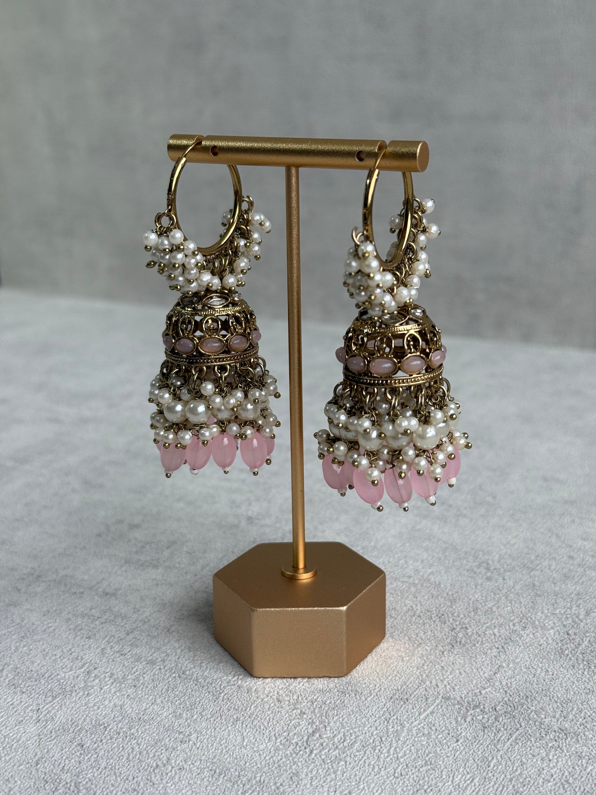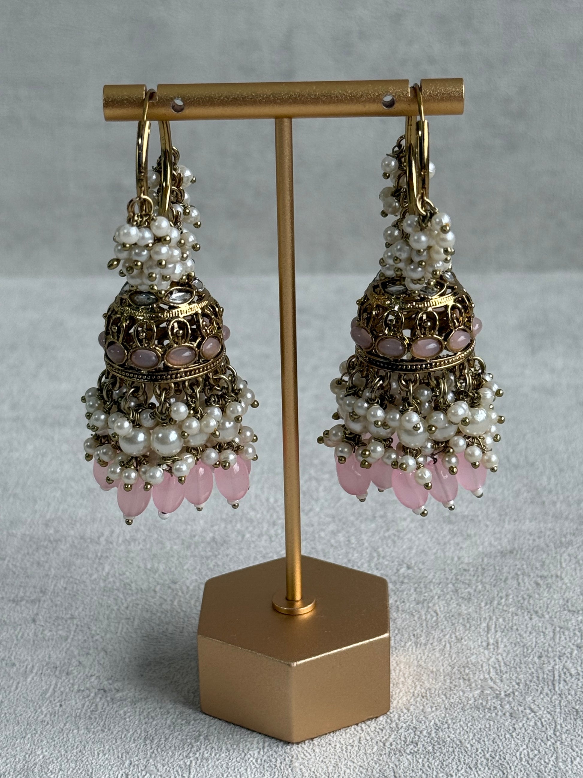 The Ayura Designs Jugni Jhumkis capture the essence of soft romance and timeless heritage. Crafted in an antique gold finish, each hoop is draped with dainty pearl clusters that lead into intricate dome-shaped jhumkis adorned with oval blush pink stones and delicate pearl drops.