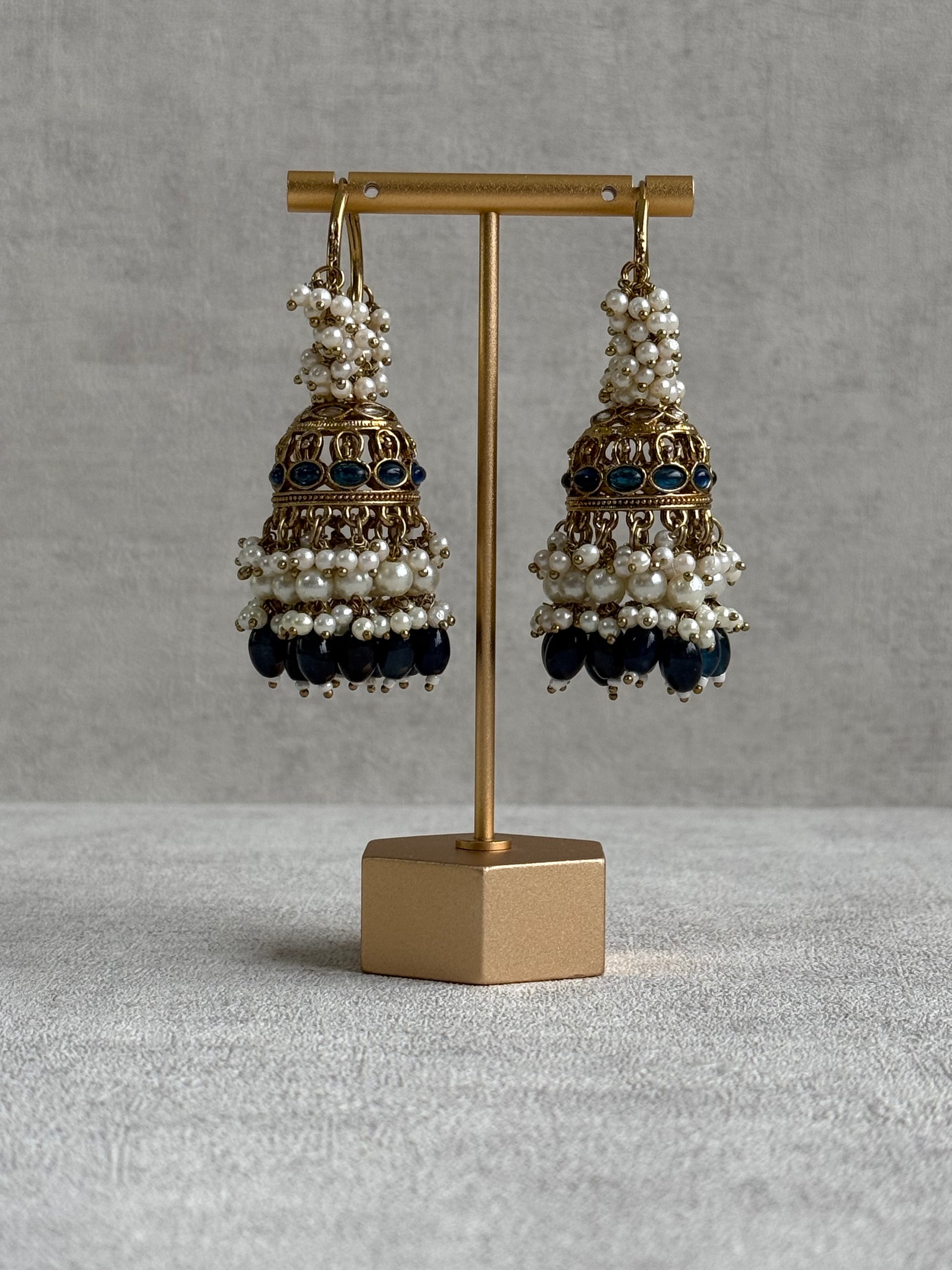 Details: Ink blue stones, pearl clusters & multi-layered jhumki silhouette