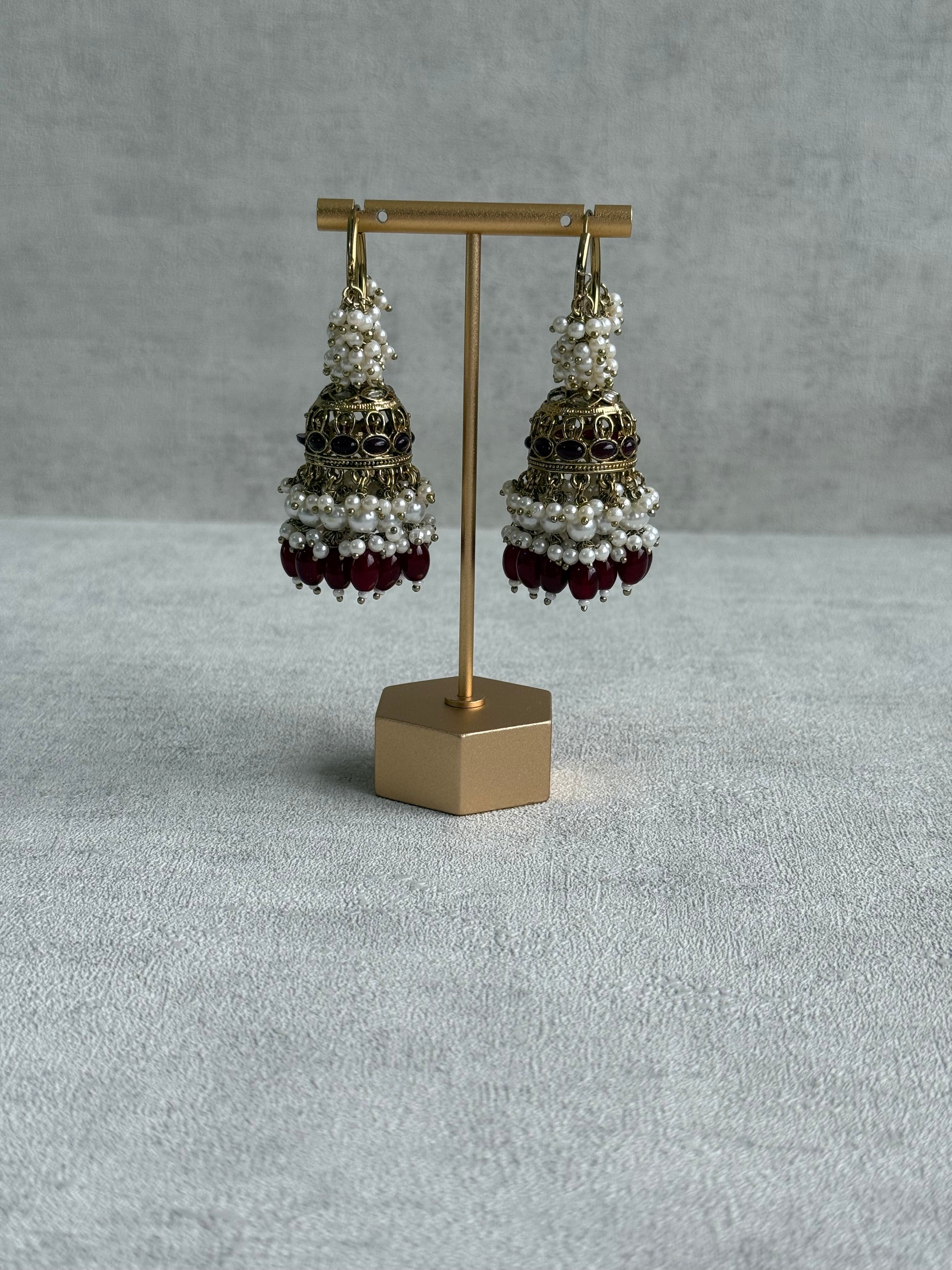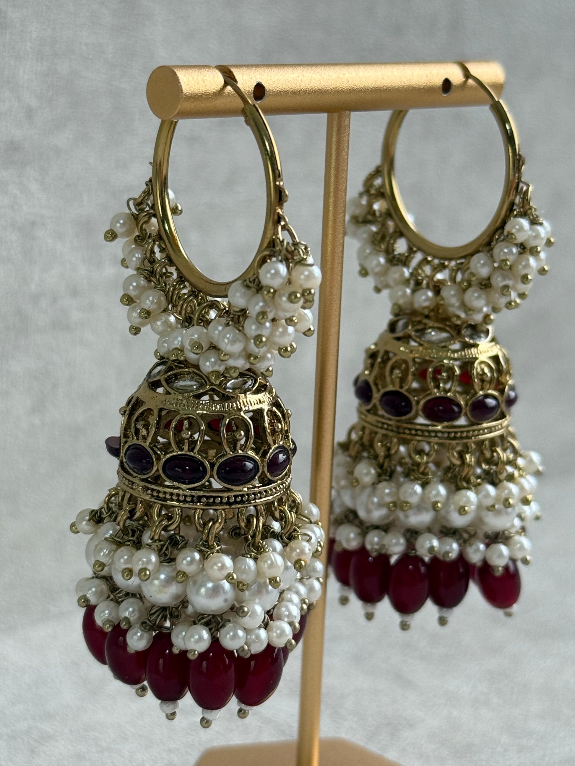 Details: Maroon stones, pearl clusters & layered jhumki silhouette