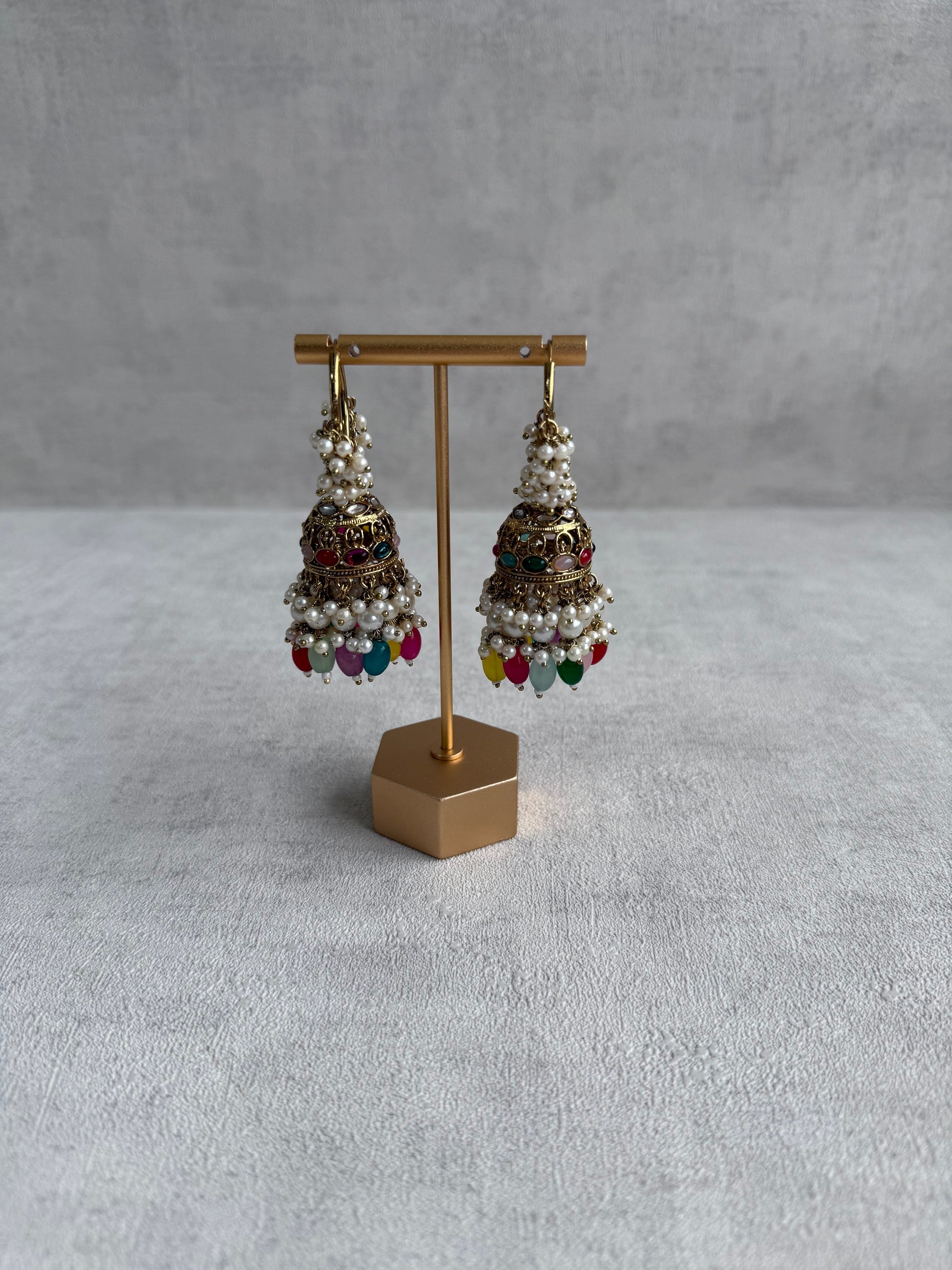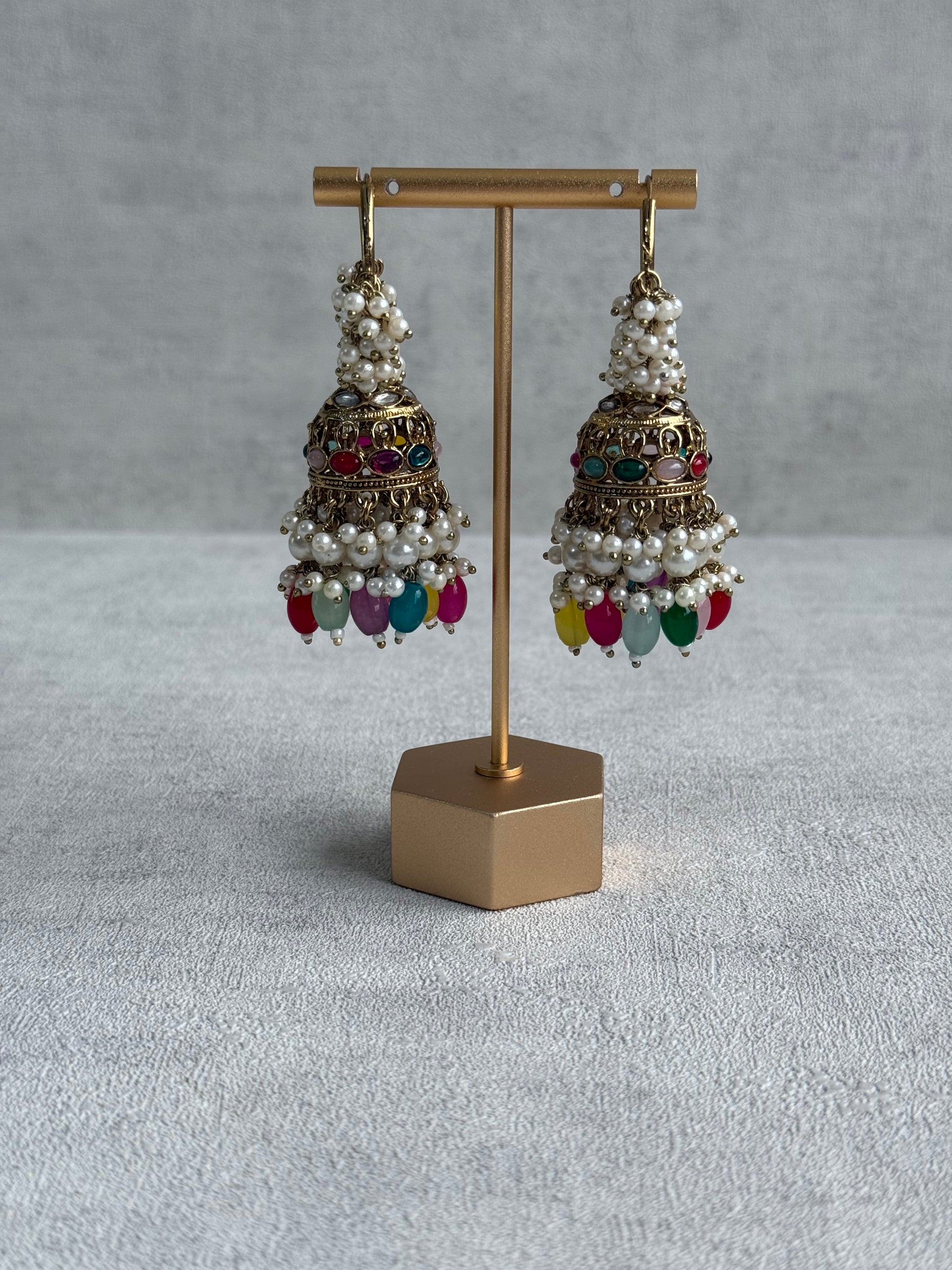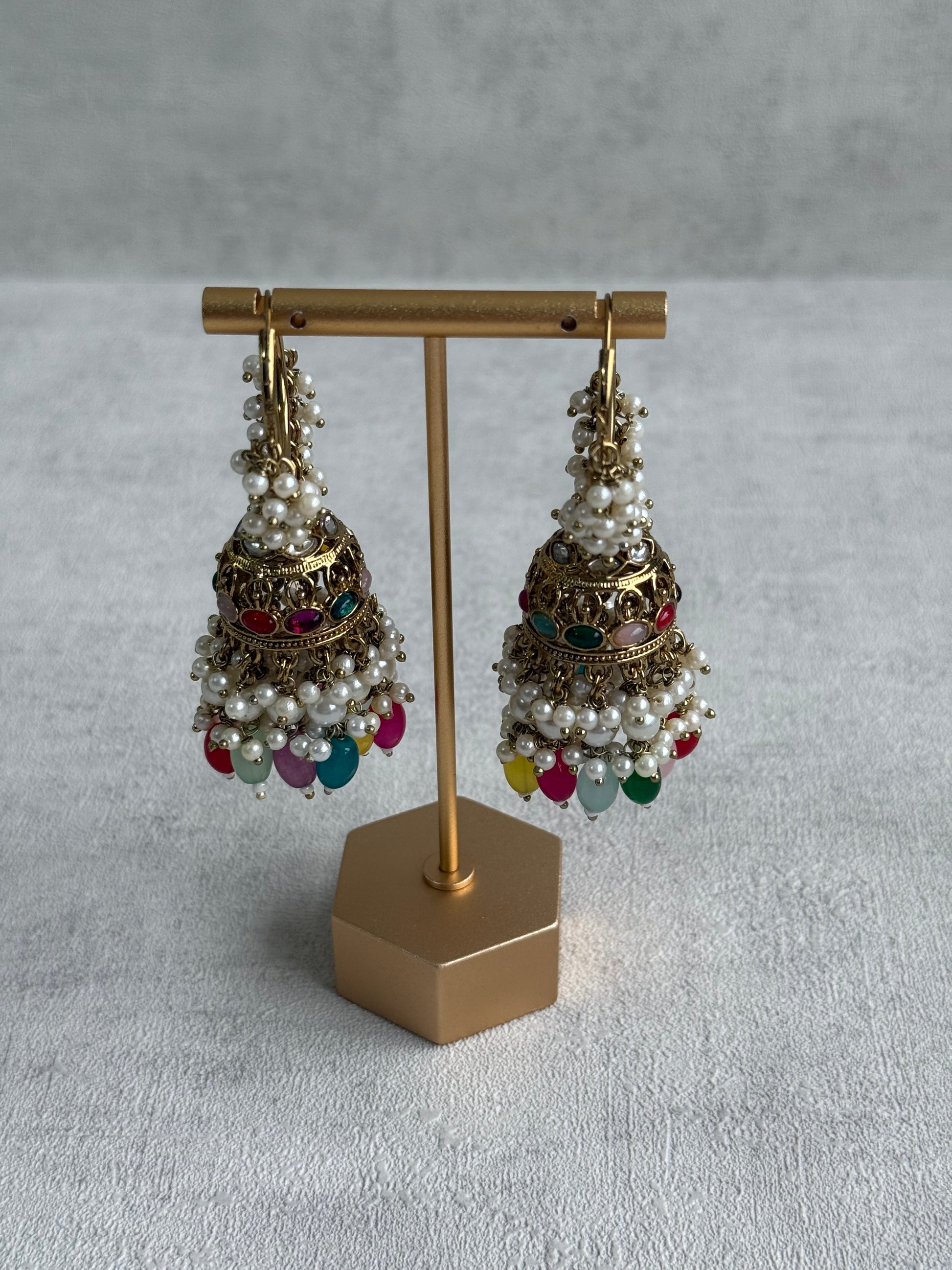Details: Multicolour stones, pearl clusters & layered jhumki silhouette