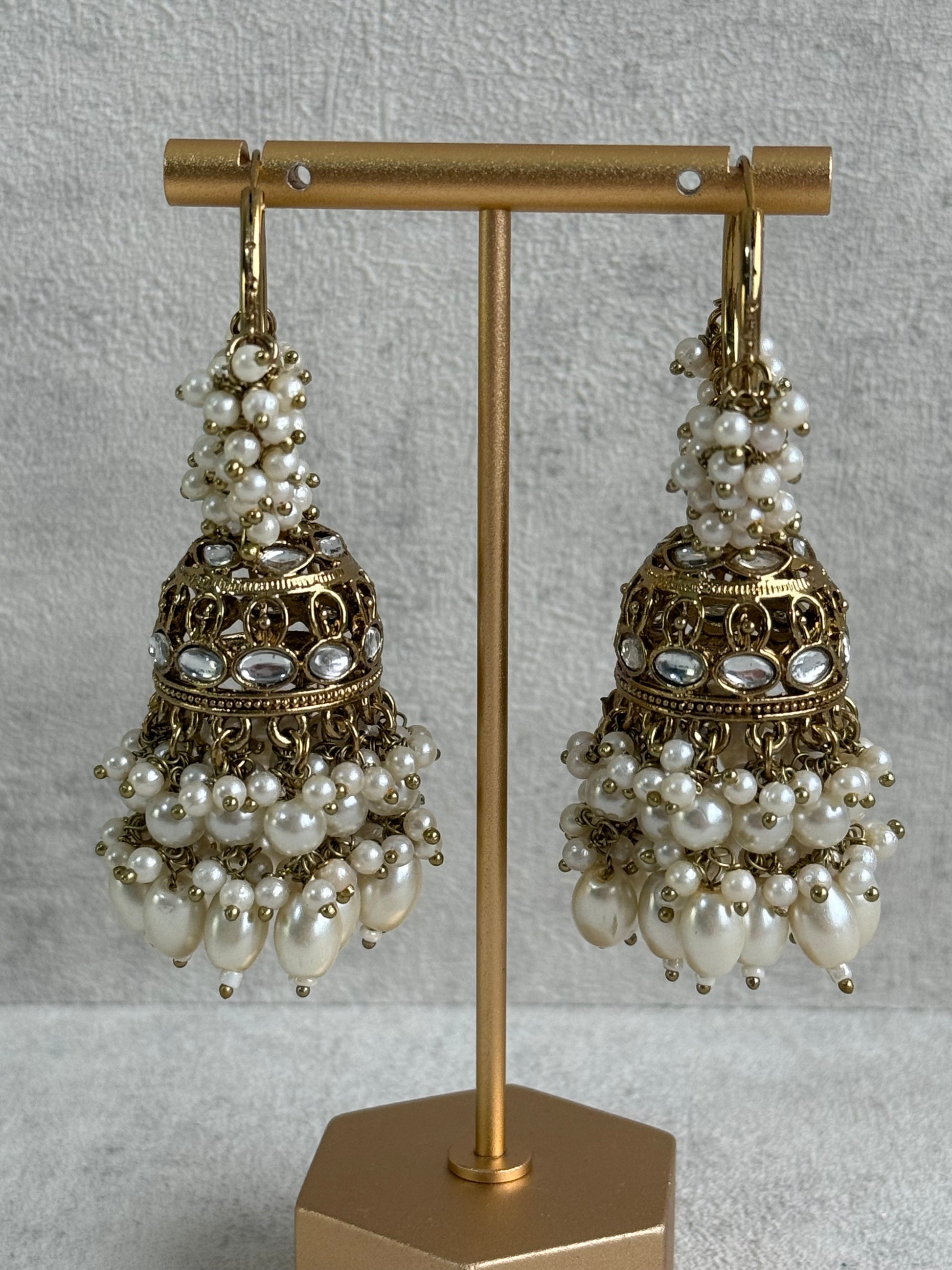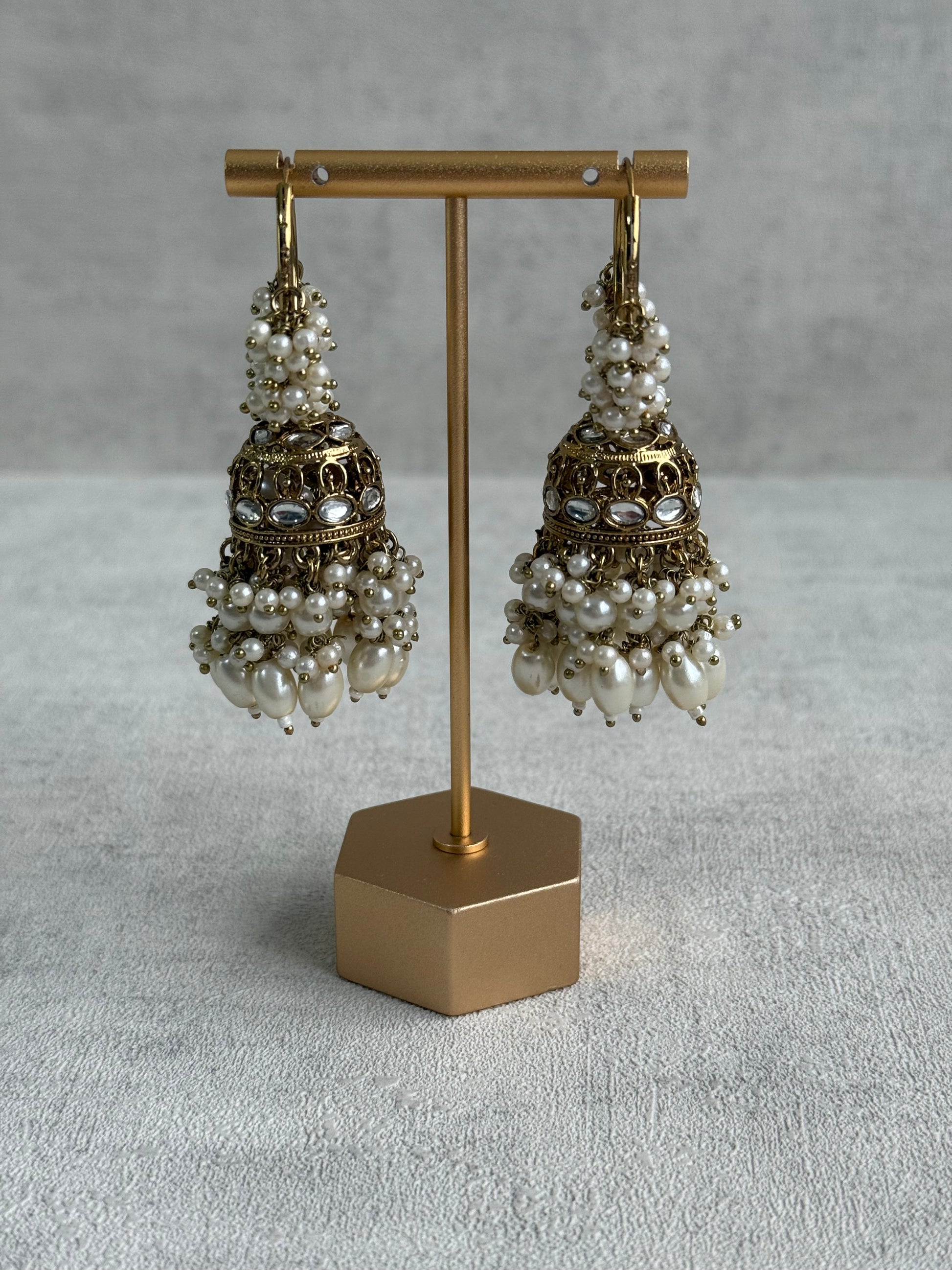 The Ayura Designs Jugni Jhumkis are an ode to old-world grandeur. Designed in an antique gold finish, each hoop is beautifully adorned with tiny pearl clusters that cascade into statement dome-shaped jhumkis encrusted with kundan stones and luminous teardrop pearls.