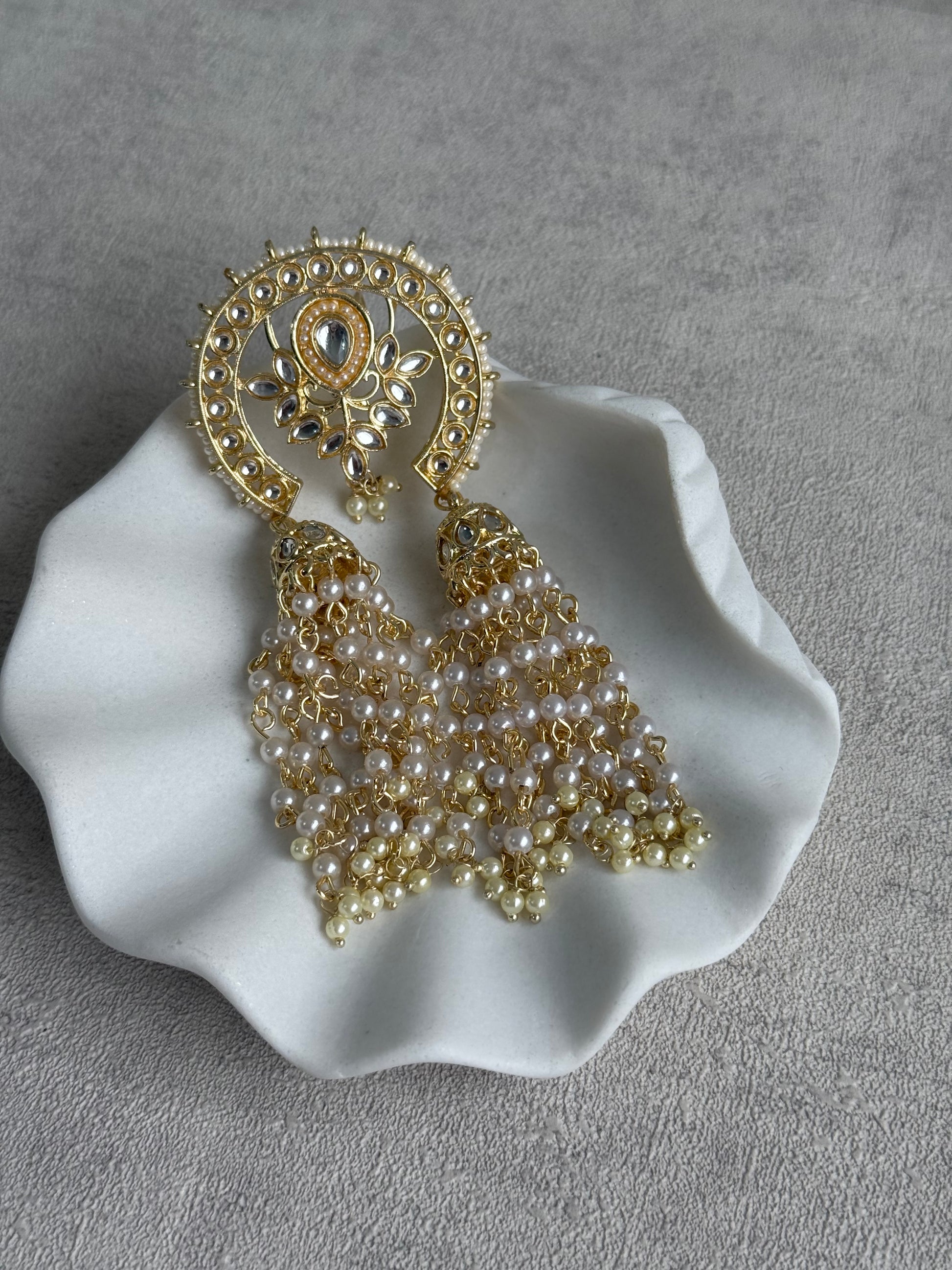 From the crescent arch descend twin tassels of tiny pearls and gold links, finished with petite Polki-studded jhumkis that add a rhythmic sway with every movement. Each detail has been thoughtfully handcrafted to create an heirloom-worthy piece that captures the light and the gaze in equal measure.
