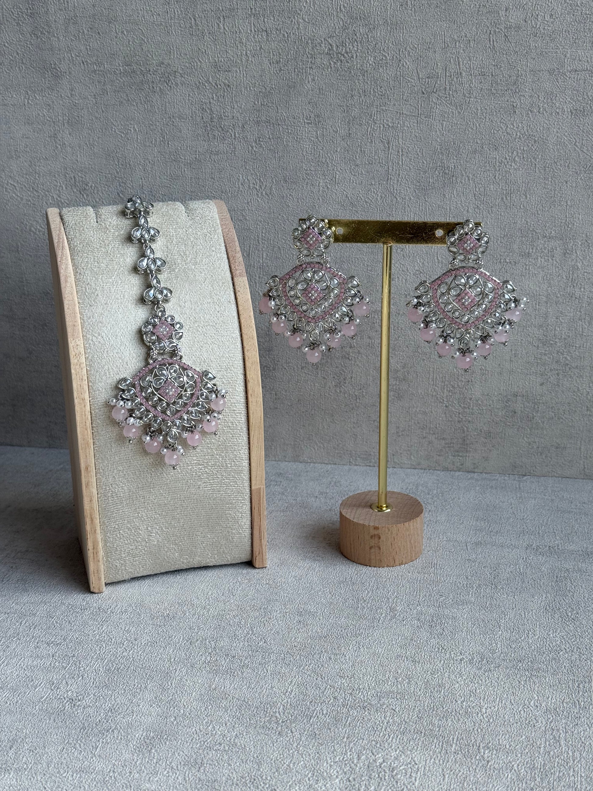 Ayura Designs Kanika Set – Necklace, Earrings & Tikka with Blush Pink Beads, Mirror-Cut Stones & Silver Finish