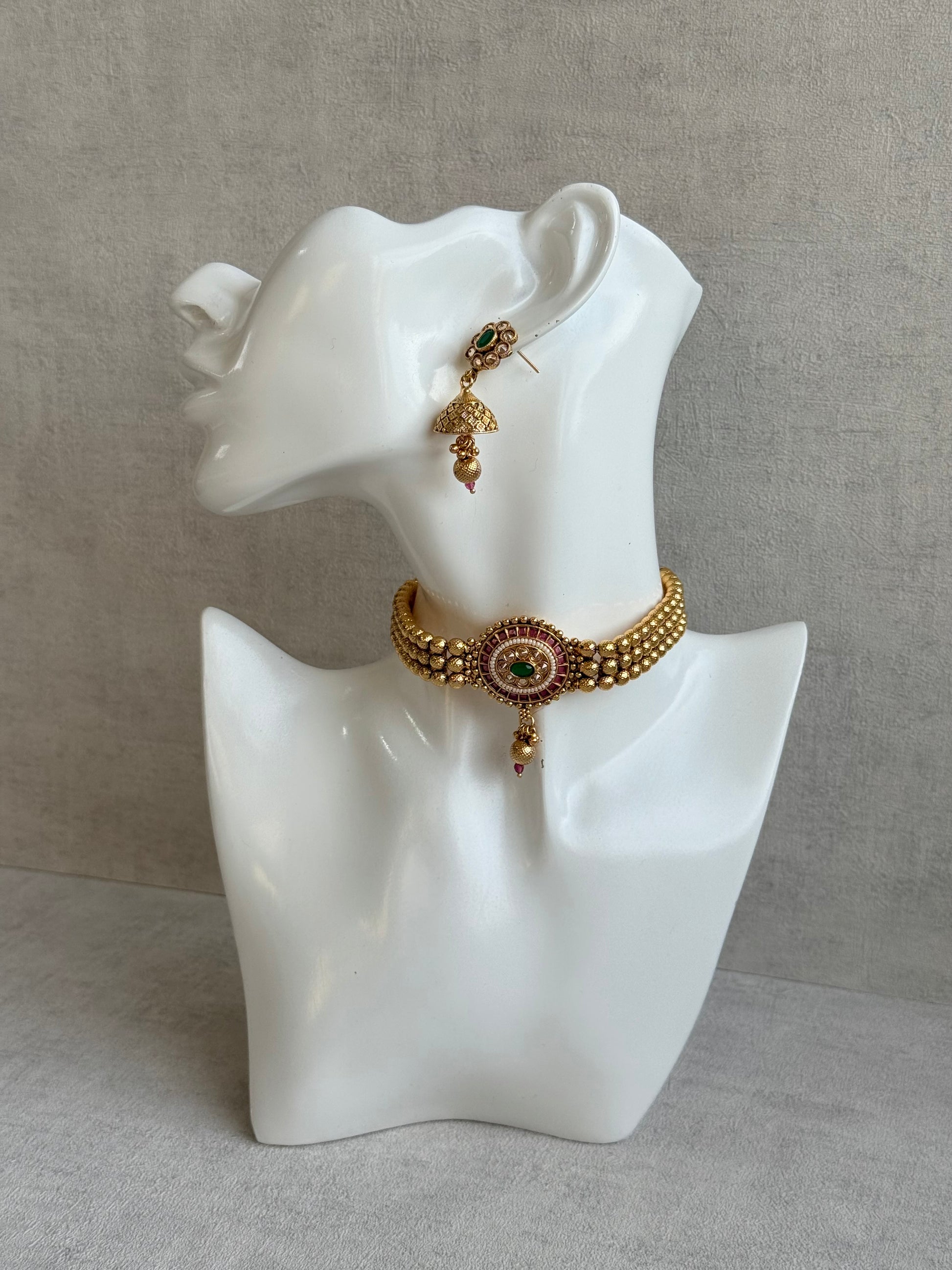 The Ayura Designs Kavish Choker Set is a striking blend of vintage charm and vibrant colour. Crafted in a rich antique gold finish, the choker features a bold circular centrepiece adorned with an emerald green stone, surrounded by kundan-style crystals, a delicate pearl halo, and striking Rani pink accents. Textured gold bead strands add depth and dimension, giving the piece a regal, structured feel.