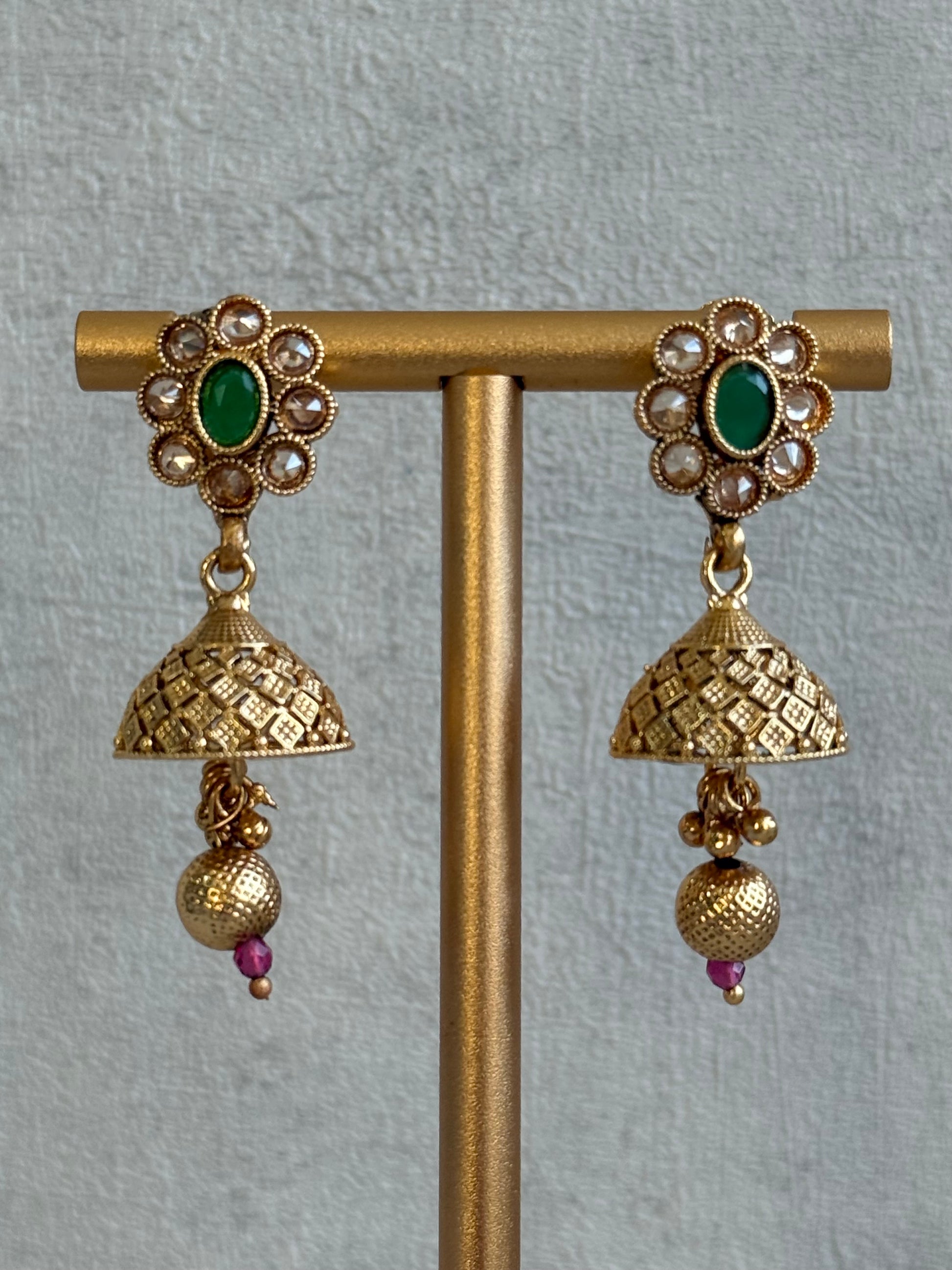 The matching jhumkis mirror the floral elegance of the choker with crystal-studded tops, emerald green centres, and embossed dome drops. Each earring is finished with gold beads and Rani pink details that echo the colours of the choker for a beautifully cohesive look.