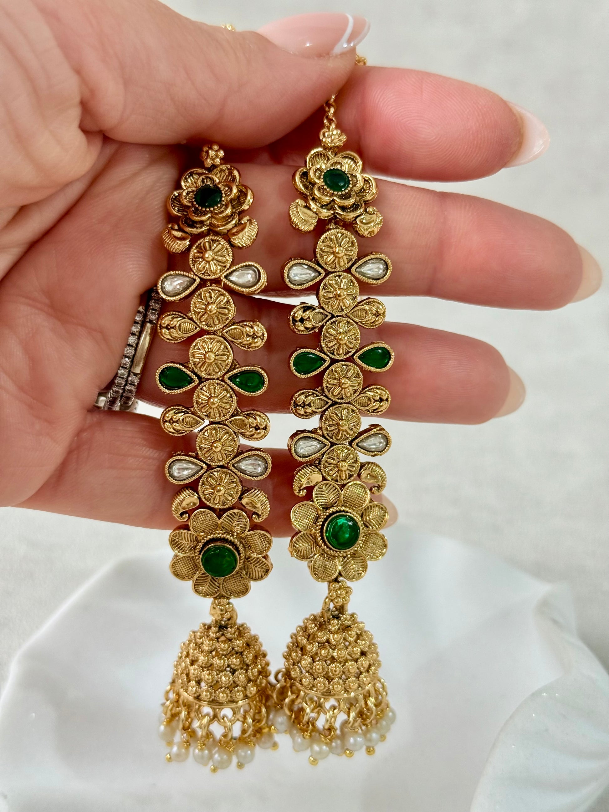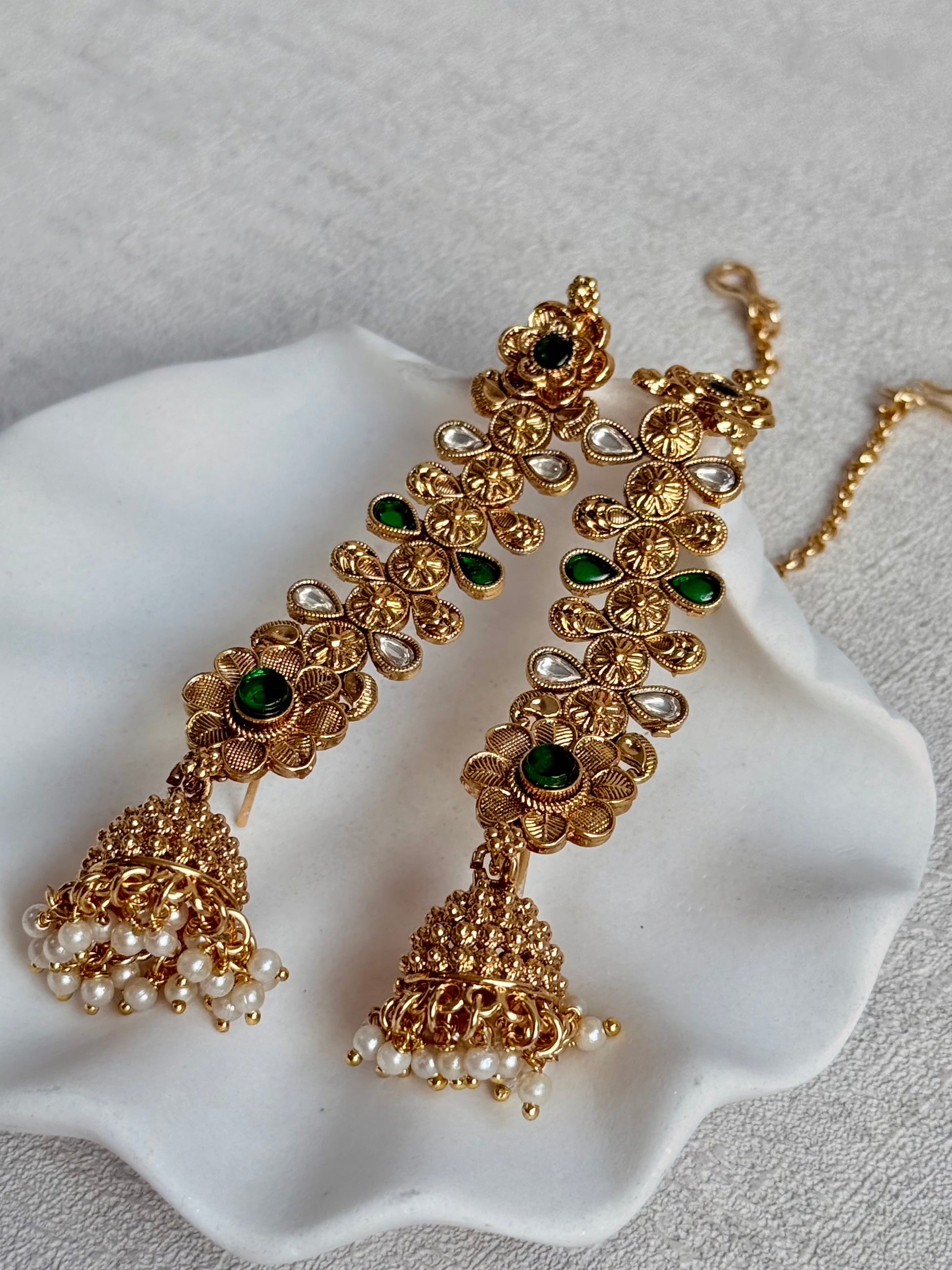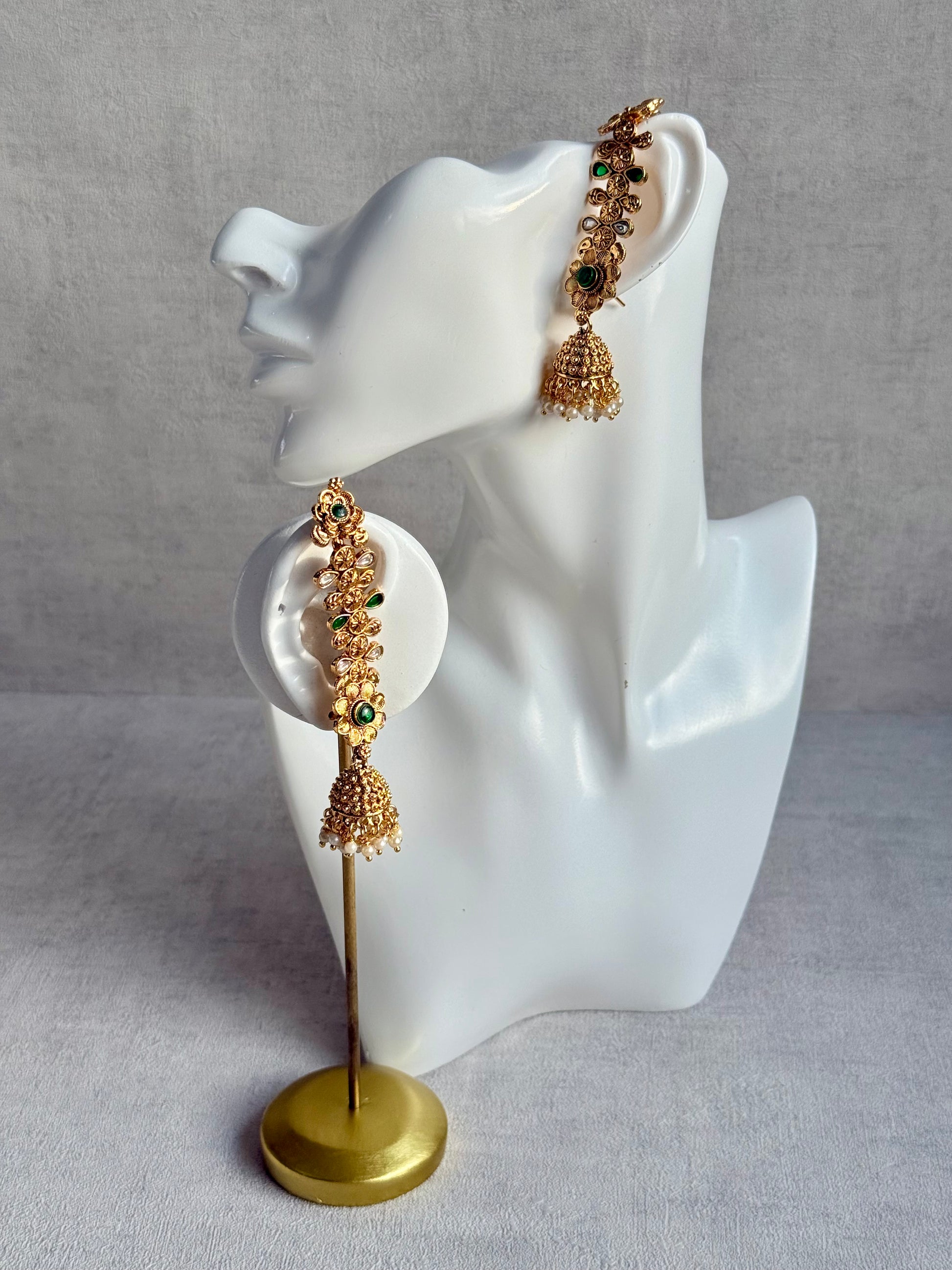 The Keerti Jhumkis showcase a beautifully detailed antique gold kannauti design that curves gracefully along the ear. Intricate floral motifs are highlighted with rich emerald green stones, giving the piece a classic yet striking traditional appeal. The elongated ear chain design offers a secure, comfortable fit while enhancing the overall statement silhouette.