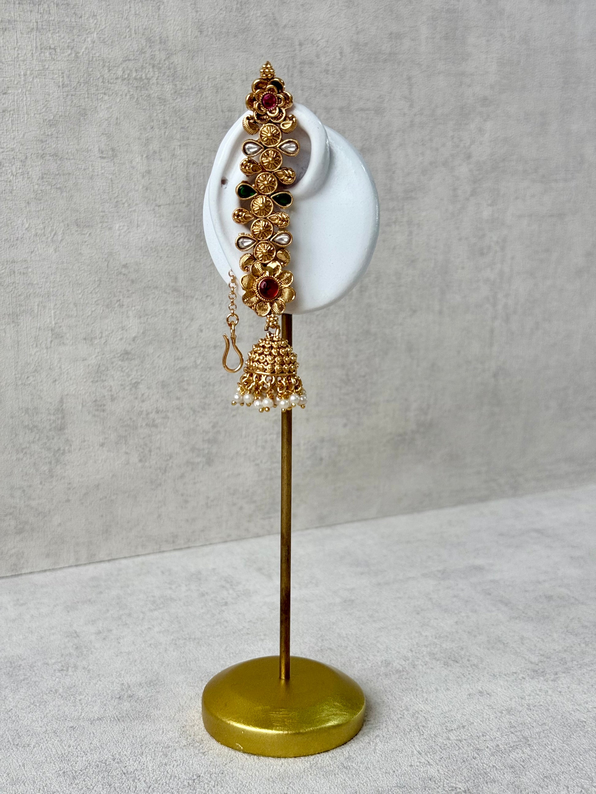 The Keerti Jhumkis feature a classic kannauti silhouette crafted in an antique gold finish, designed to frame the ear beautifully with intricate floral motifs and traditional detailing. The elongated design creates a striking yet elegant statement, perfect for elevated festive and wedding looks. The elongated ear chain design offers a secure, comfortable fit while enhancing the overall statement silhouette.