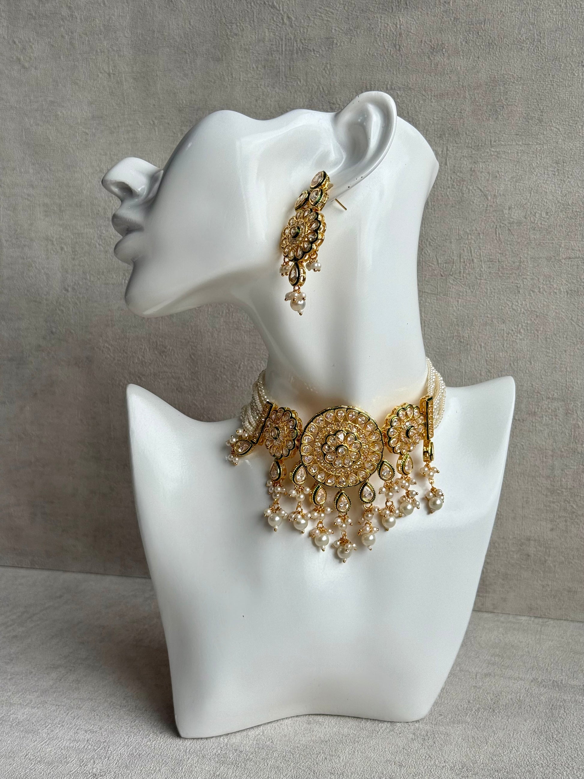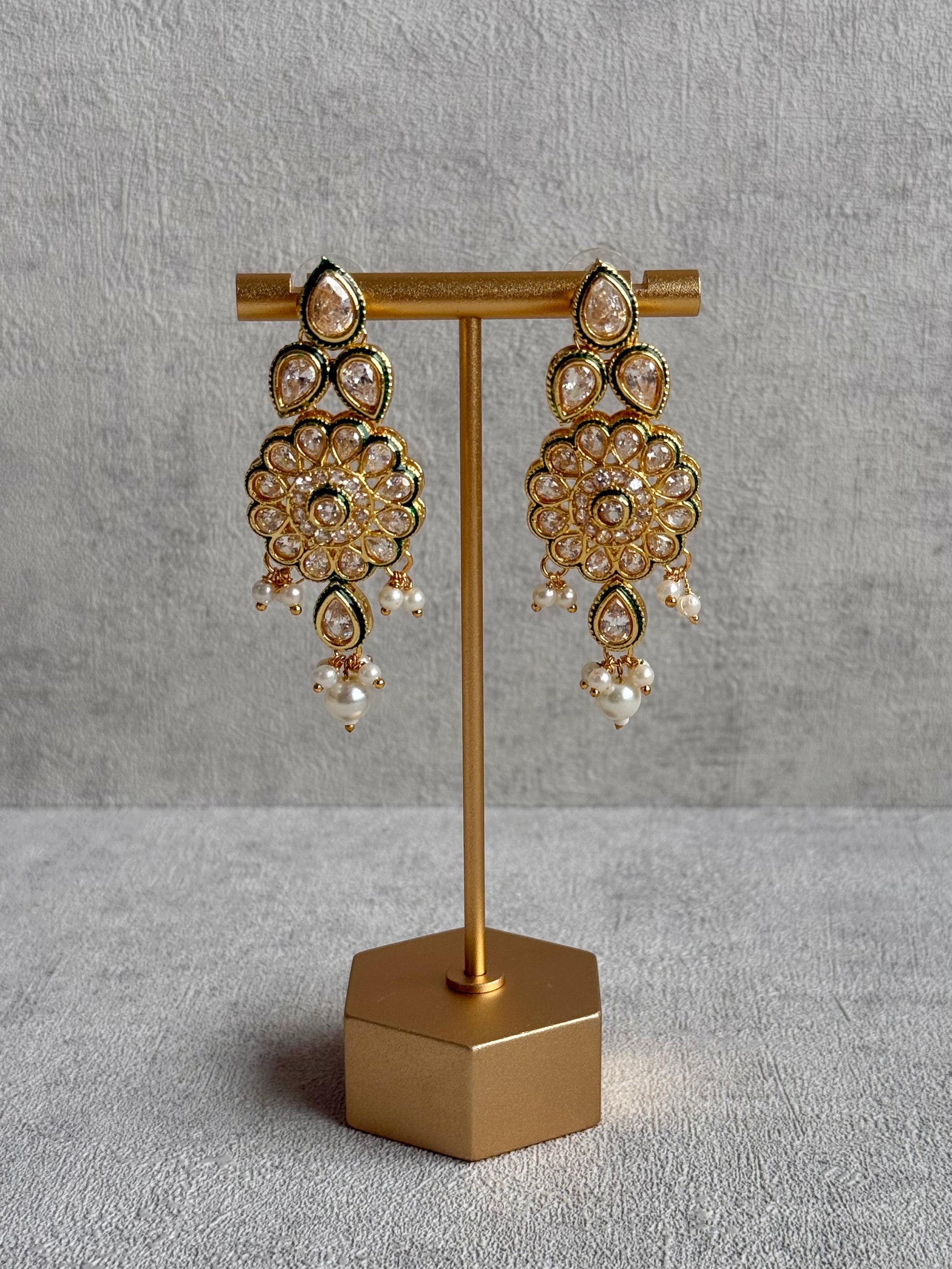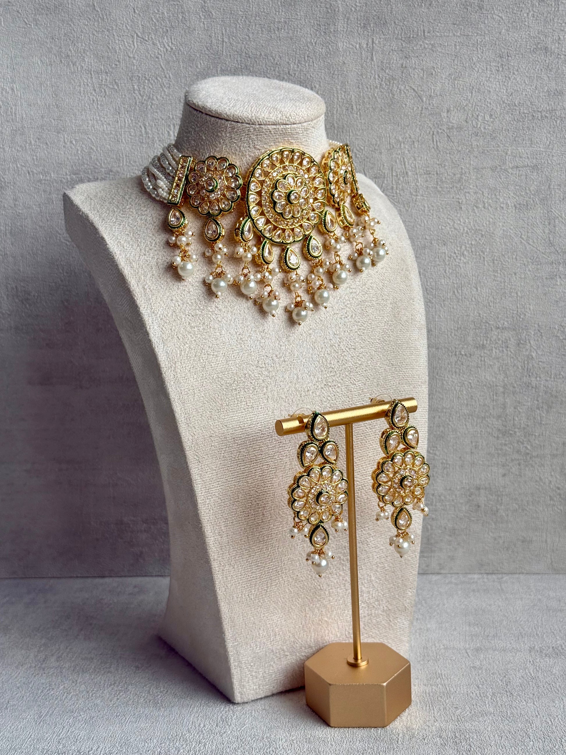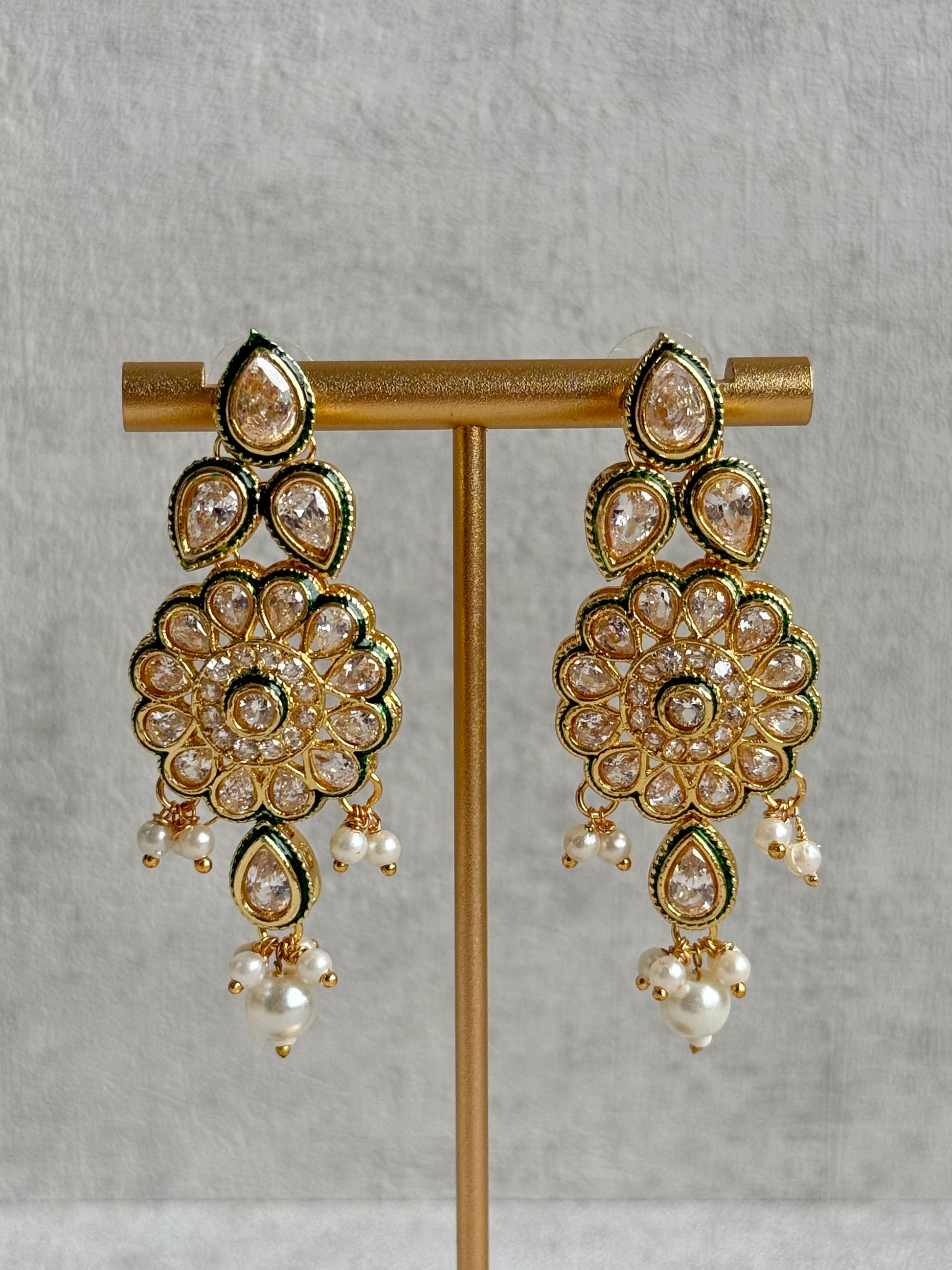 The accompanying earrings mirror the necklace’s intricate detailing — each piece adorned with kundan stones, subtle green enamel accents, and a finishing touch of delicate pearls. Together, they form a set that speaks of luxury in its most graceful form.